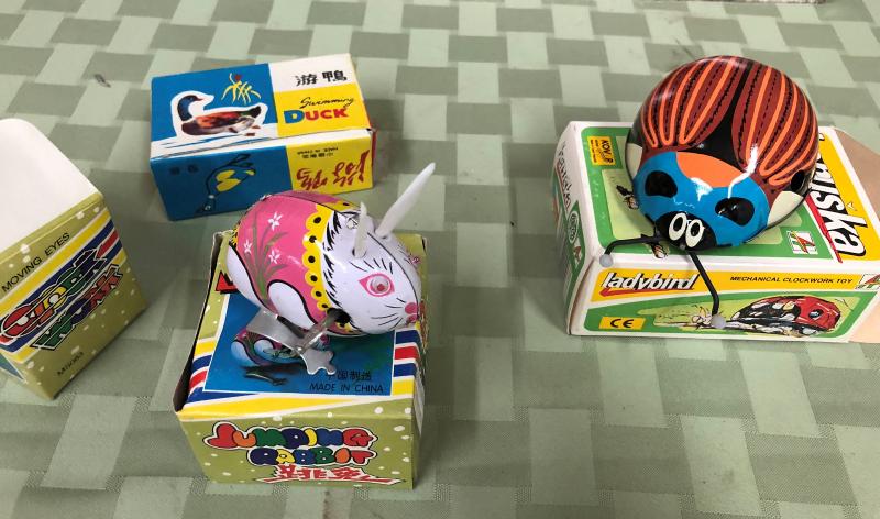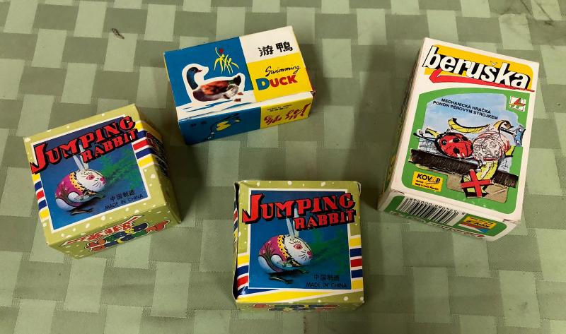 Here are four(4) mechanical tin litho toys..working and in the box..very good condition...