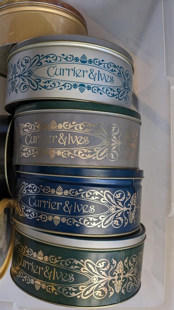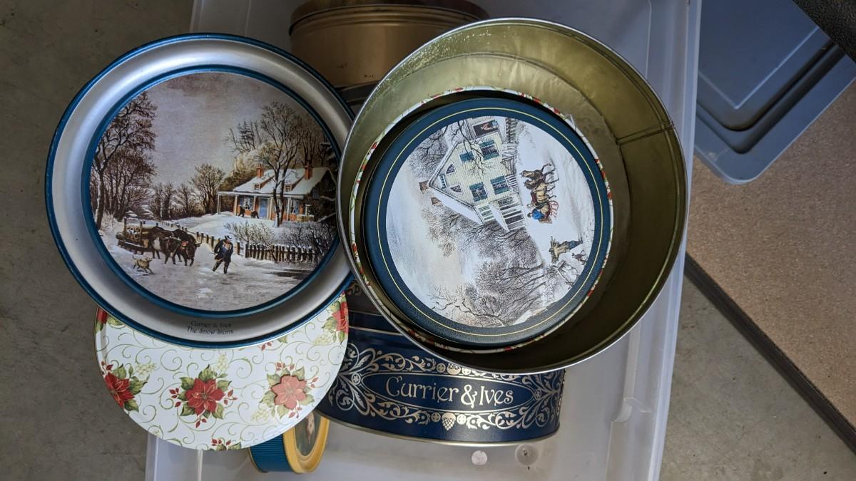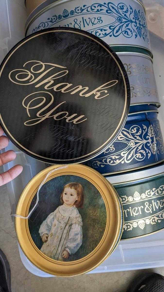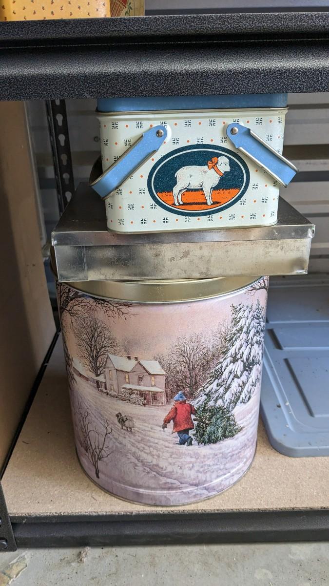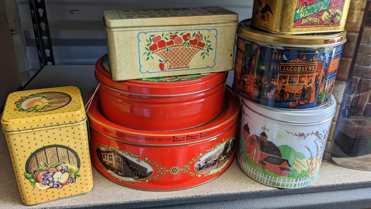 a great assortment of tin containers from varying decades. No shipping. 2604