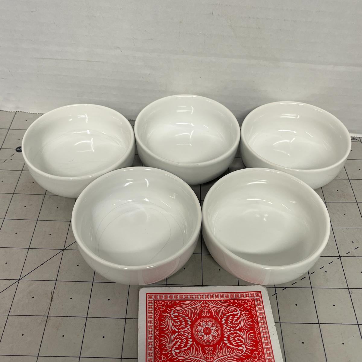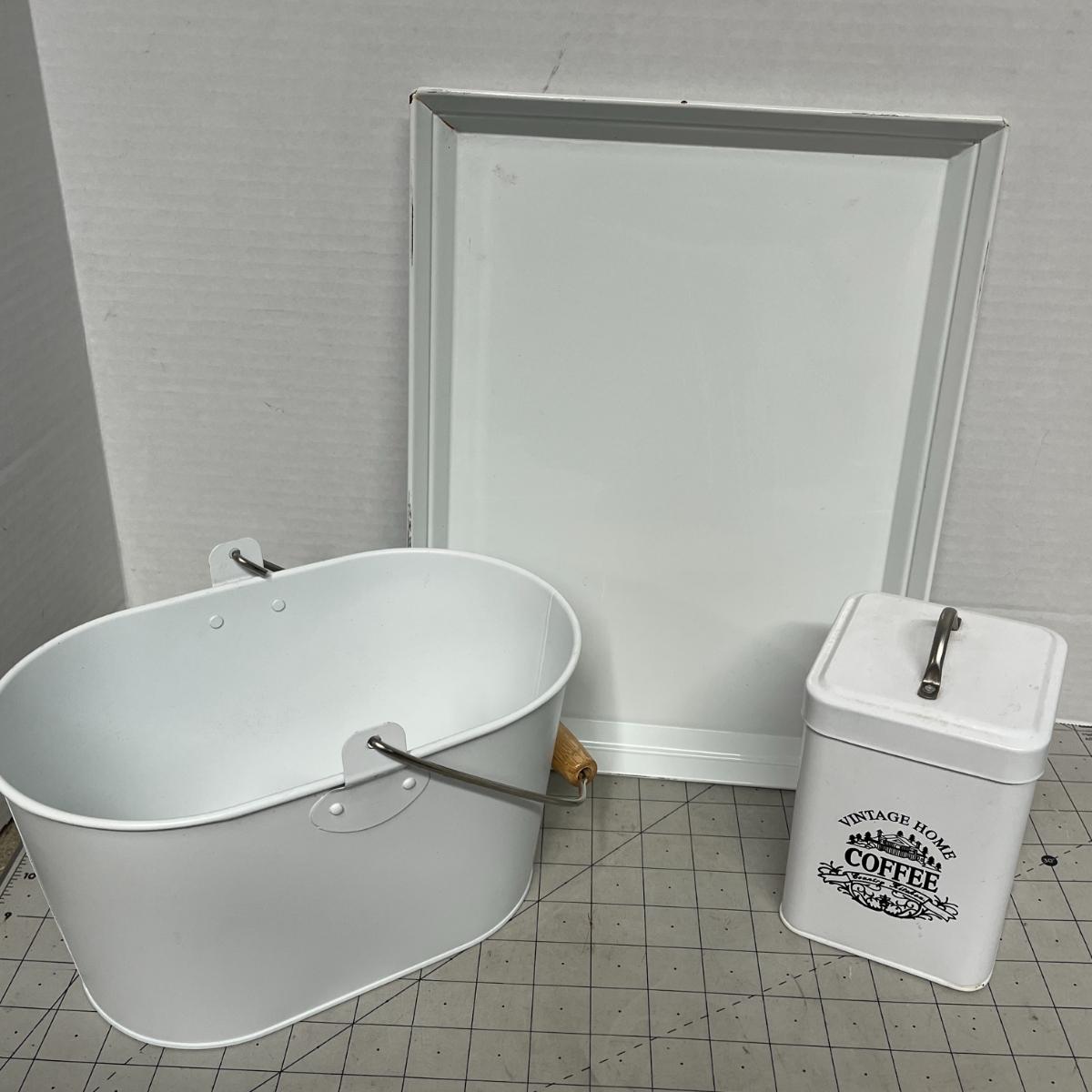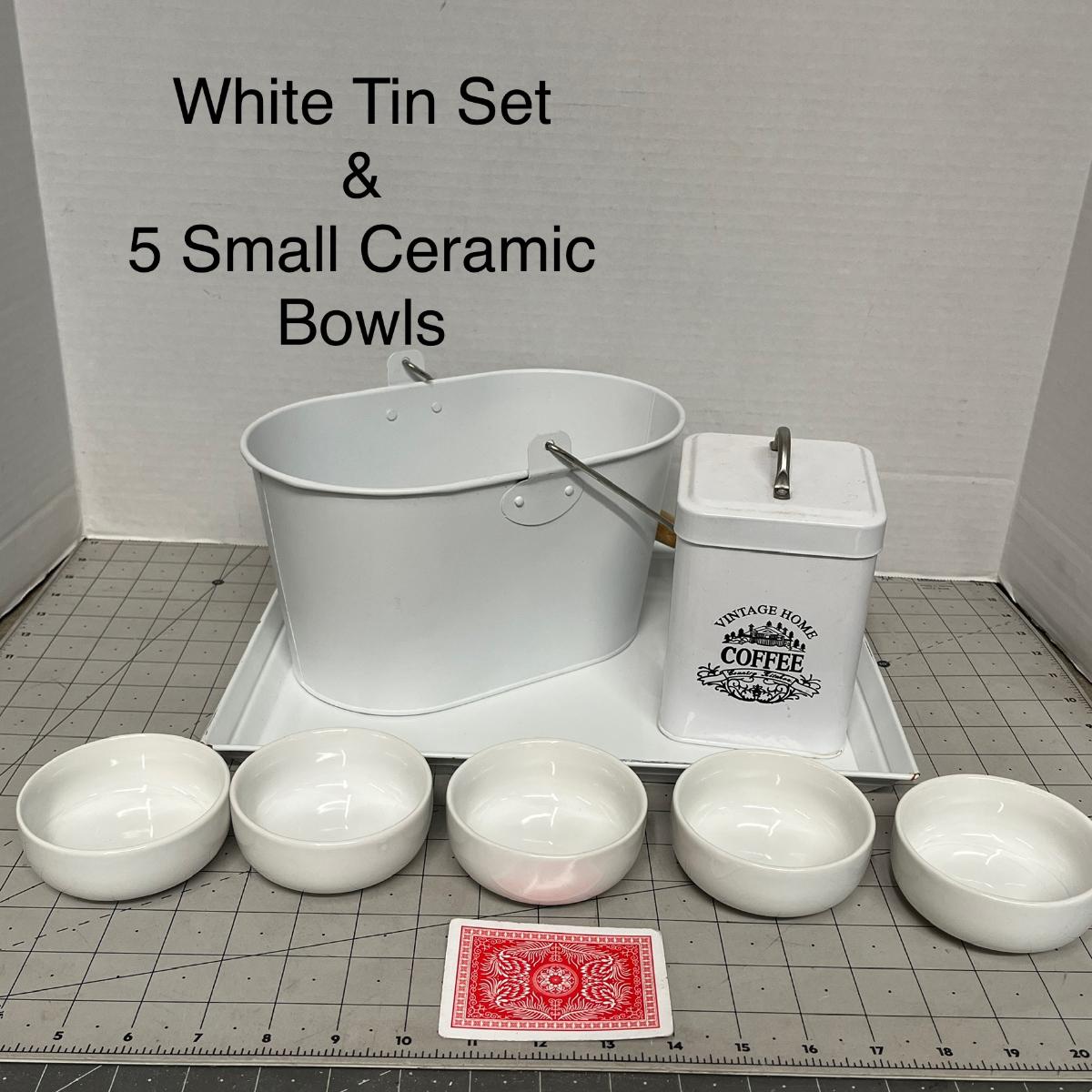 Includes coffee tin, bucket, five small Ceramic White Bowls.