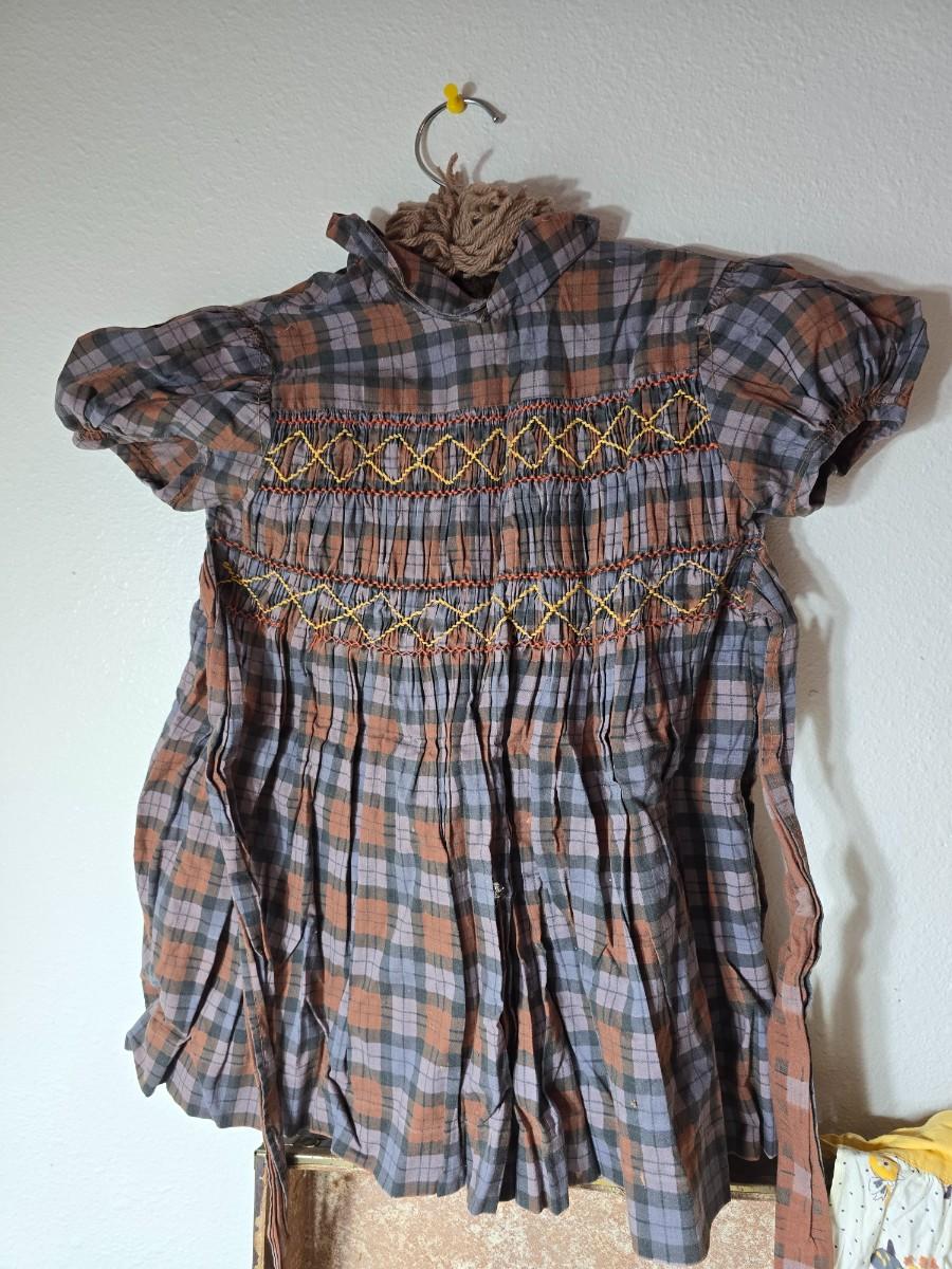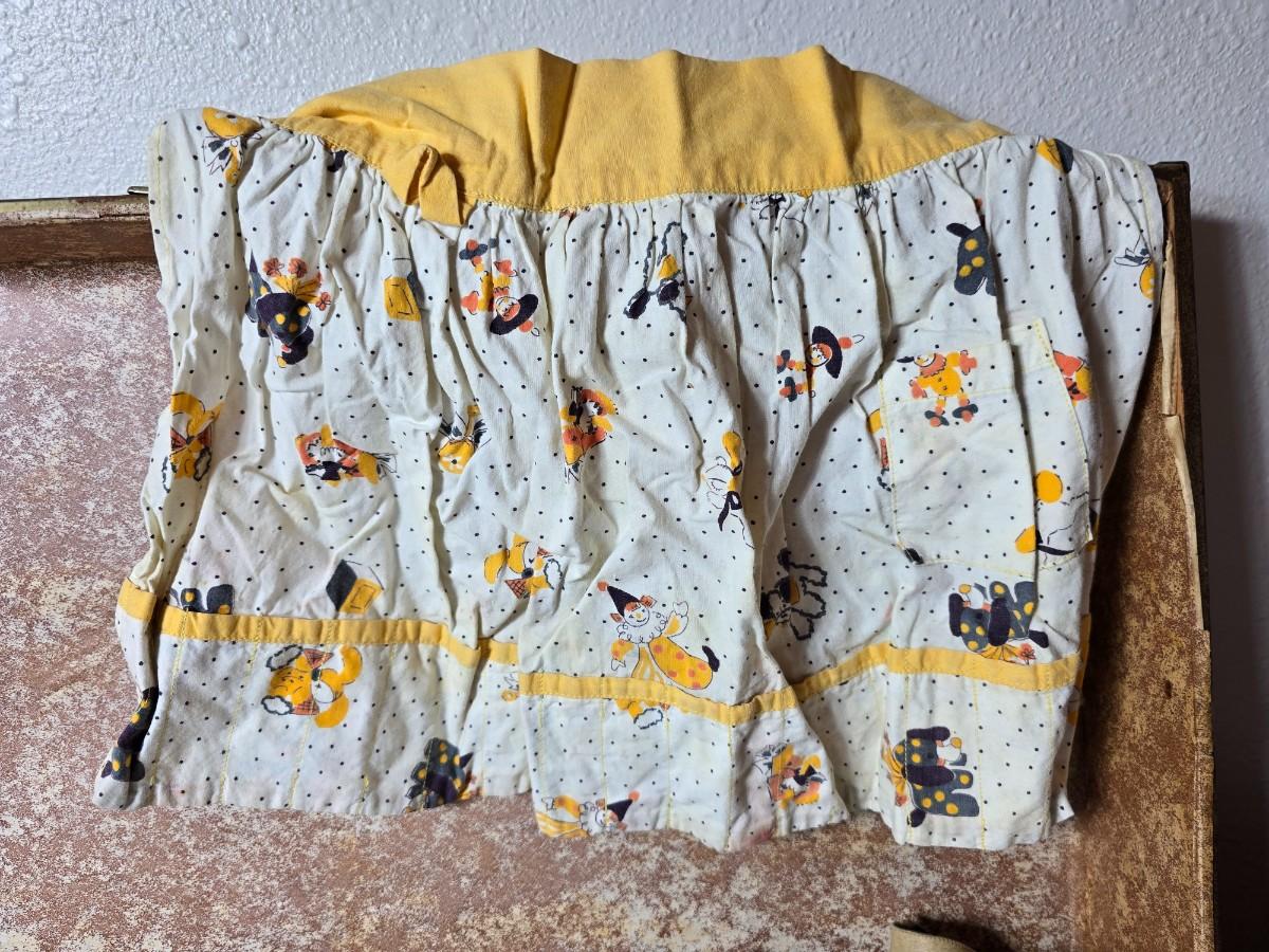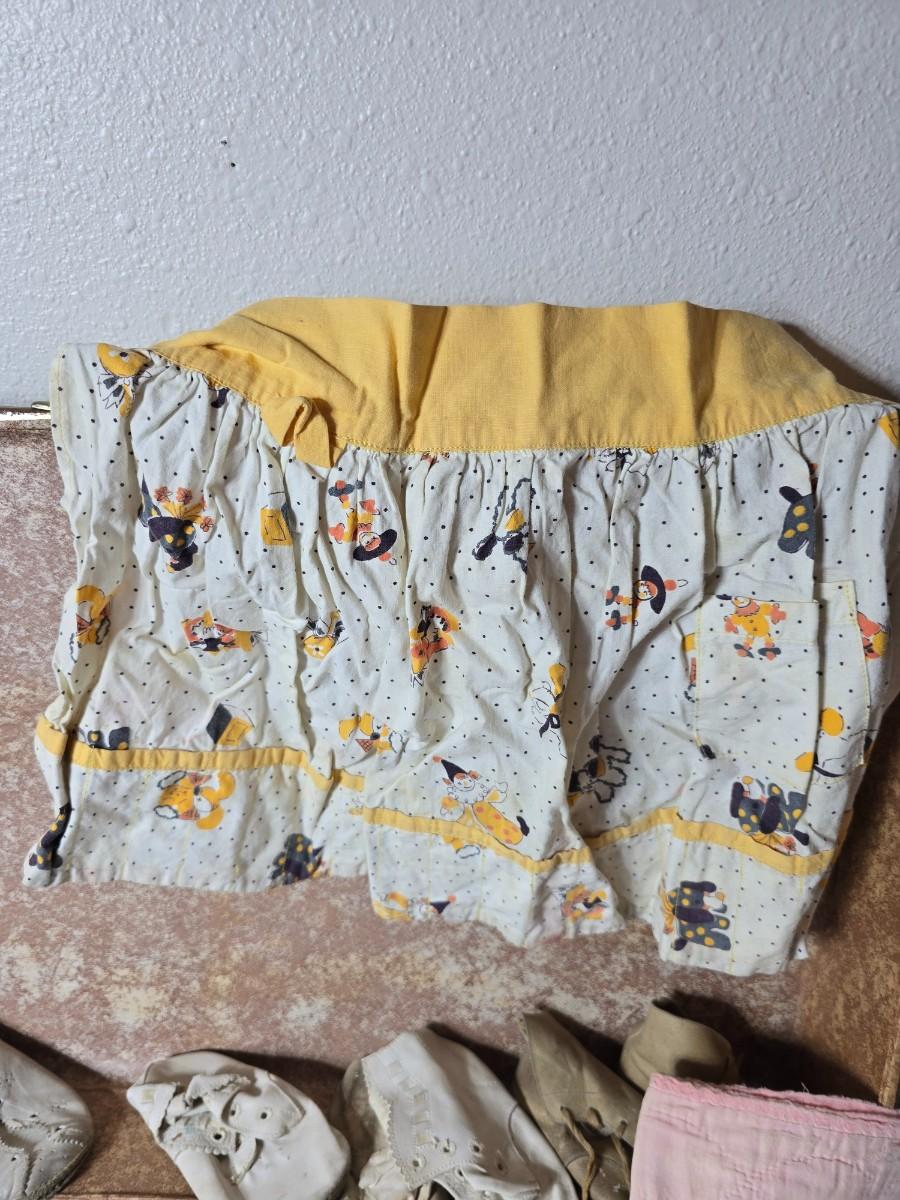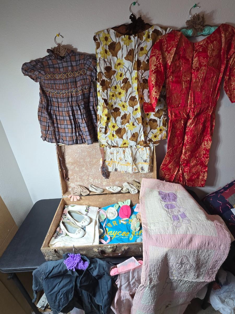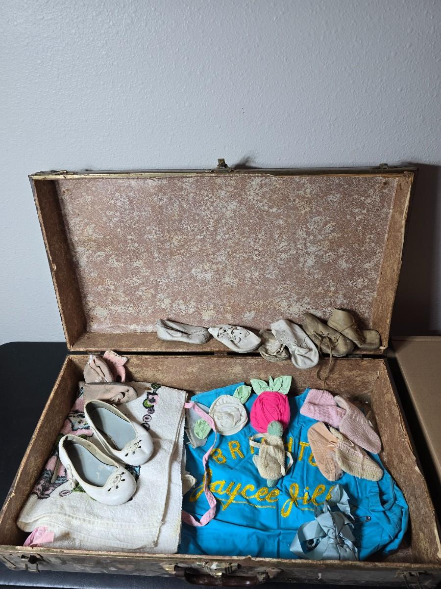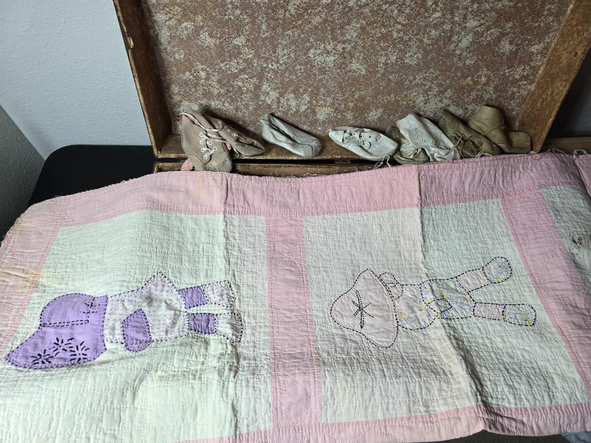 Tin sided luggage with an assortment of vintage children's clothes and baby quilt