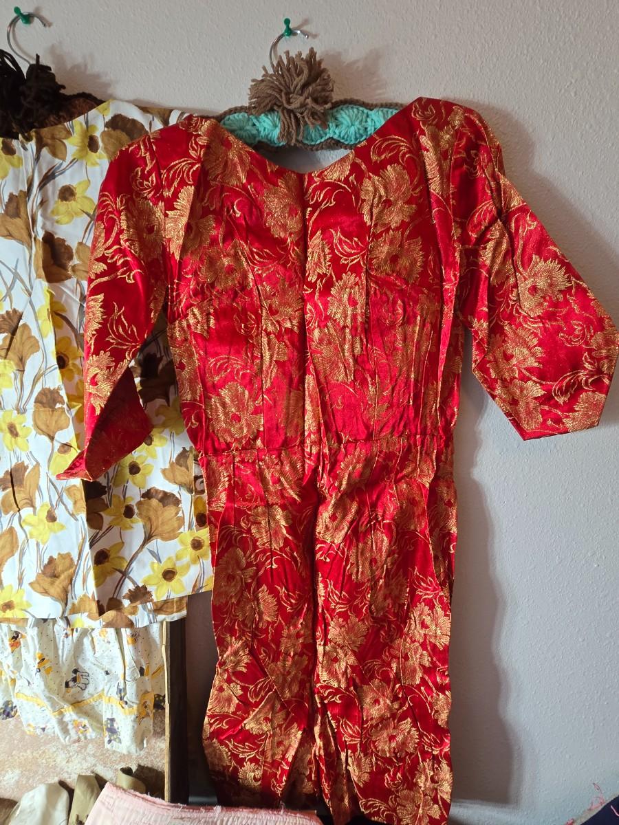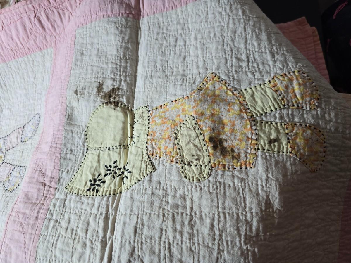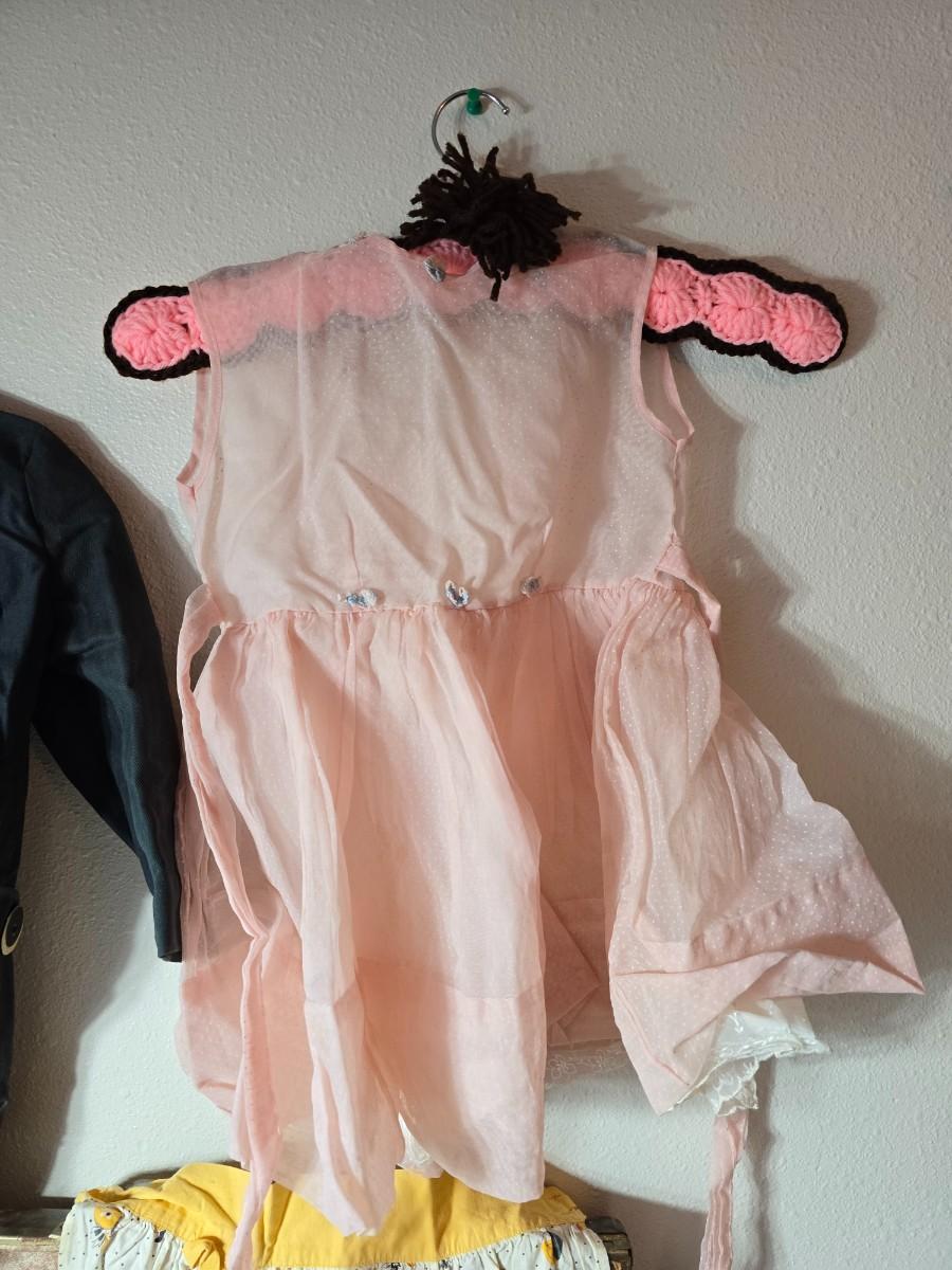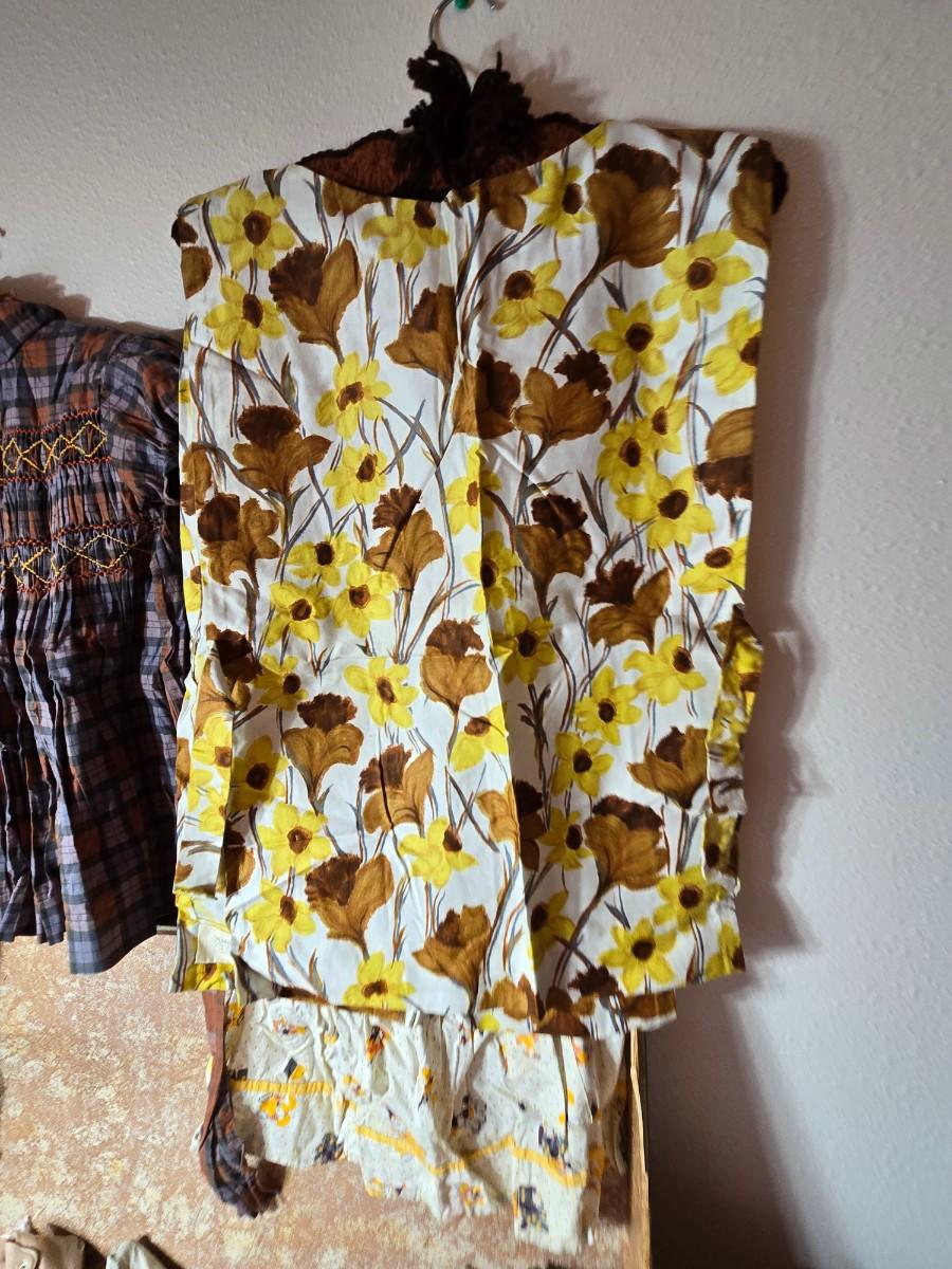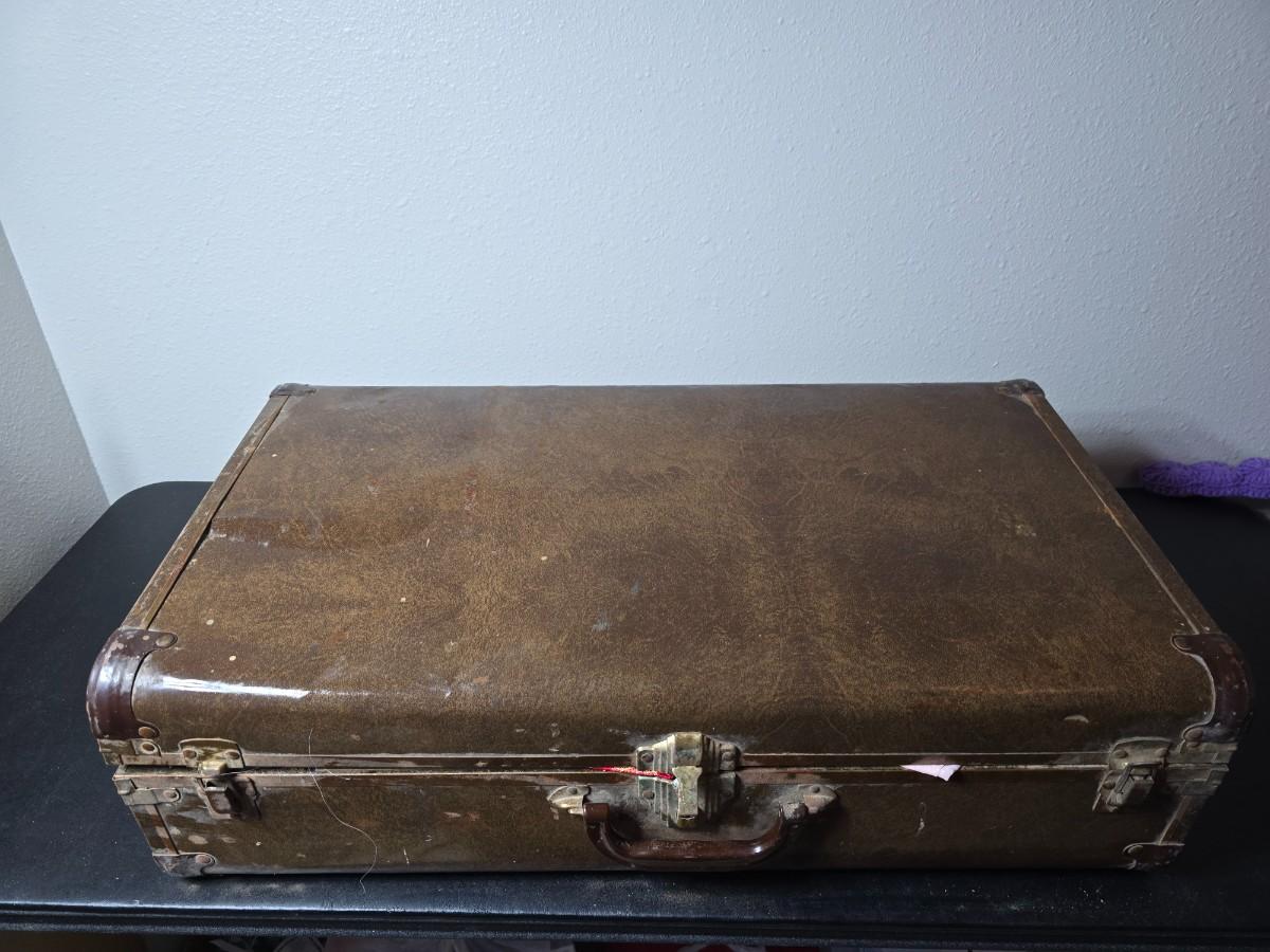 Tin sided luggage with an assortment of vintage children's clothes and baby quilt