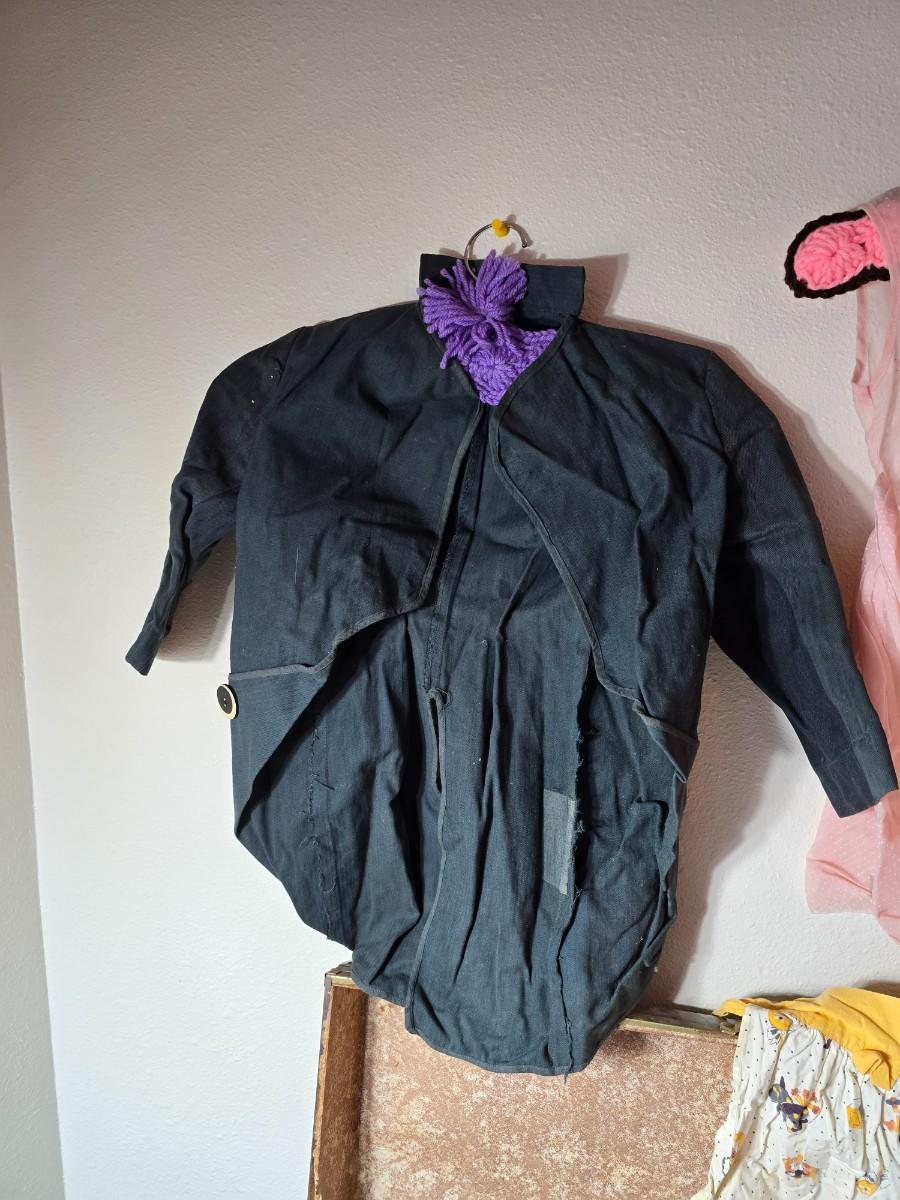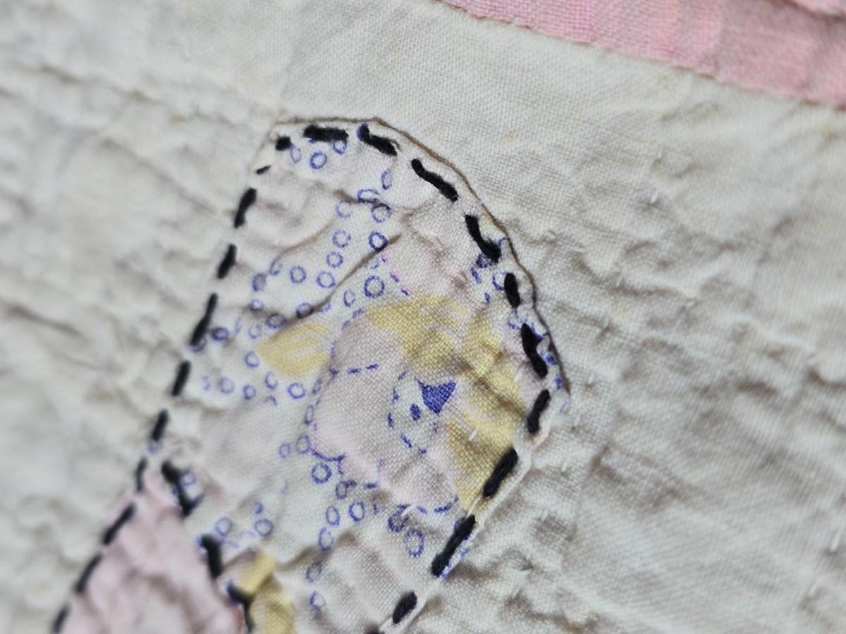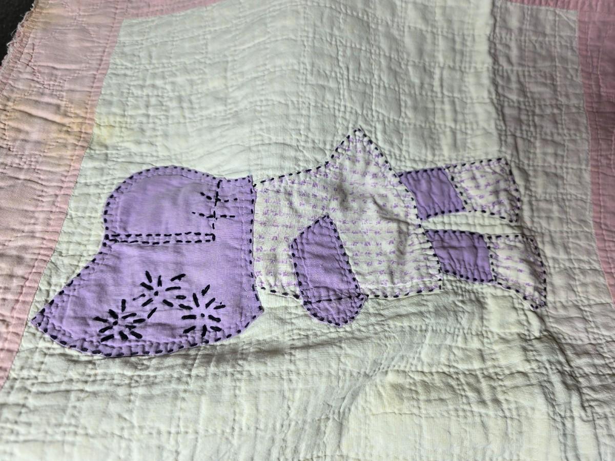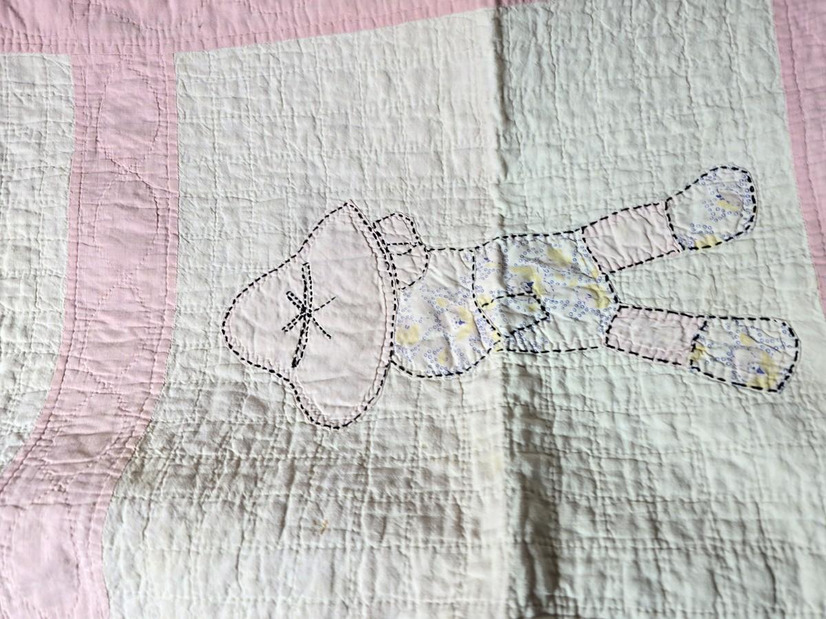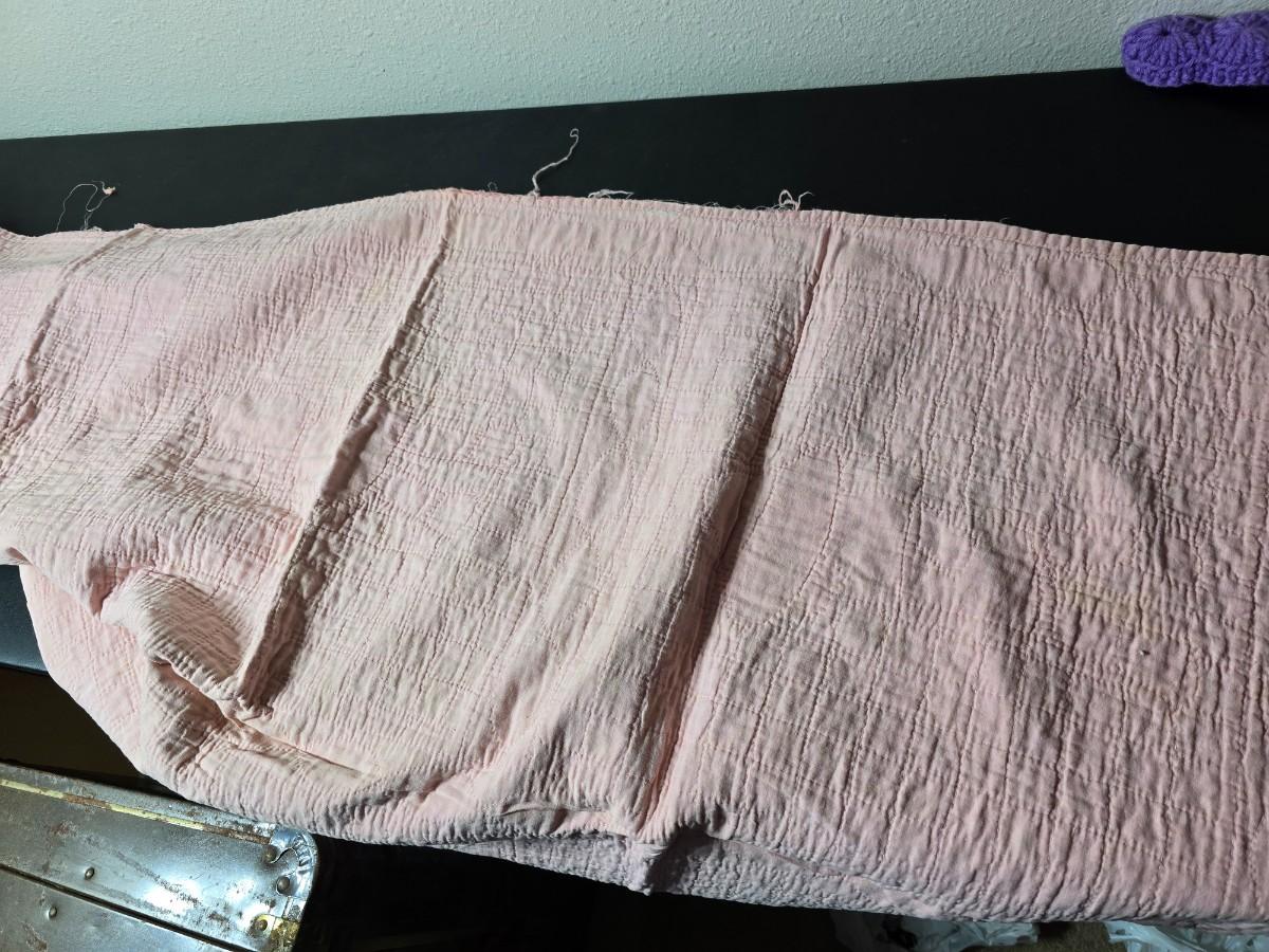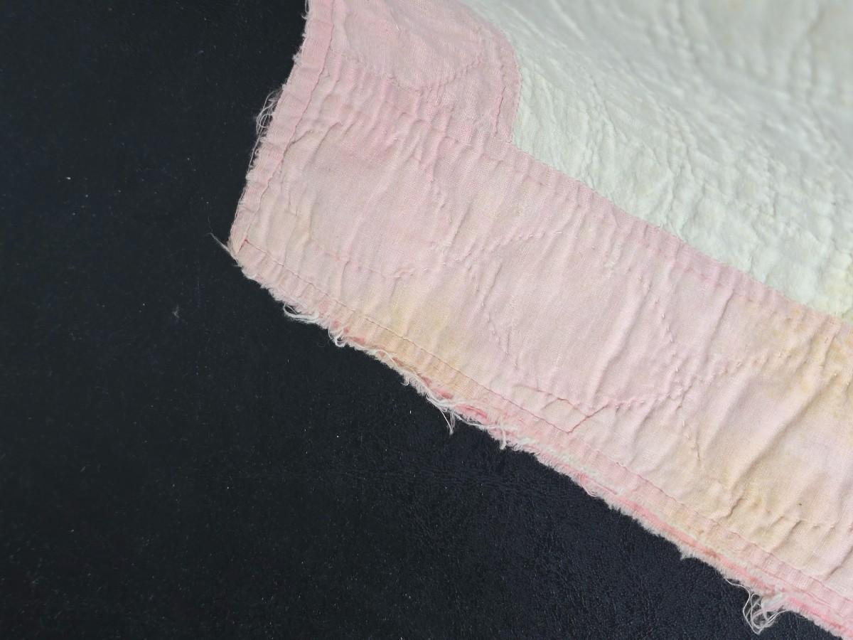 Tin sided luggage with an assortment of vintage children's clothes and baby quilt