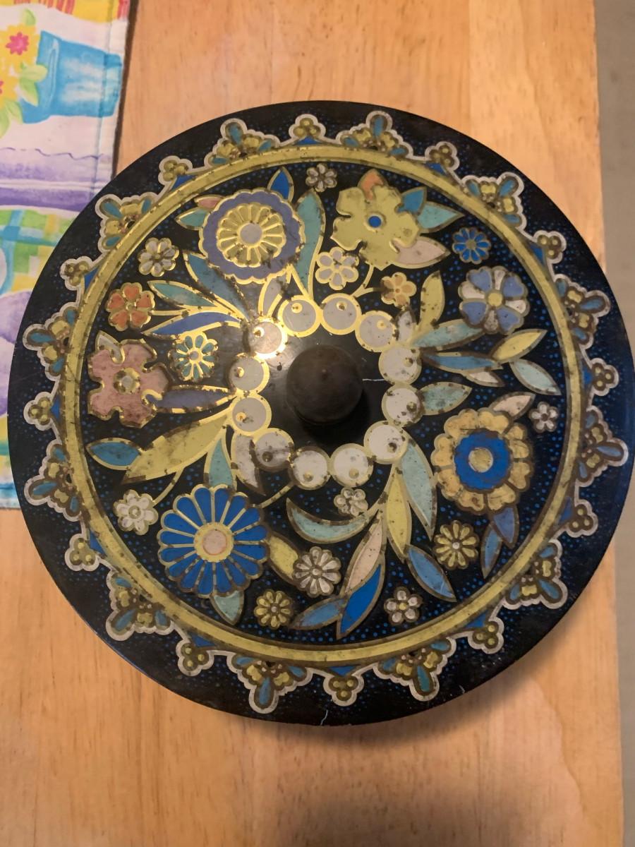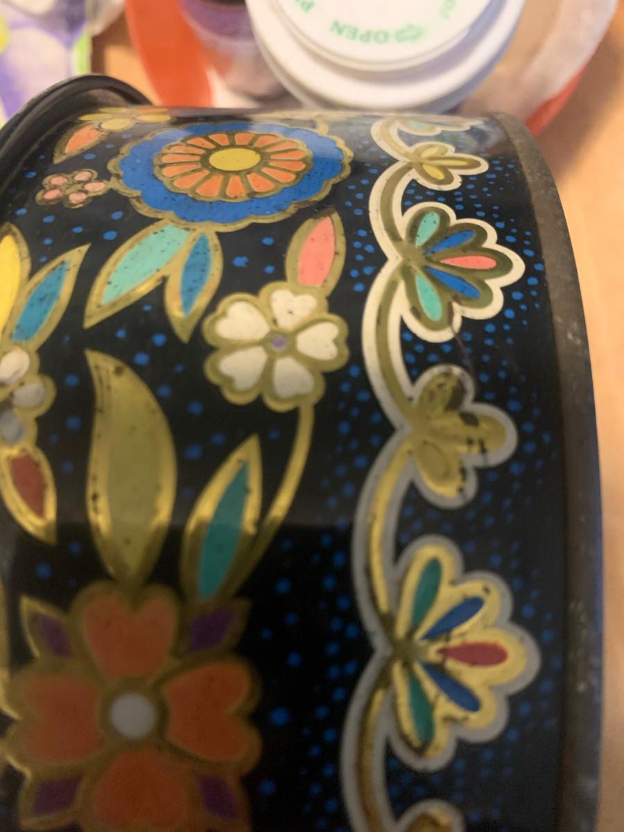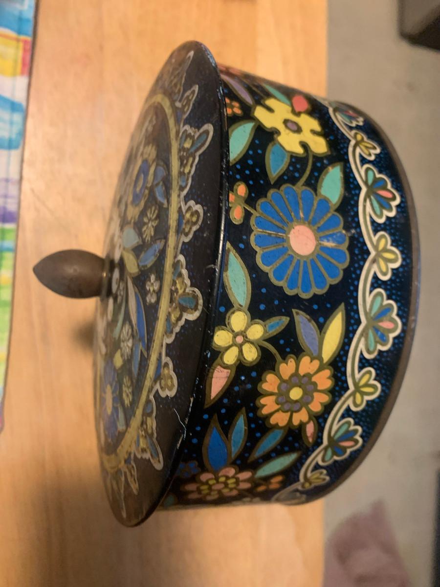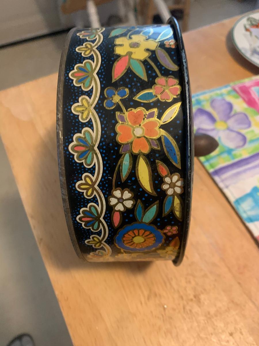 tin w enameled inlays , says England on bottom, Vintage Rare 1950's Daher England floral tin w lid. Floral pattern is in beautiful, bold hand painted enamel in bright colors on a black background, with gold detailing. The lid has colors, blue, pink, green, yellow with a brass toned knob. The interior of the can does show a little age, but minimal, overall, in really great condition. It's a nice weight tin.