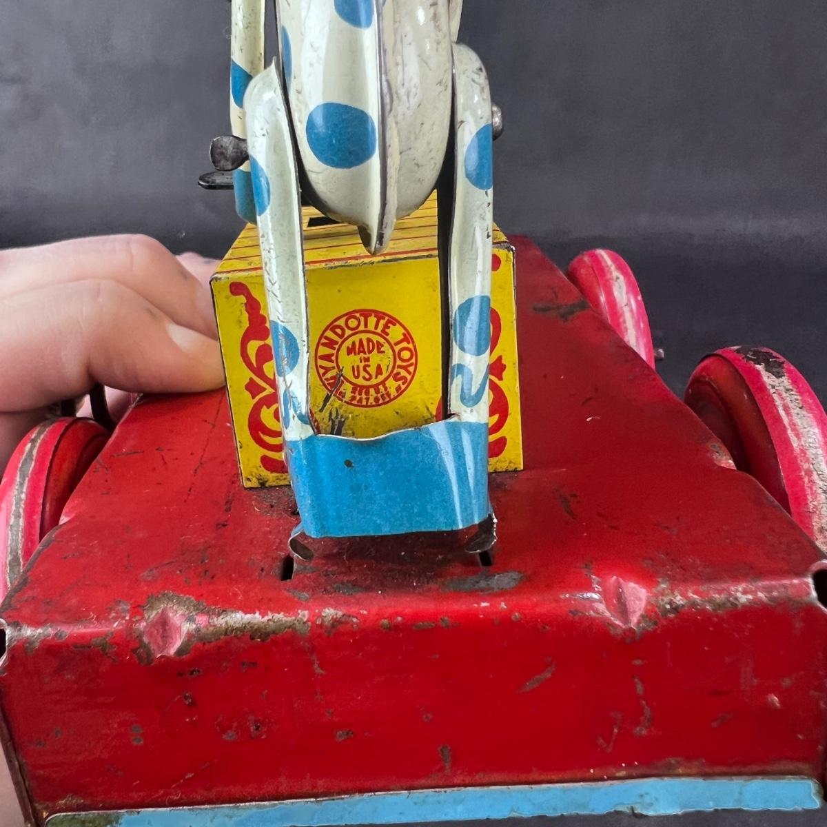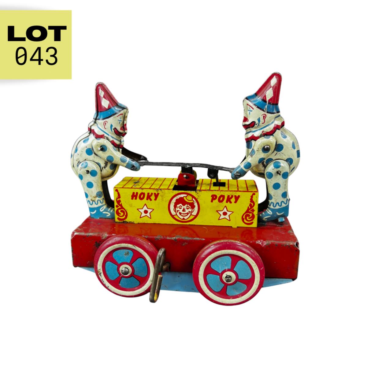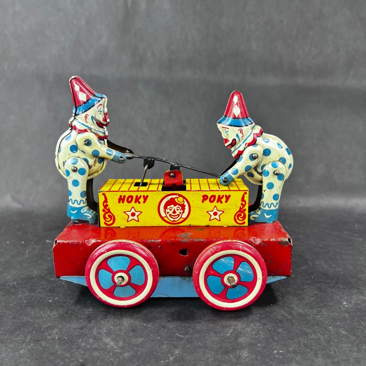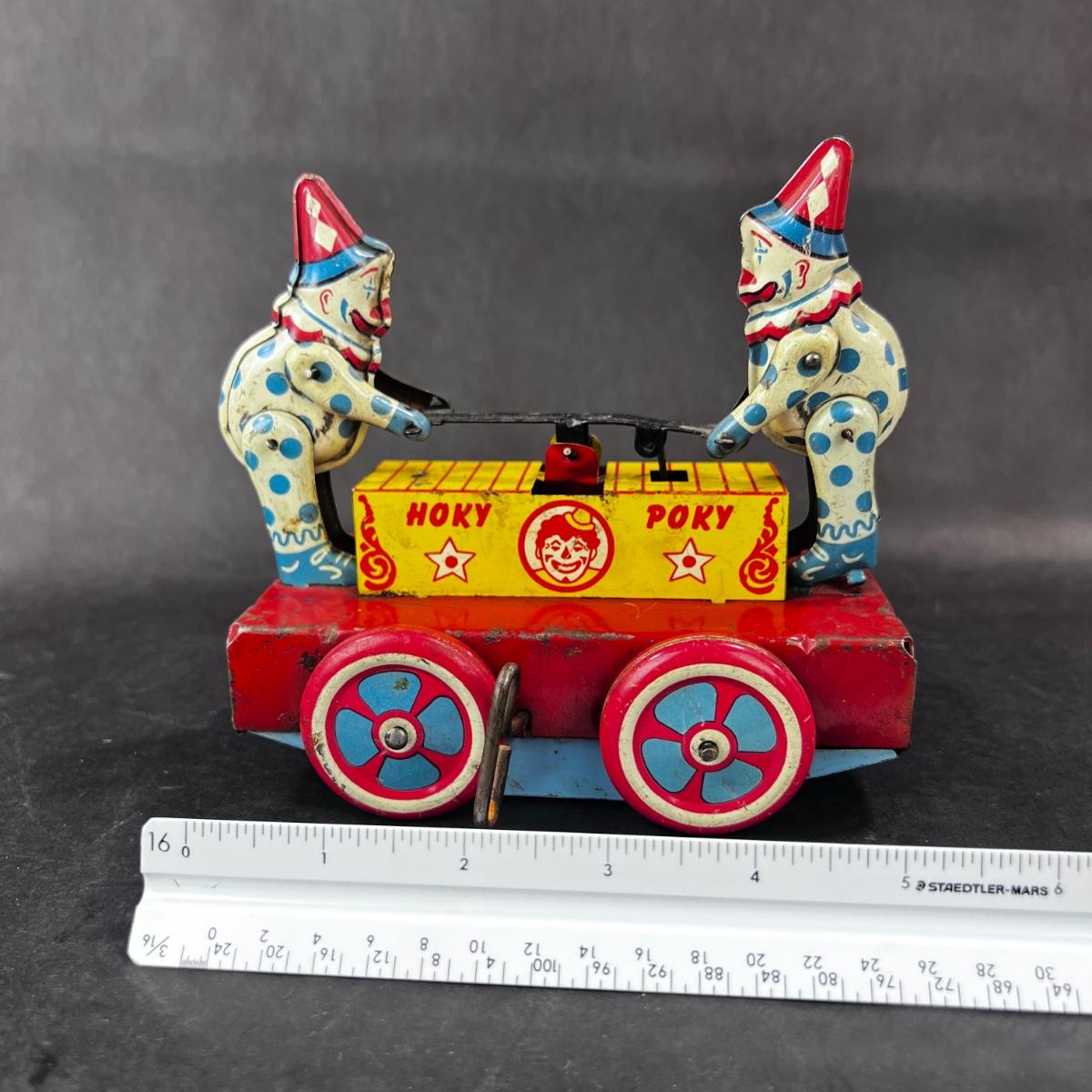 A pair of clowns will happily scoot their way across the floor and into your heart. Produced in the 1940s by Wyandotte toys. **Works, Video of Function on YouTube Video, Has Key** Please see photos for details and condition. **|** ::: Shipping is available on this lot. If you require shipping you must let us know at the close of the auction. We will coordinate with you after the item has been won. Shipping fees will include insurance up to or exceeding the value of all items being mailed. If you have any questions regarding this lot please contact the auctioneer either via this website, by direct email or by phone. PICK UP TIMES and other important information can be found in the TERMS and DESCRIPTION of the auction. Please take a look for pertinent information. Thanks!
