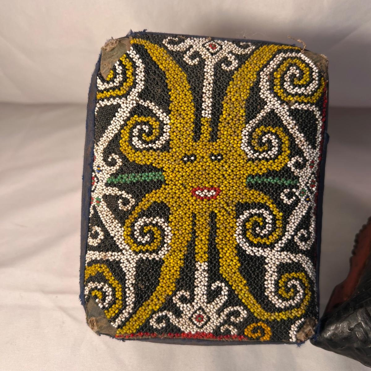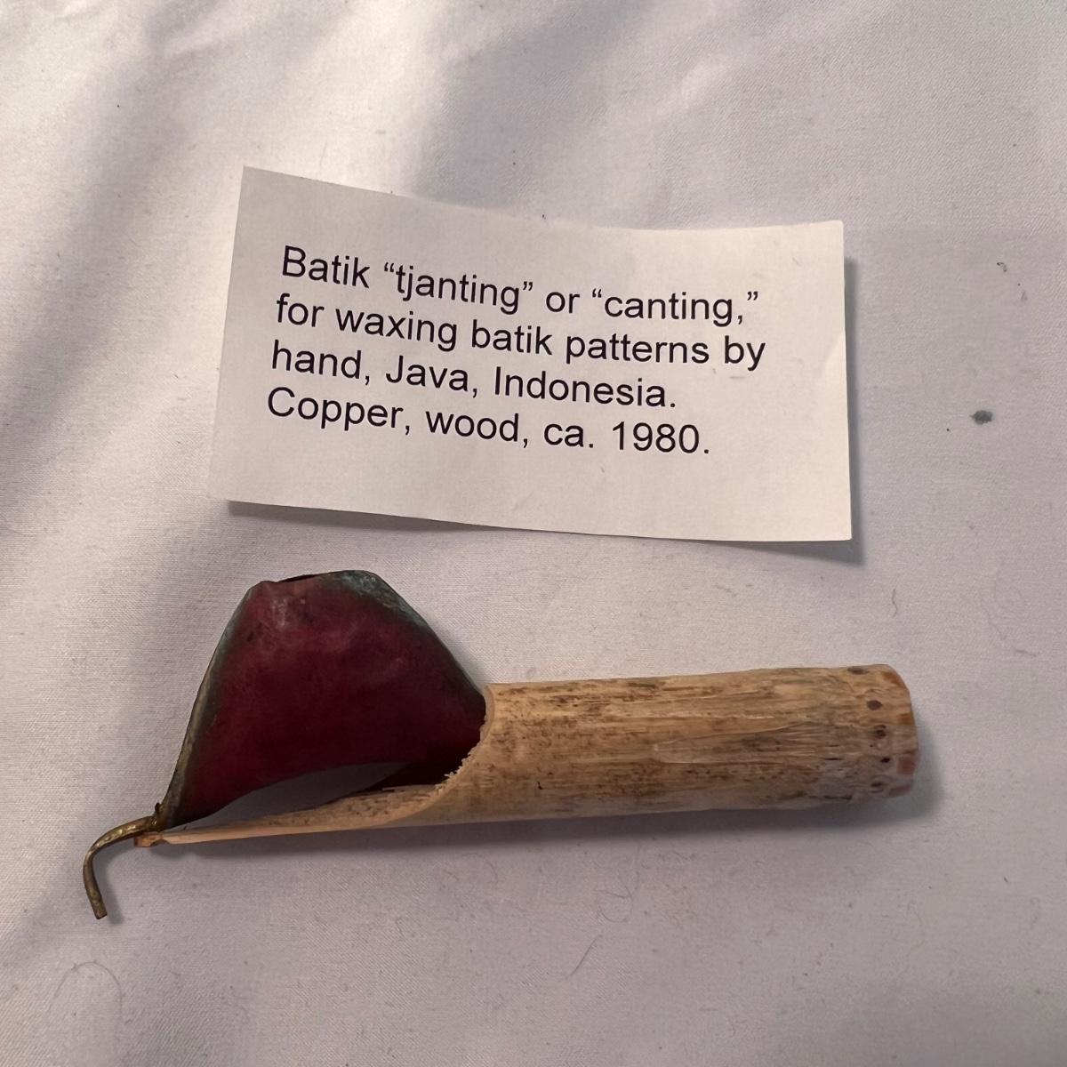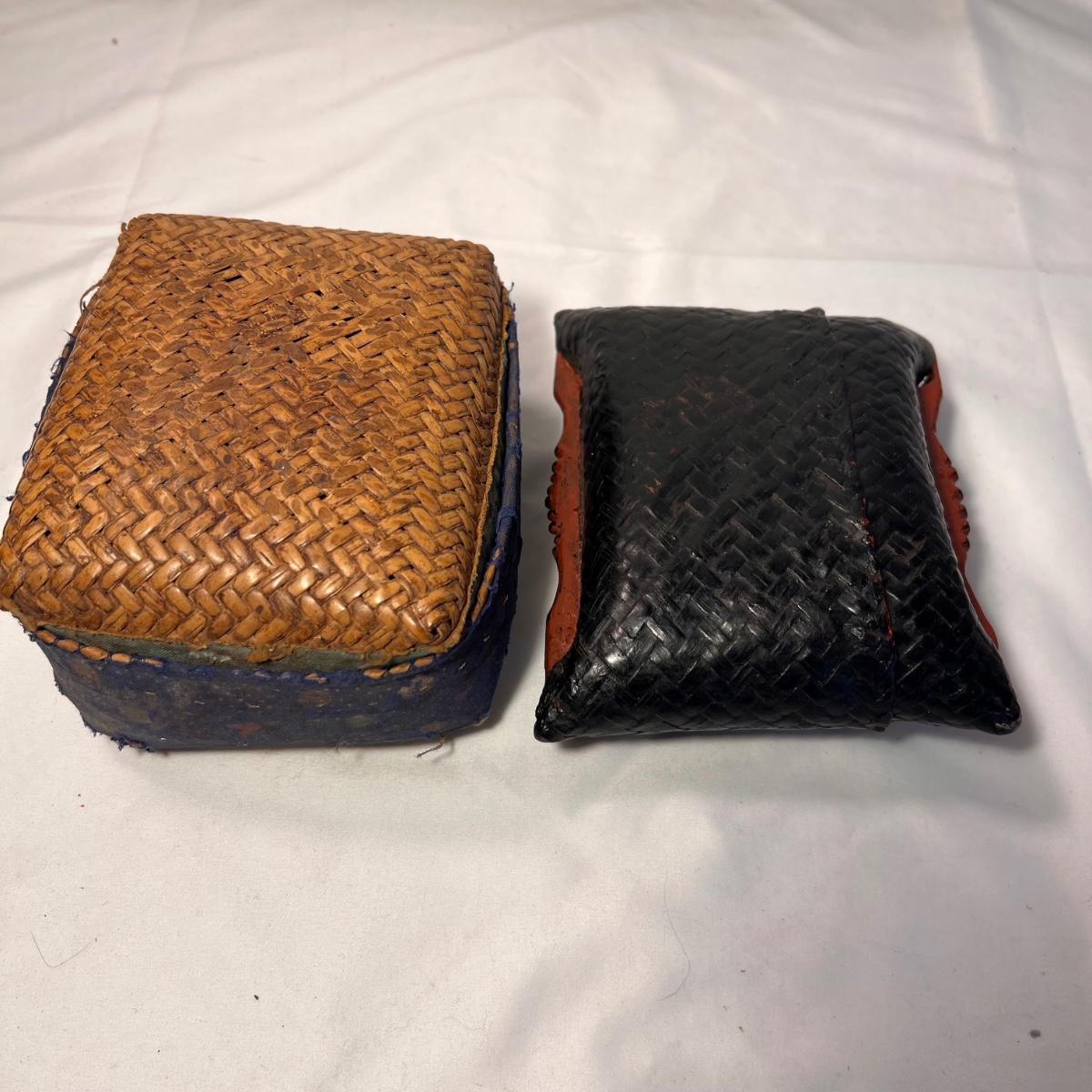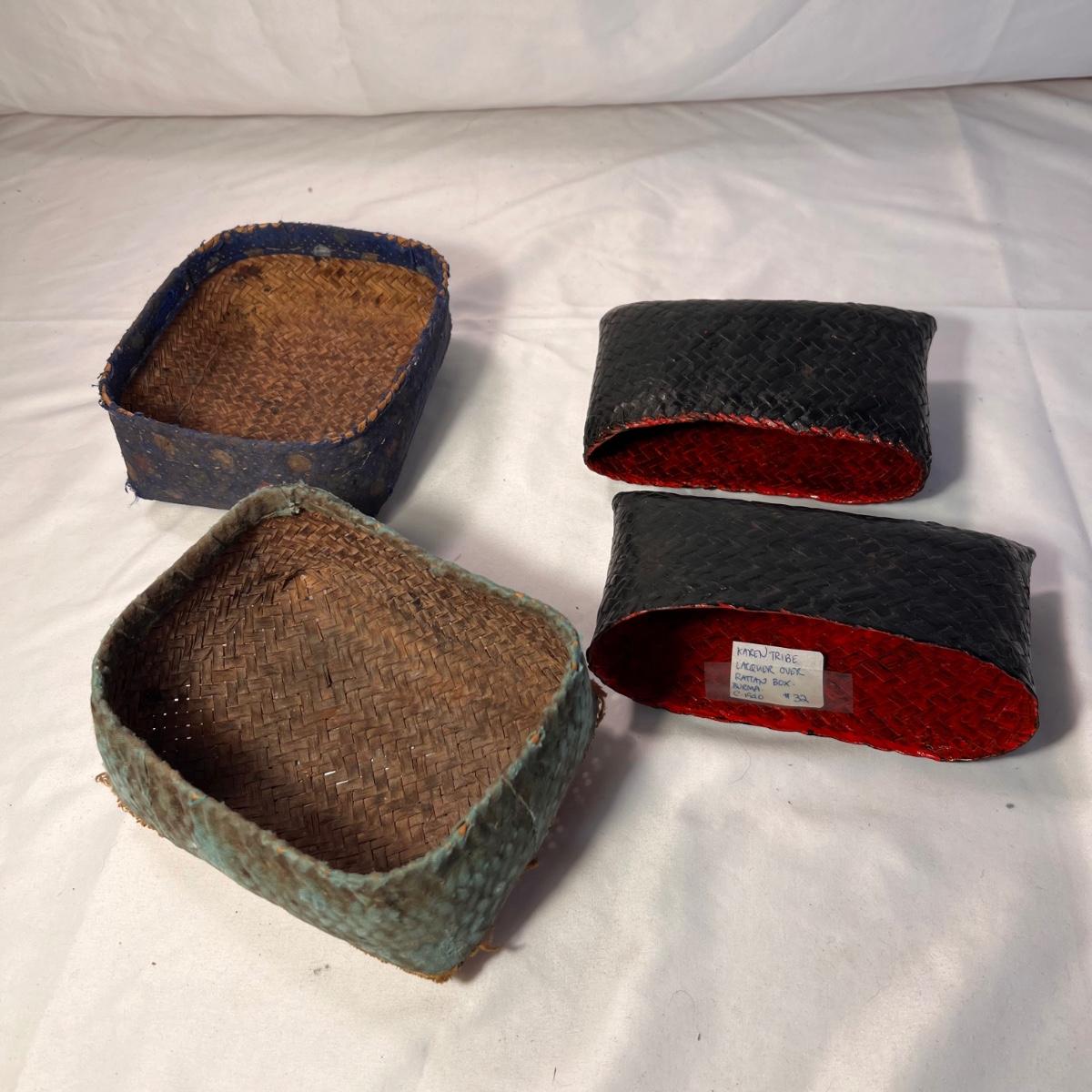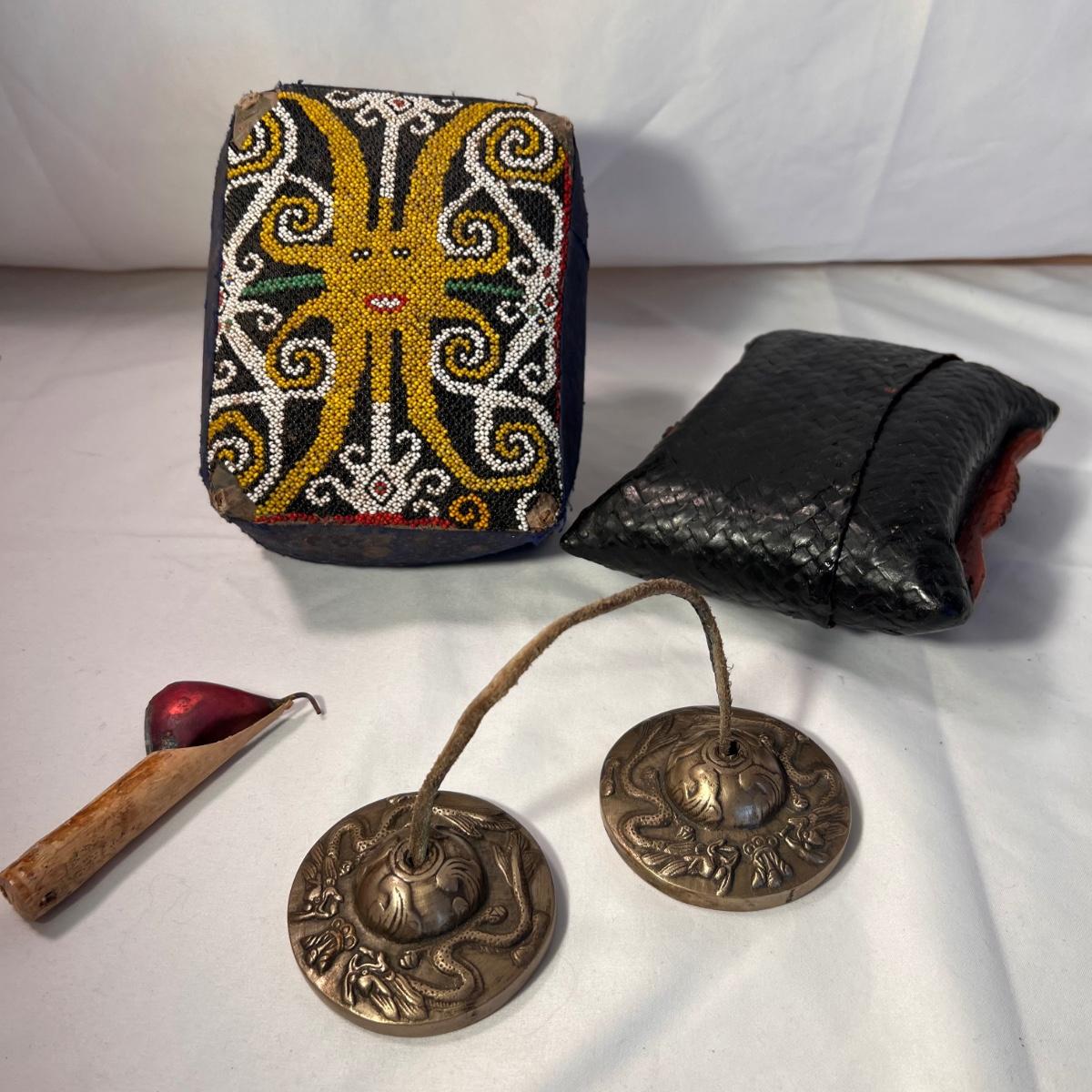 A wonderful assortment of collectibles likely from SE Asia. Two rattan boxes, larger box has a beaded top with yellow, black and white beads (note that the corners have some minor wear, see pic) which measures 6” x 5” x 3”H. The Tingsha bells are metal and make a delightful sound. The Batik tool comes with a paper label with information.
