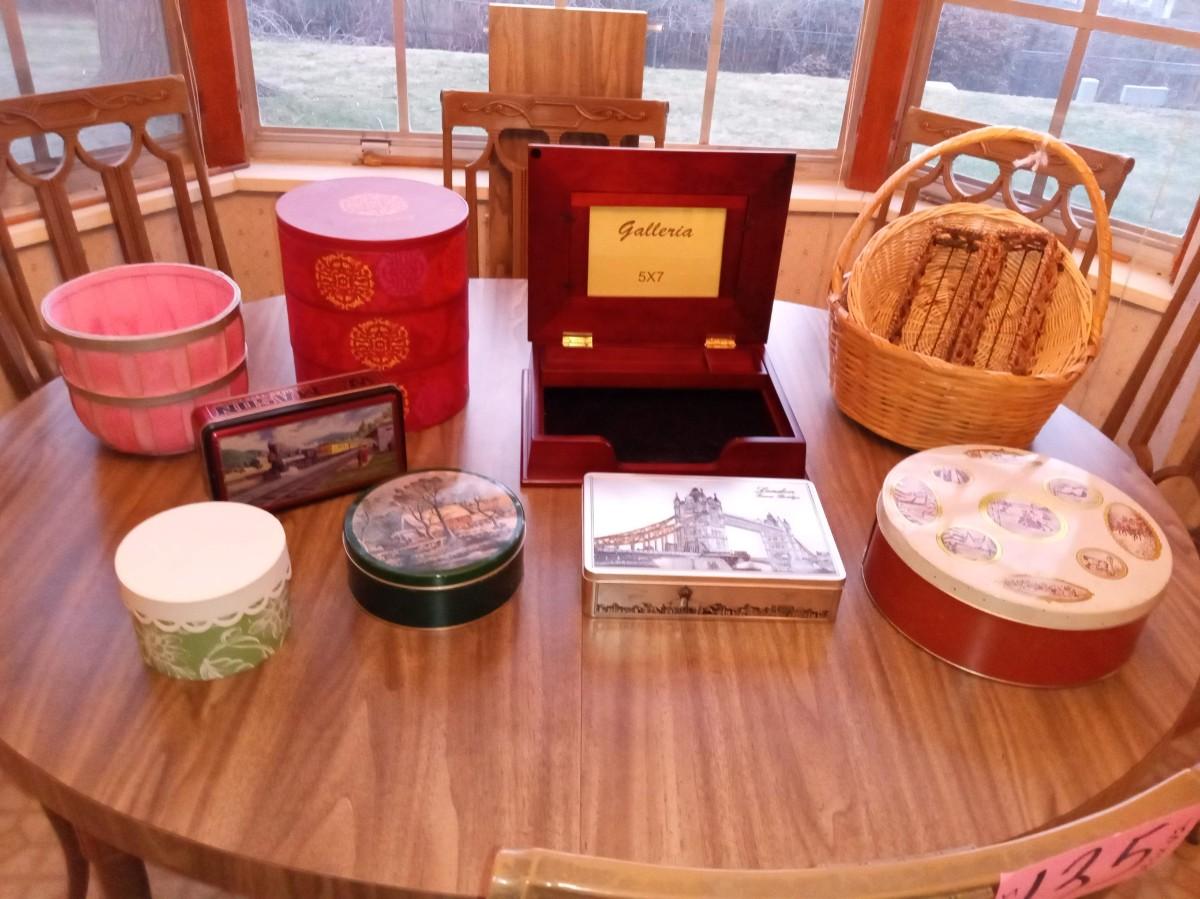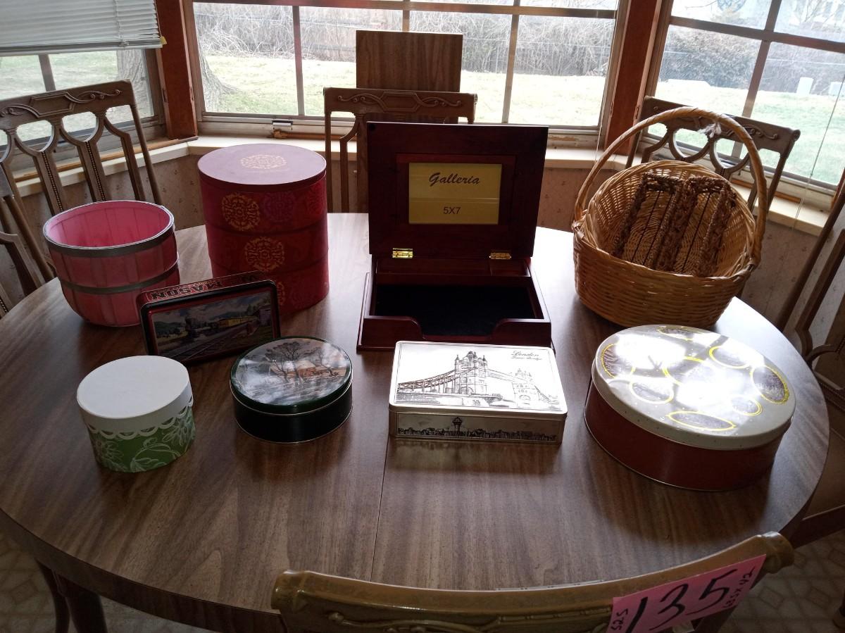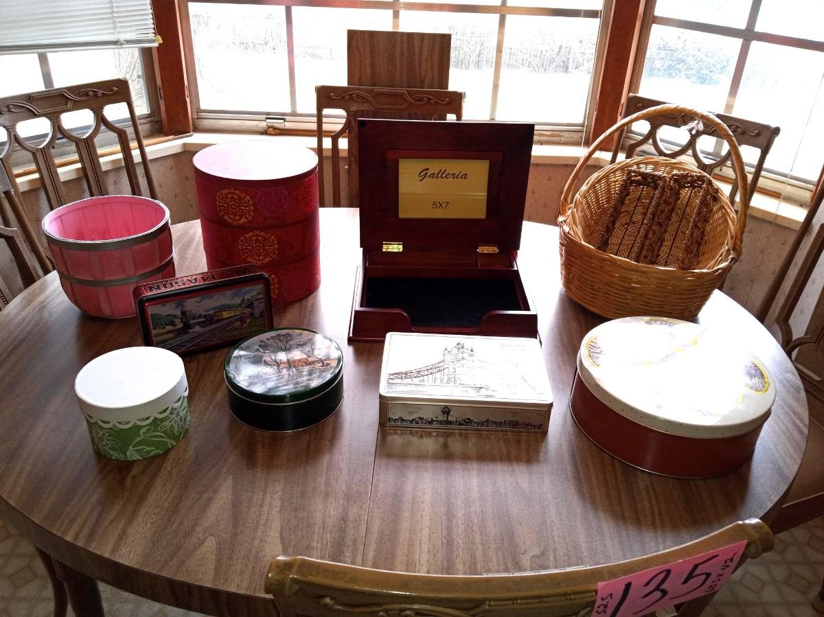 TINS, ROUND BOXES, BASKKETS AND A PHOTO BOX