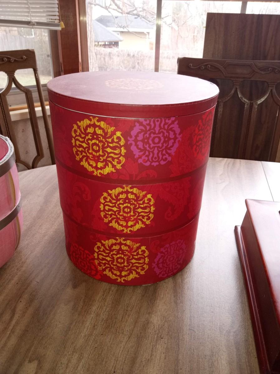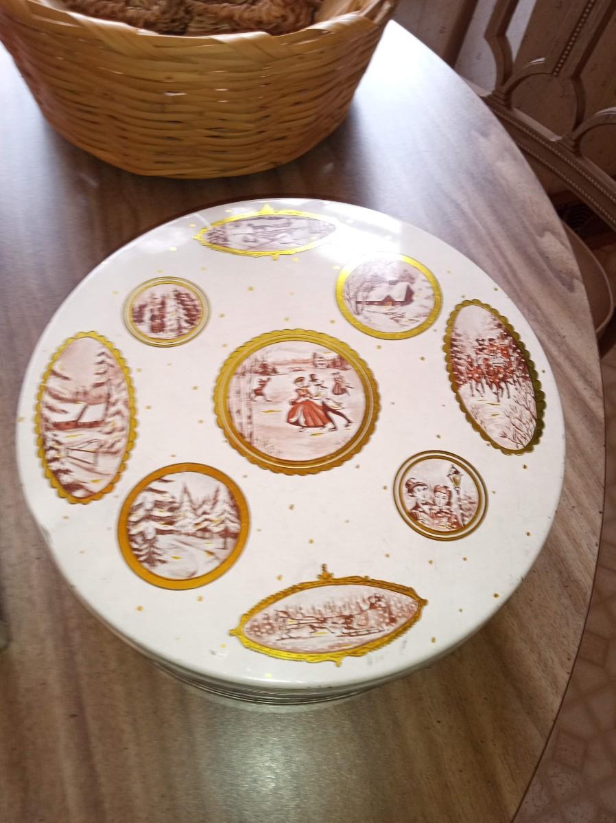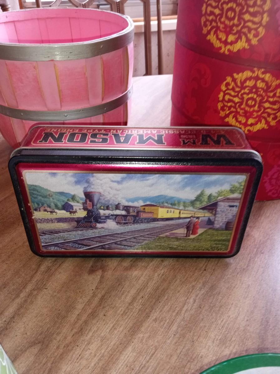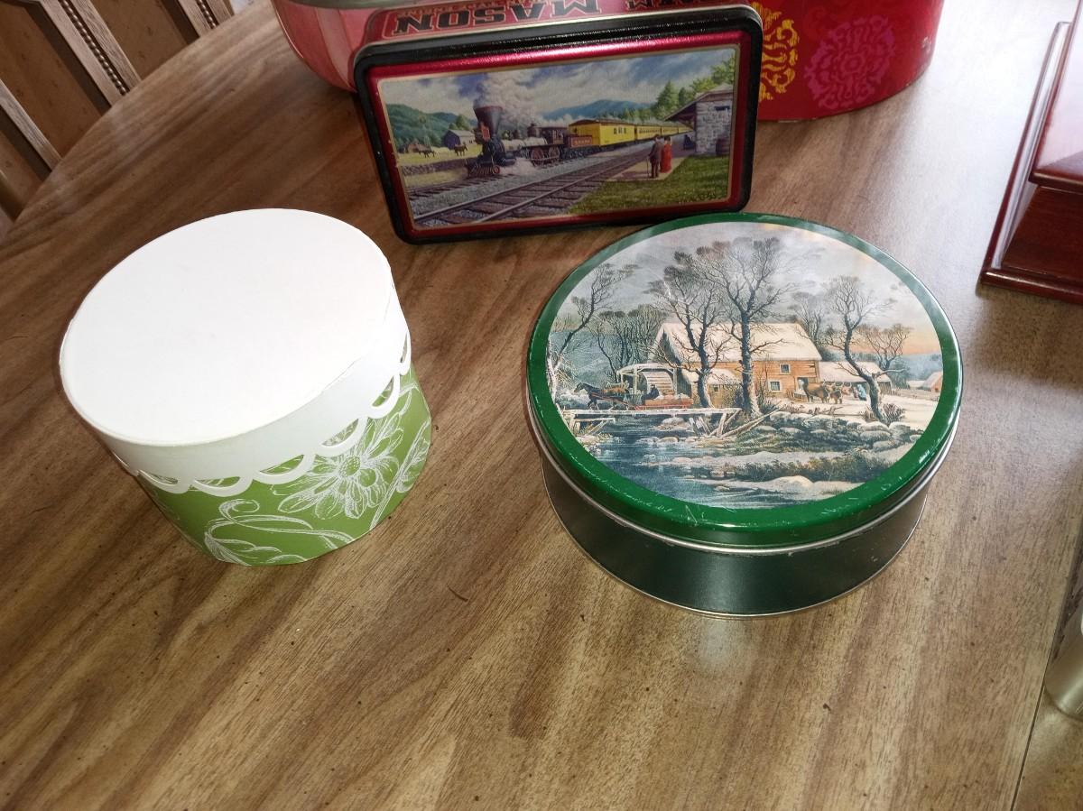 TINS, ROUND BOXES, BASKKETS AND A PHOTO BOX