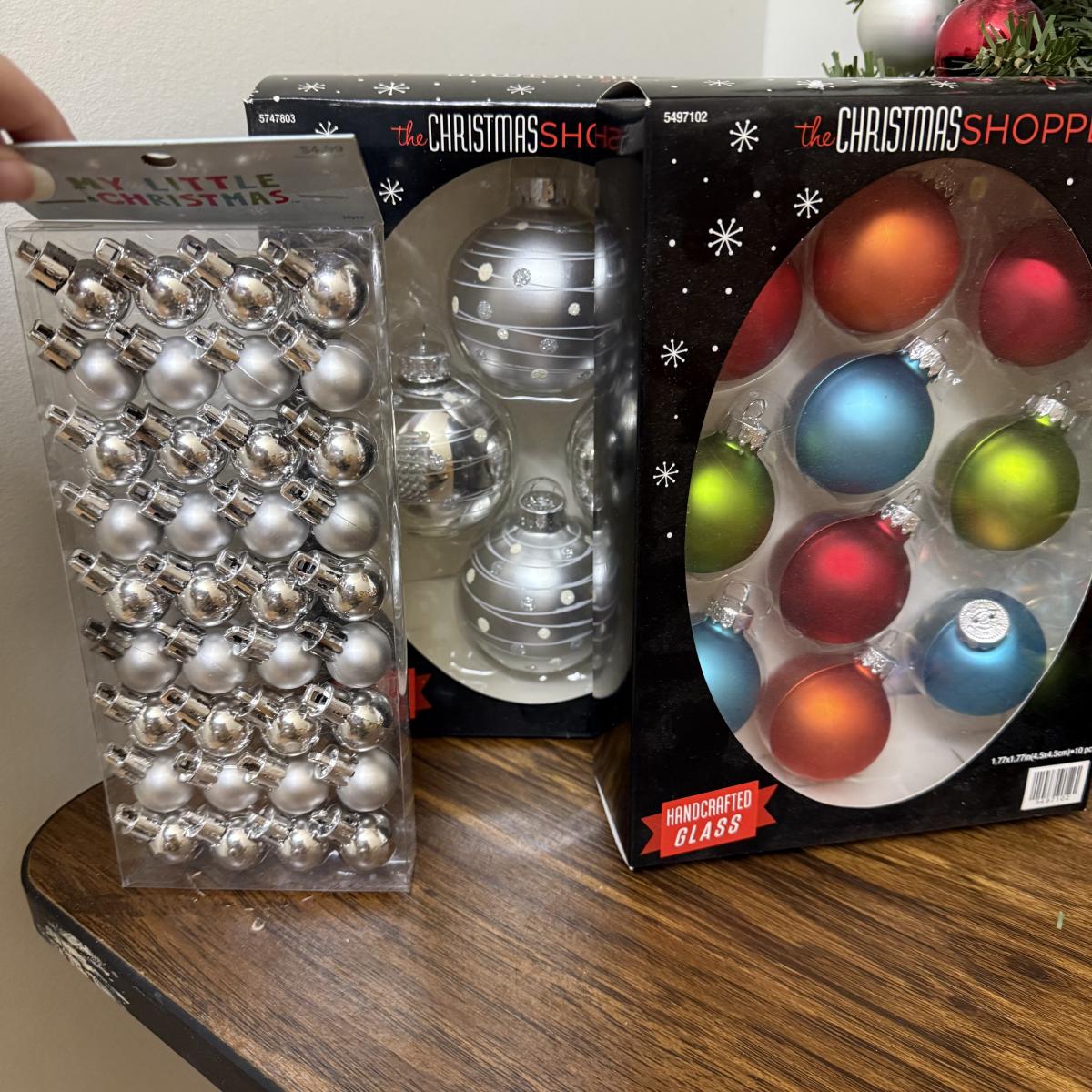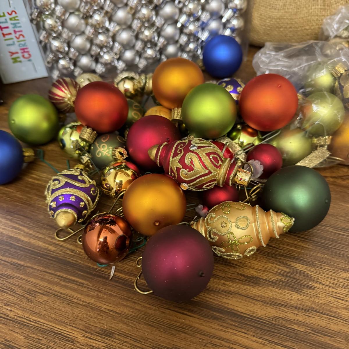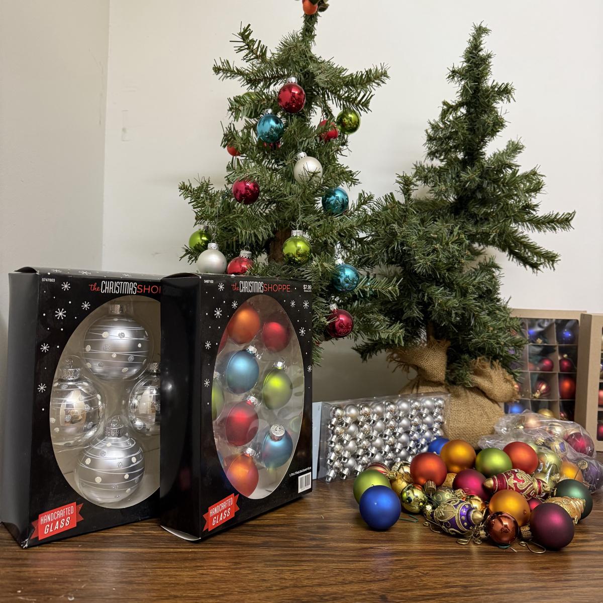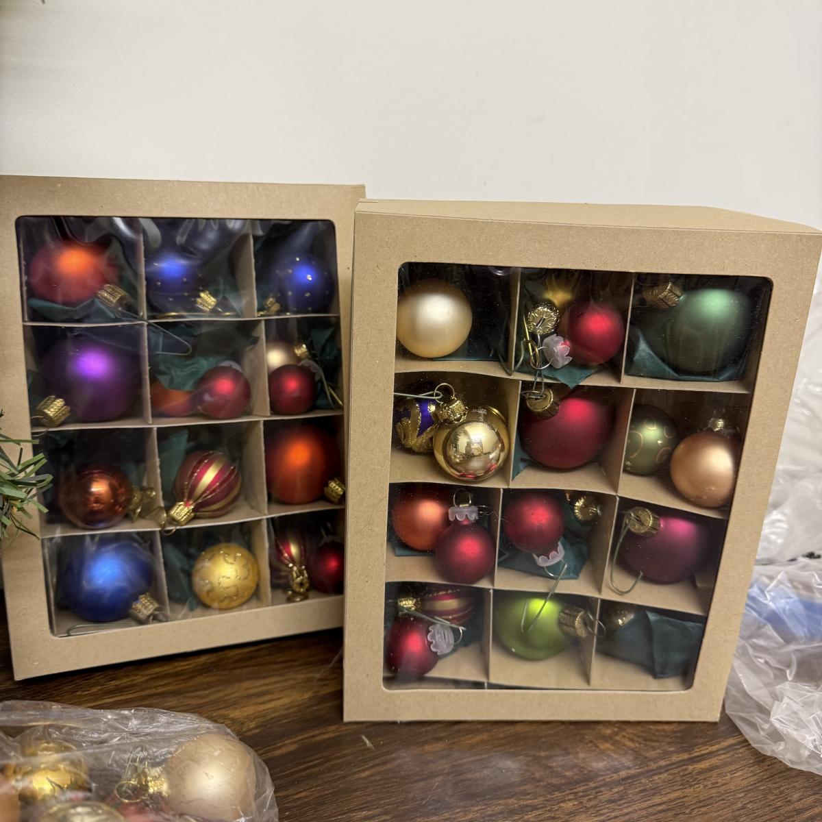 This lot contains two tiny faux Christmas trees one is 24”H with a 6”D base and one is 26”H with a 7”D base. Also included is five boxes of teeny bulb style glass ornaments. There are four silver bulb ornaments, in their original box that measure 2.5”D. The rest are all 2” or under. Shipping available. Shipping can be costly. We suggest contacting our preferred local shipping provider, Postage Express, with dimensions and getting an estimate before bidding: (828) 255-9250 or shipping@postageexpressnc.com.