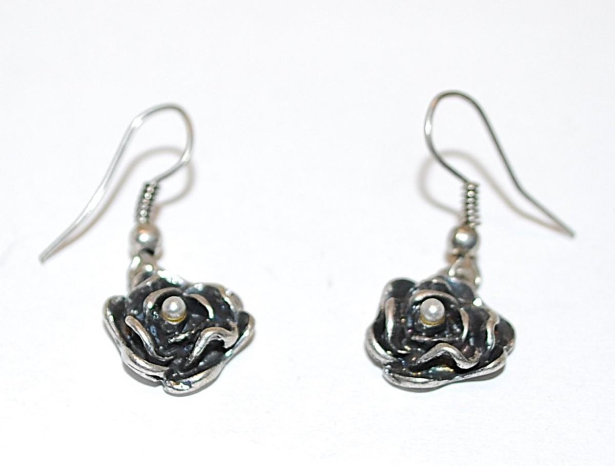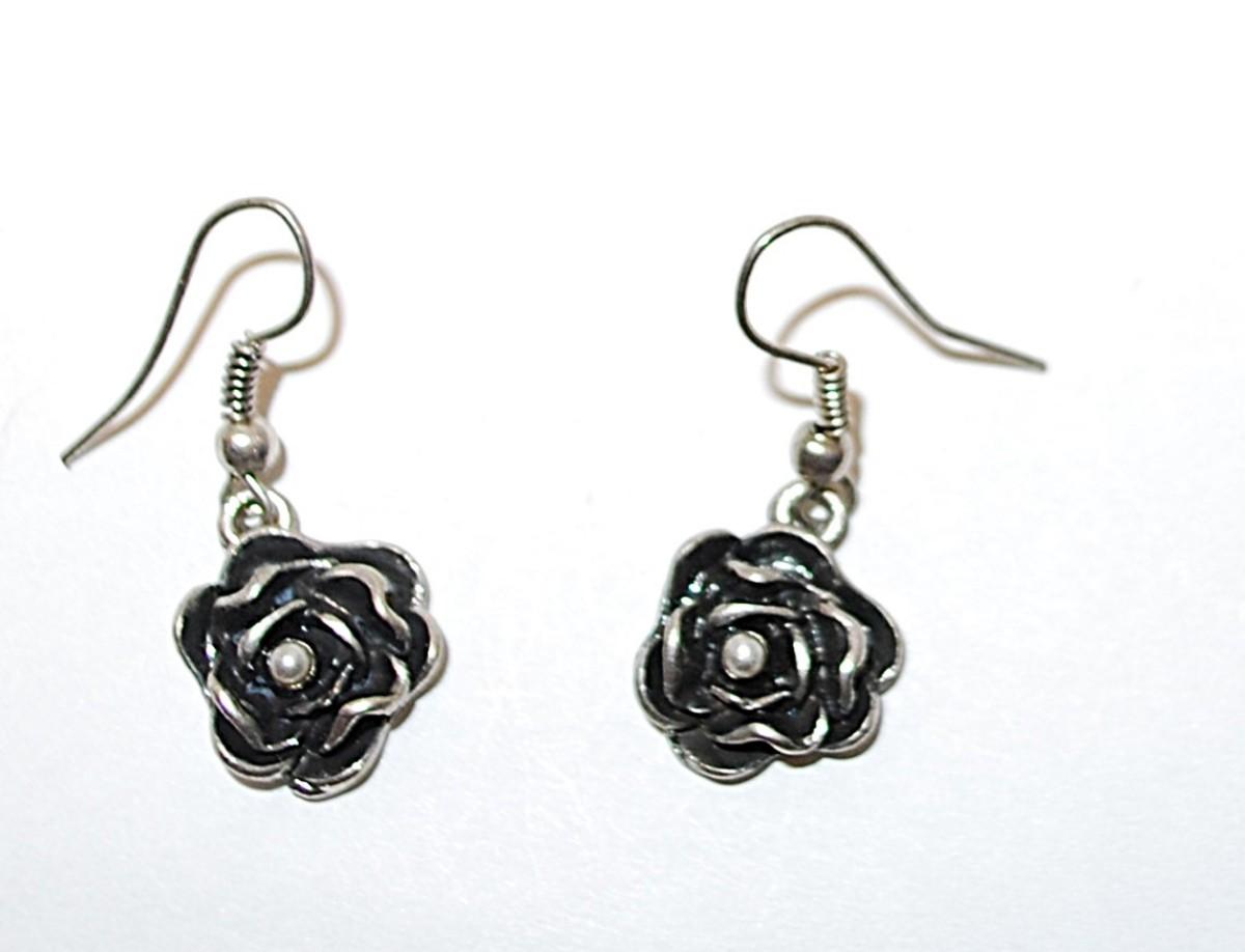 Tiny FAUX PEARL On a Blackened ROSE EARRINGS Set and Wire Hook Clasp