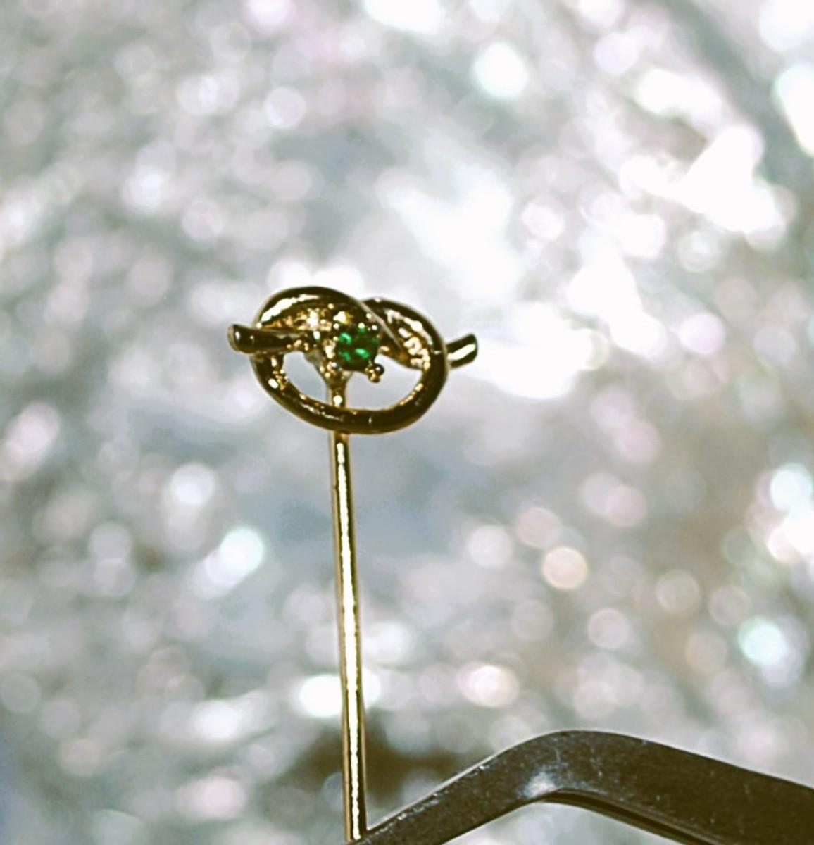 Tiny GREEN Stone PIN (2" L) in a Twisted Knot & Pin Guard on a Gold Tone Setting
