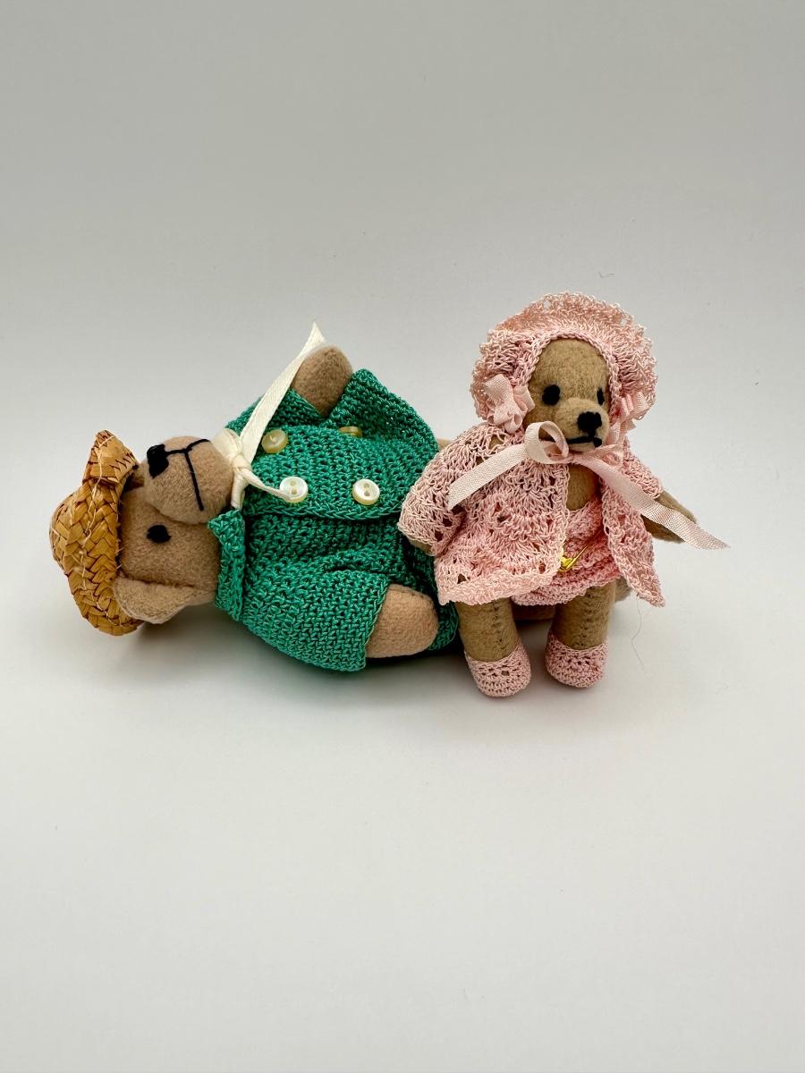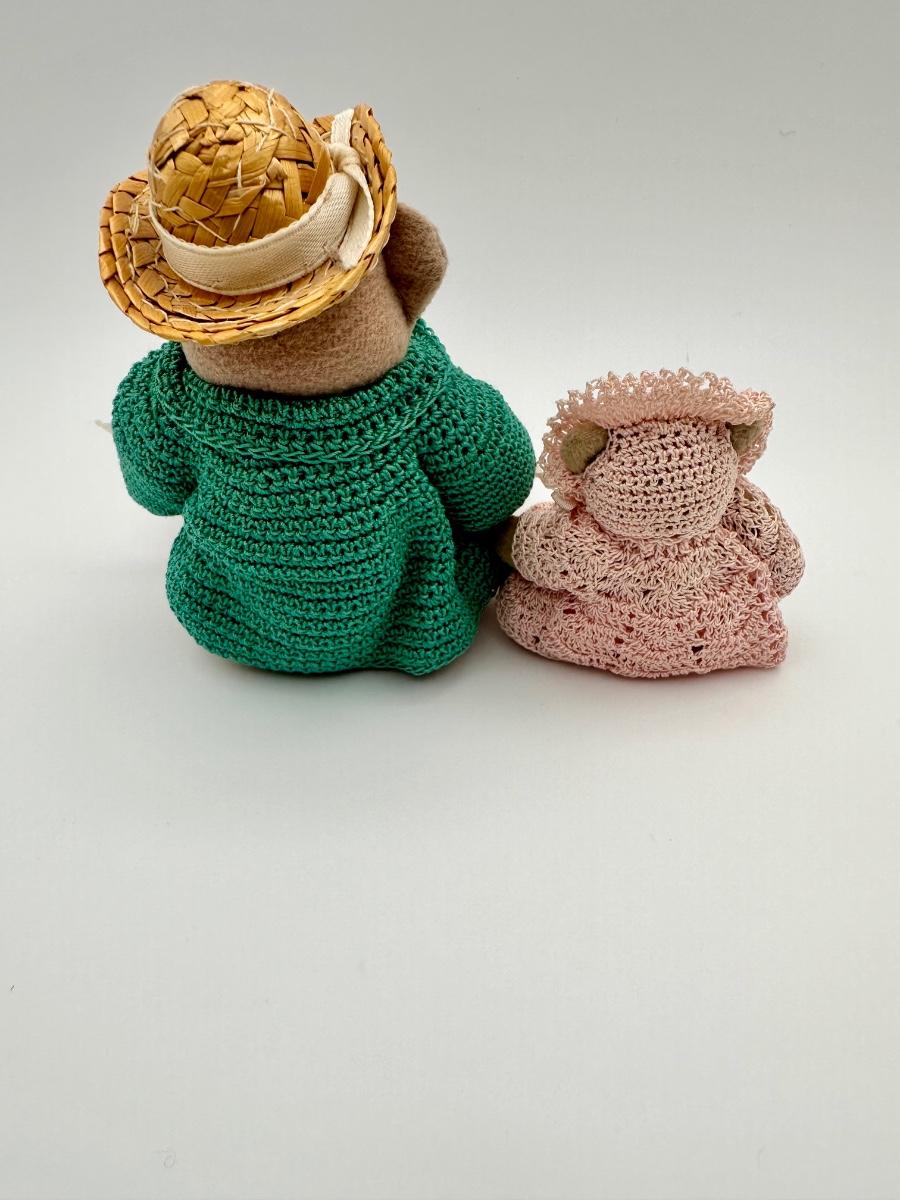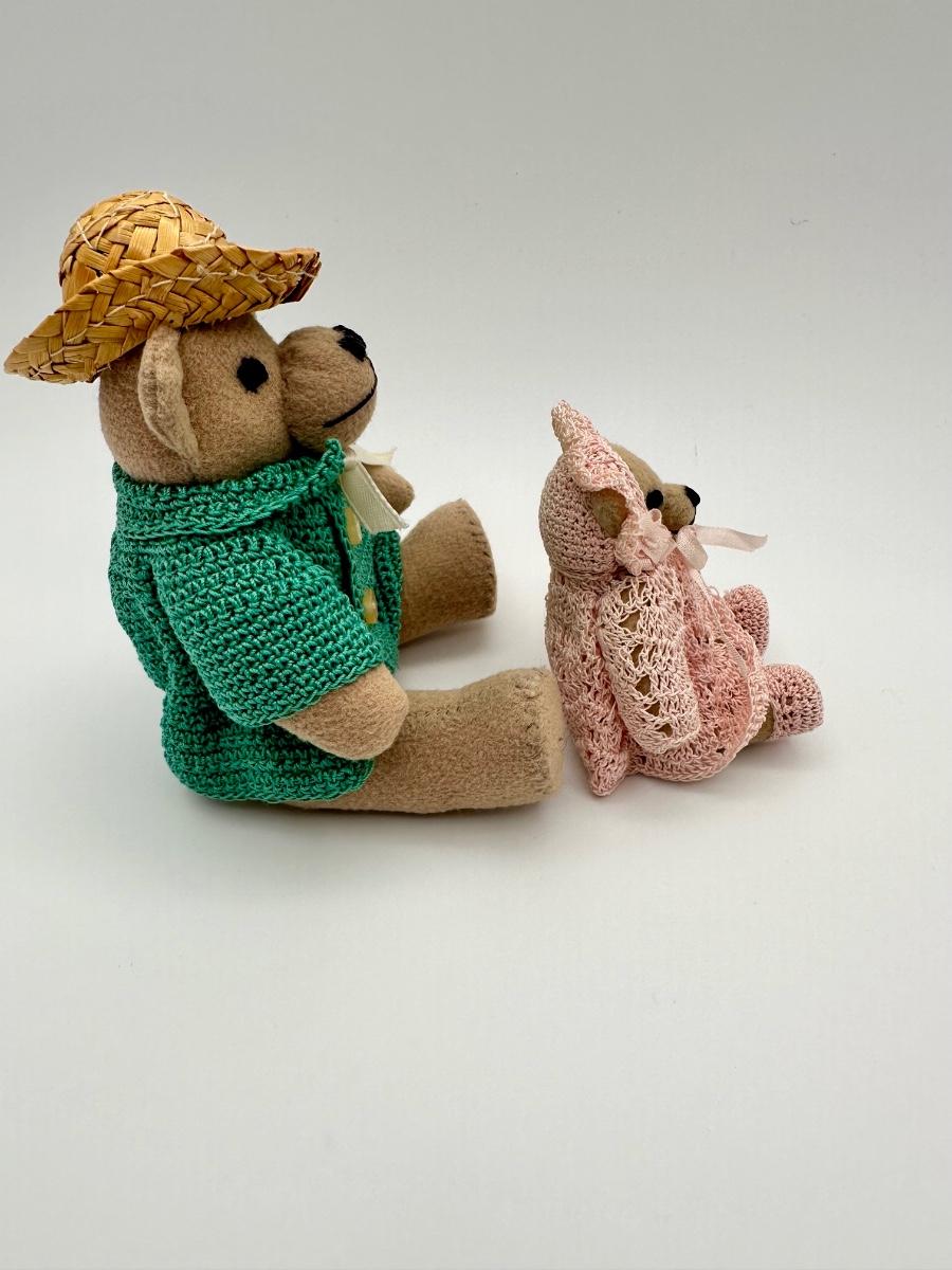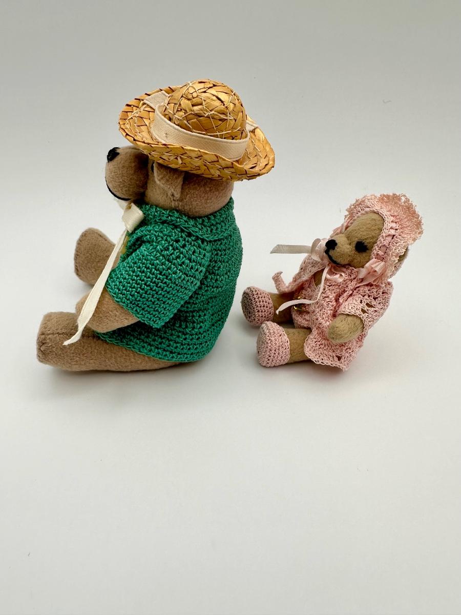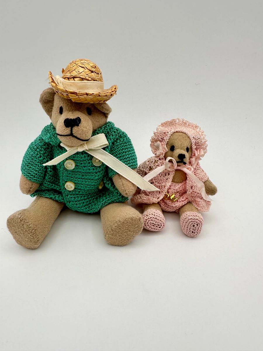 So precious these little miniatures! Papa with a delicately crocheted double breasted overcoat and straw hat. Baby with a crocheted overcoat, diaper, booties and bonnet. Faces are stitched. Papa is 5” Baby is 3”