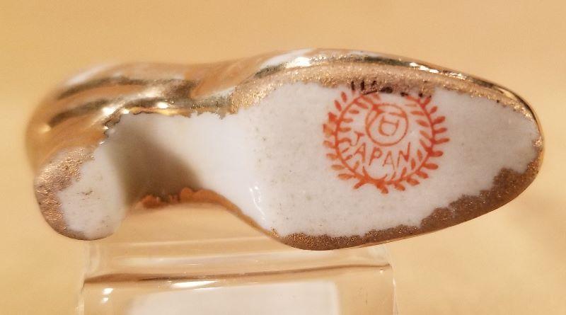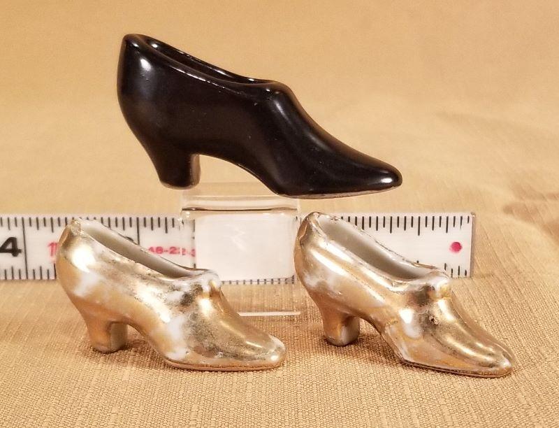This lot includes a marked Uhl Pottery Shoe and another pair of Japanese Tiny Shoes. The Uhl Pottery shoe is glazed black and measures 1 1/4-inches long. The pair of Gold ceramic Japanese shoes show wear. They measure 1-inch long.