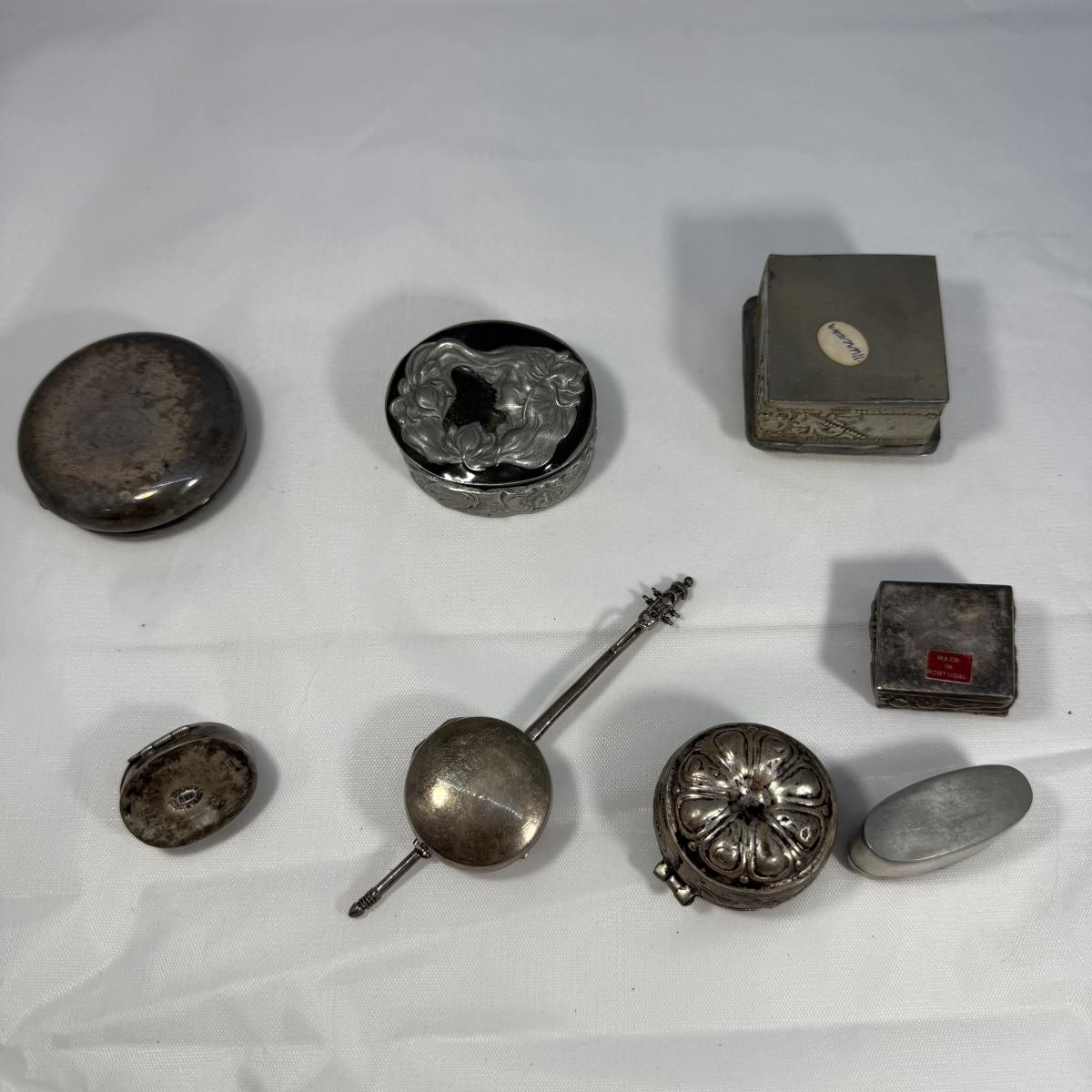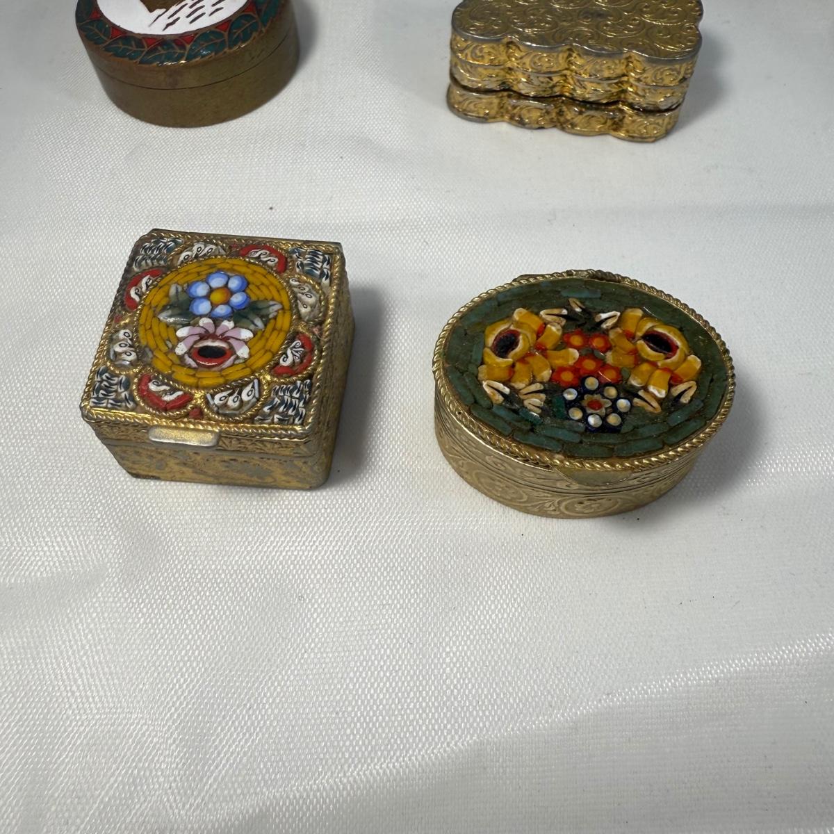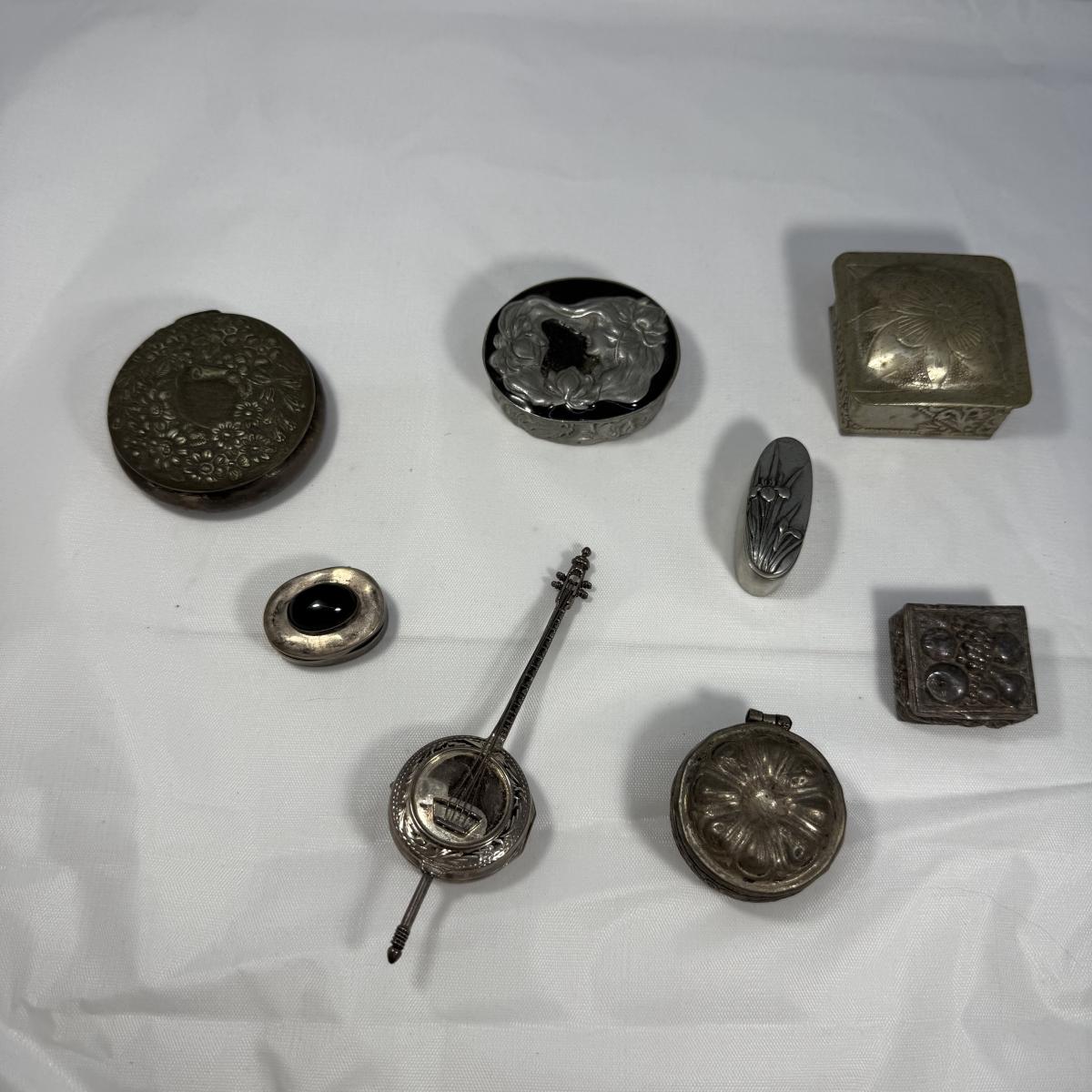 This lot contains over 20 of the most precious collection of teeny tiny trinket boxes! Most of the boxes are made of metal but we also have five itty bitty glass boxes. The smallest glass heart boxes measure .75” x .75”H. Of the silver colored boxes the banjo box measures 1” x 4” x .5”H and the silver box with a black stone inlay is marked Mexico 925 and measures 1” x .75” x .75”H. See pictures for full inventory. Shipping available.