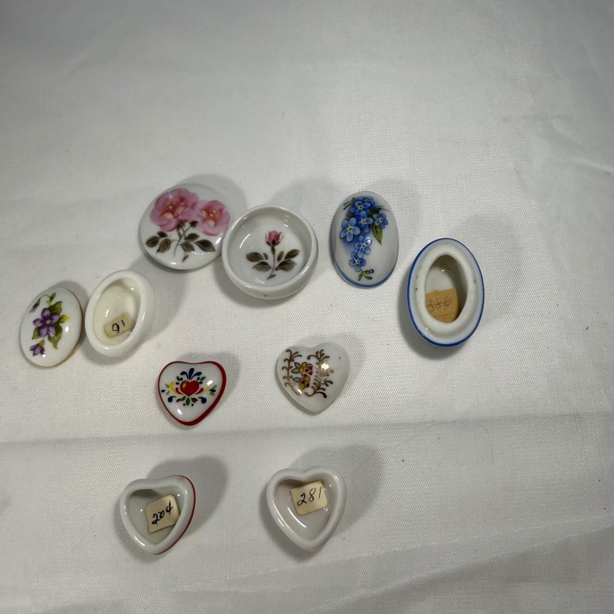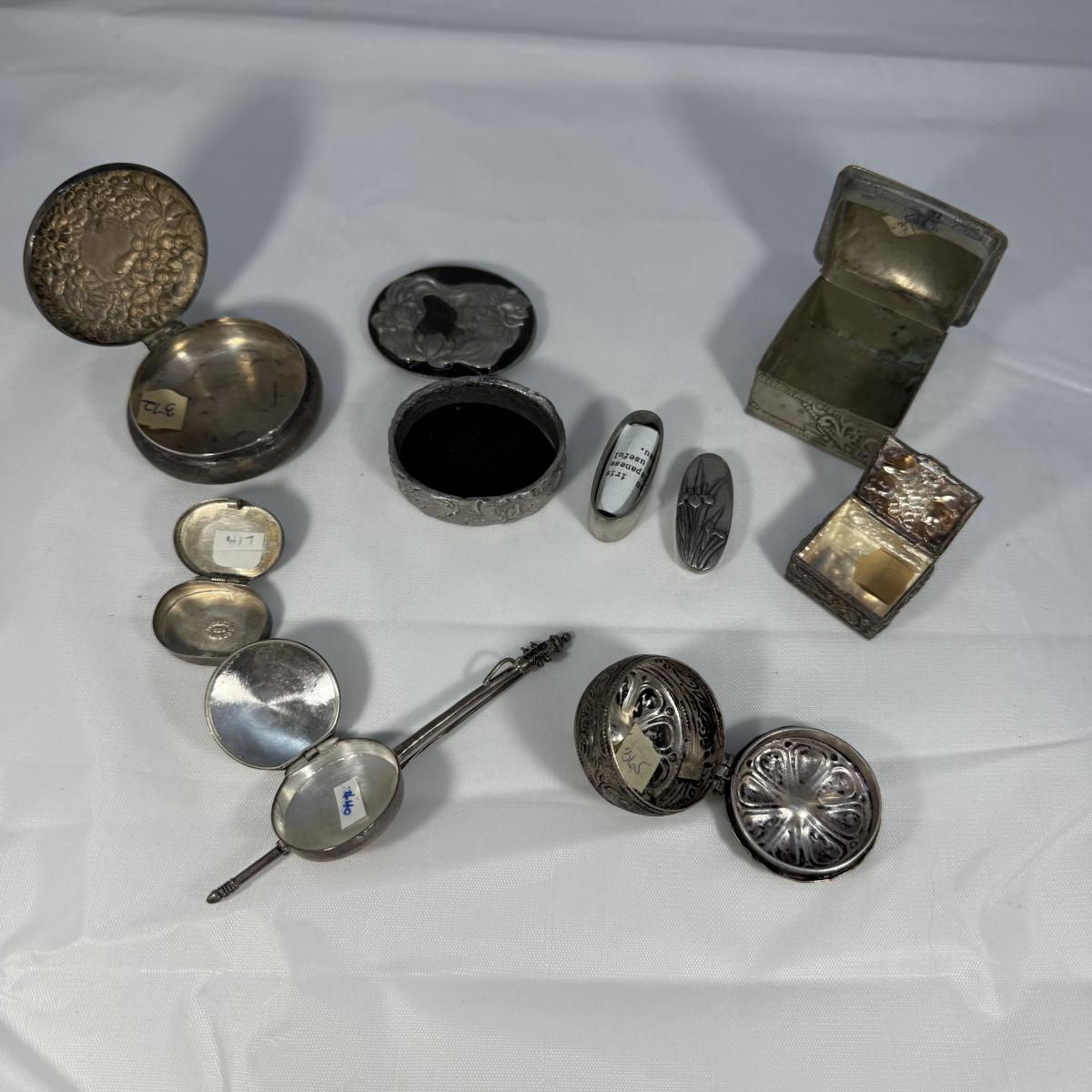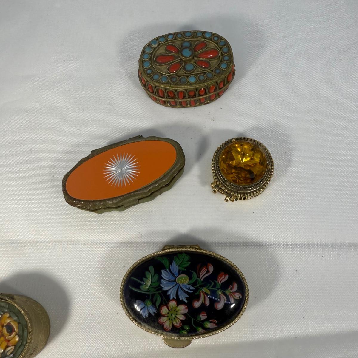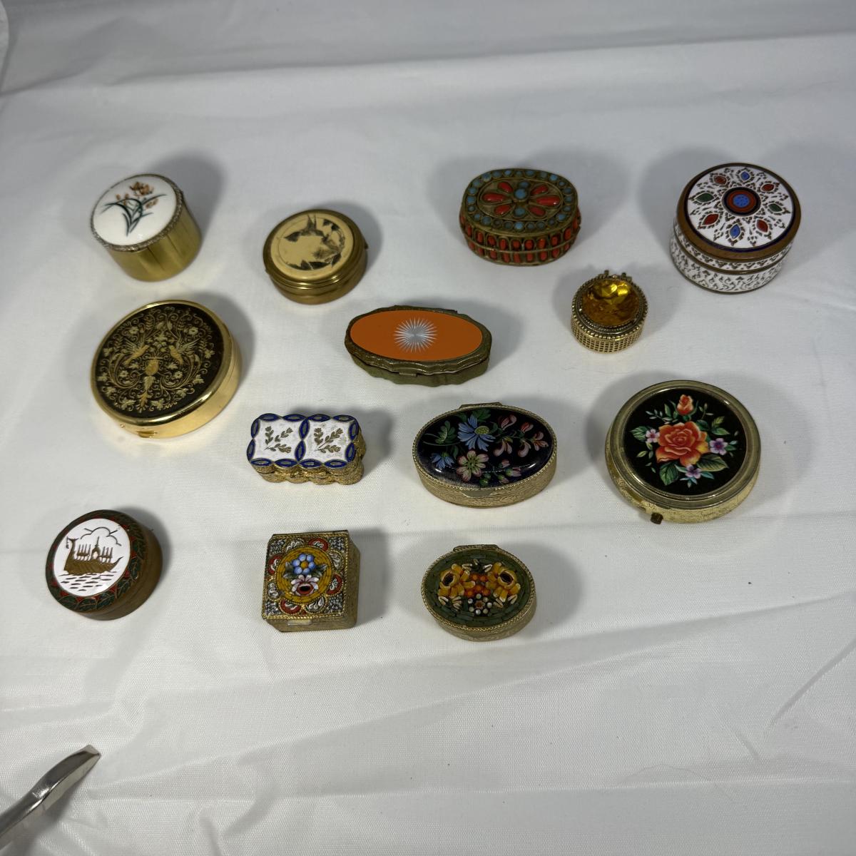 This lot contains over 20 of the most precious collection of teeny tiny trinket boxes! Most of the boxes are made of metal but we also have five itty bitty glass boxes. The smallest glass heart boxes measure .75” x .75”H. Of the silver colored boxes the banjo box measures 1” x 4” x .5”H and the silver box with a black stone inlay is marked Mexico 925 and measures 1” x .75” x .75”H. See pictures for full inventory. Shipping available.