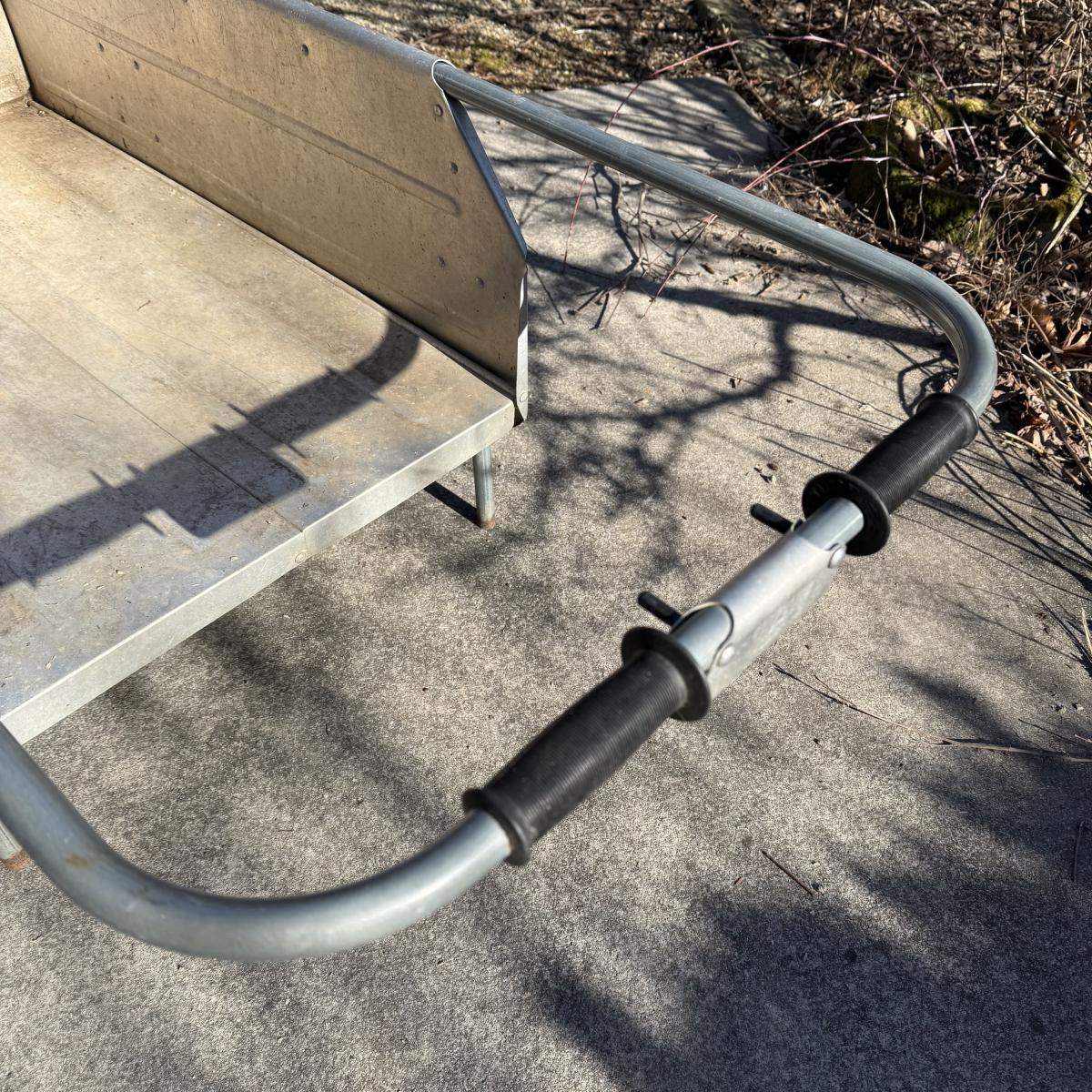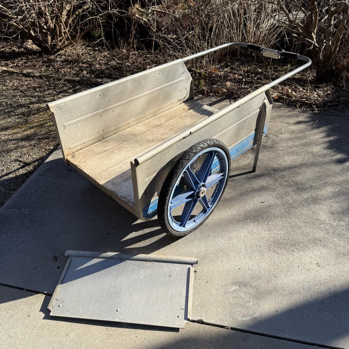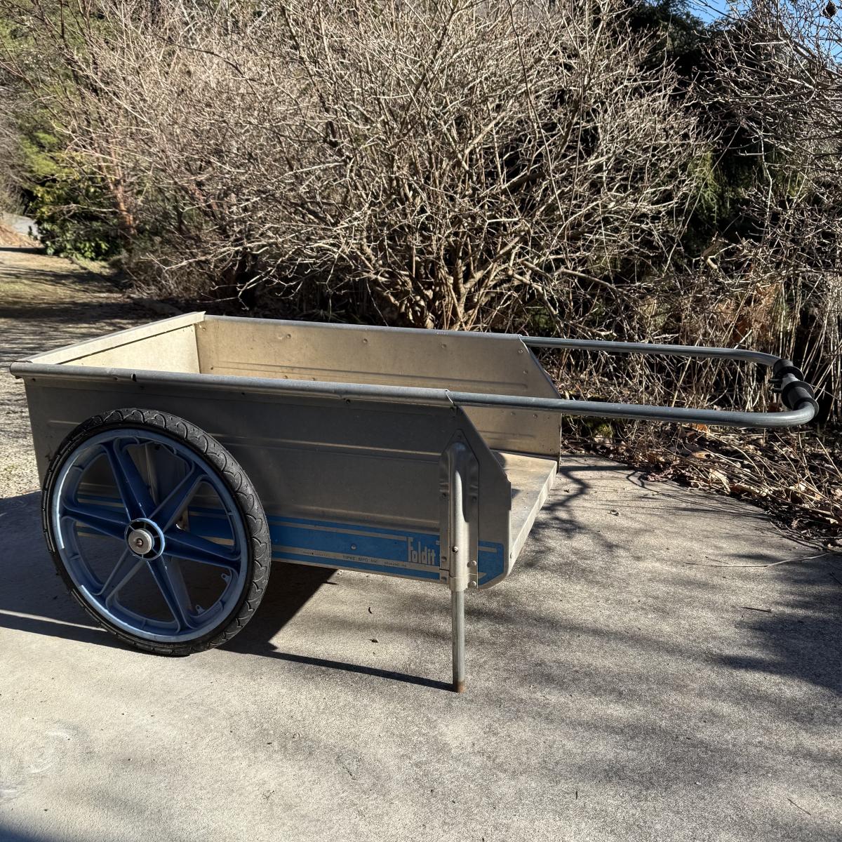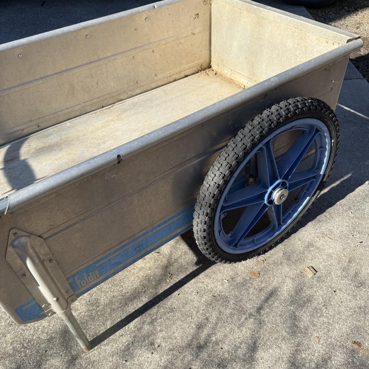 This ‘Foldit’ cart by Tipke Manufacturing appears to be aluminum with pneumatic tires and rubber grip handles. The tires are cracking and might need replaced; they are flat currently. Open, the cart measures 24.5” x 38.5” x 22”H. The handle adds 17” to the length. It folds up compactly for transport.