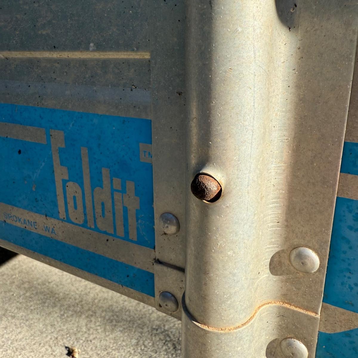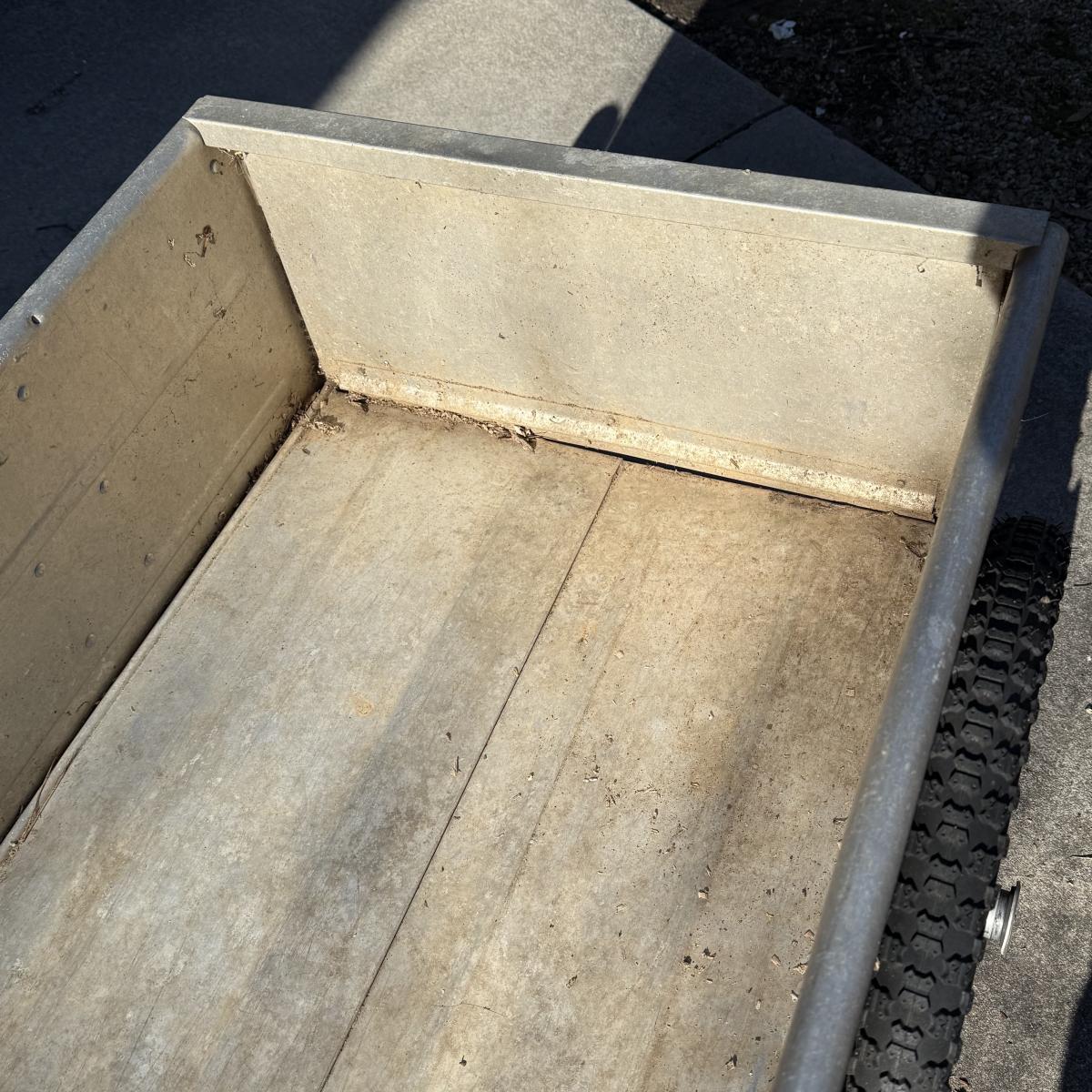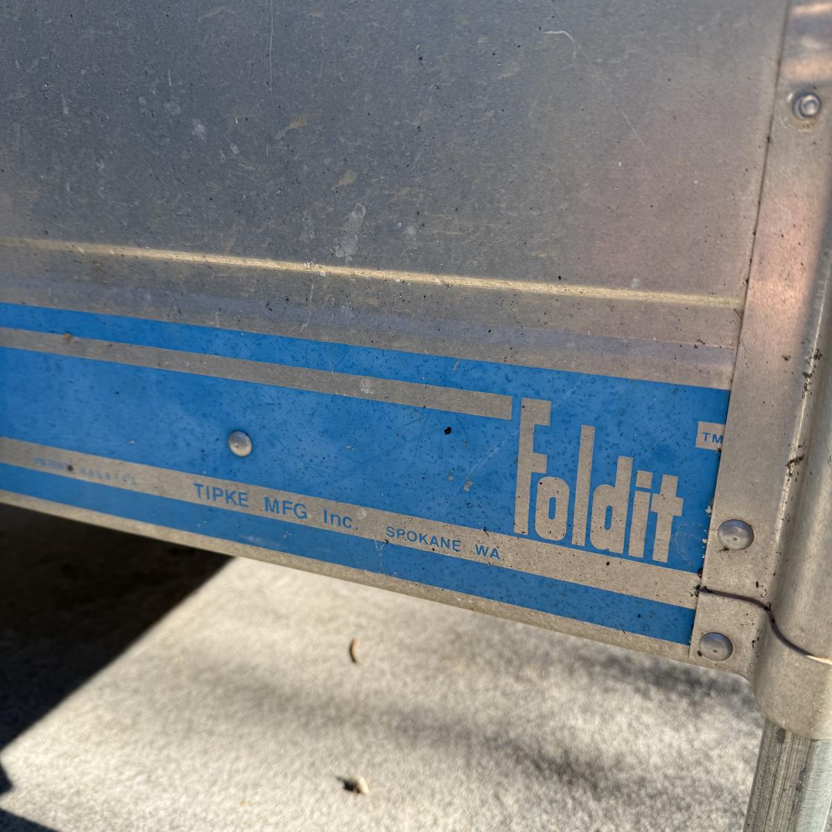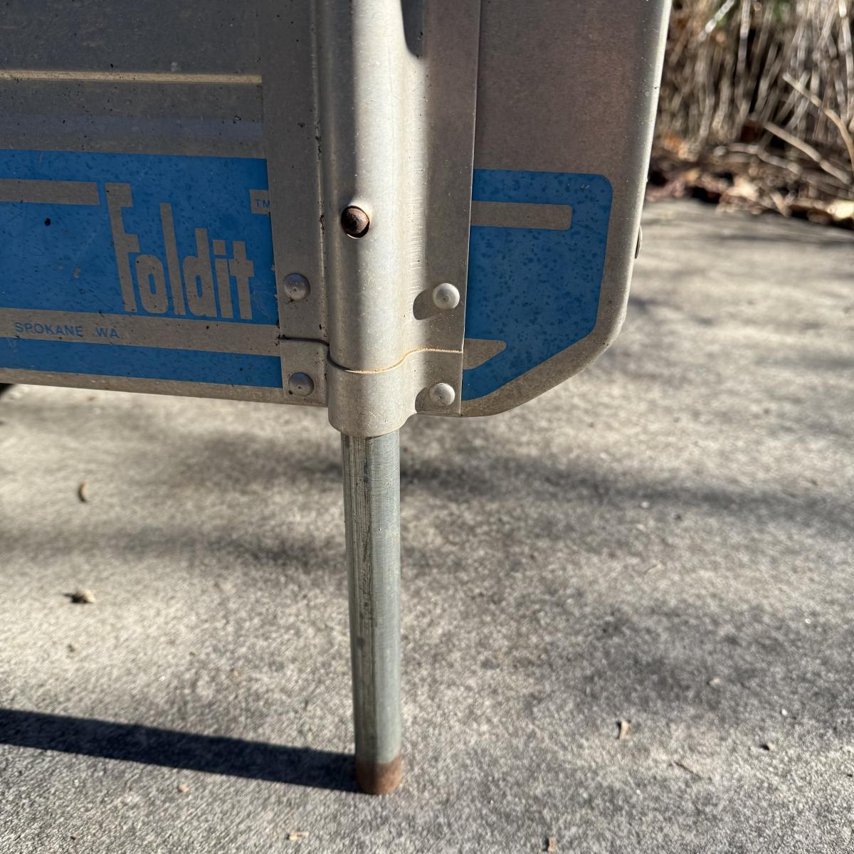 This ‘Foldit’ cart by Tipke Manufacturing appears to be aluminum with pneumatic tires and rubber grip handles. The tires are cracking and might need replaced; they are flat currently. Open, the cart measures 24.5” x 38.5” x 22”H. The handle adds 17” to the length. It folds up compactly for transport.