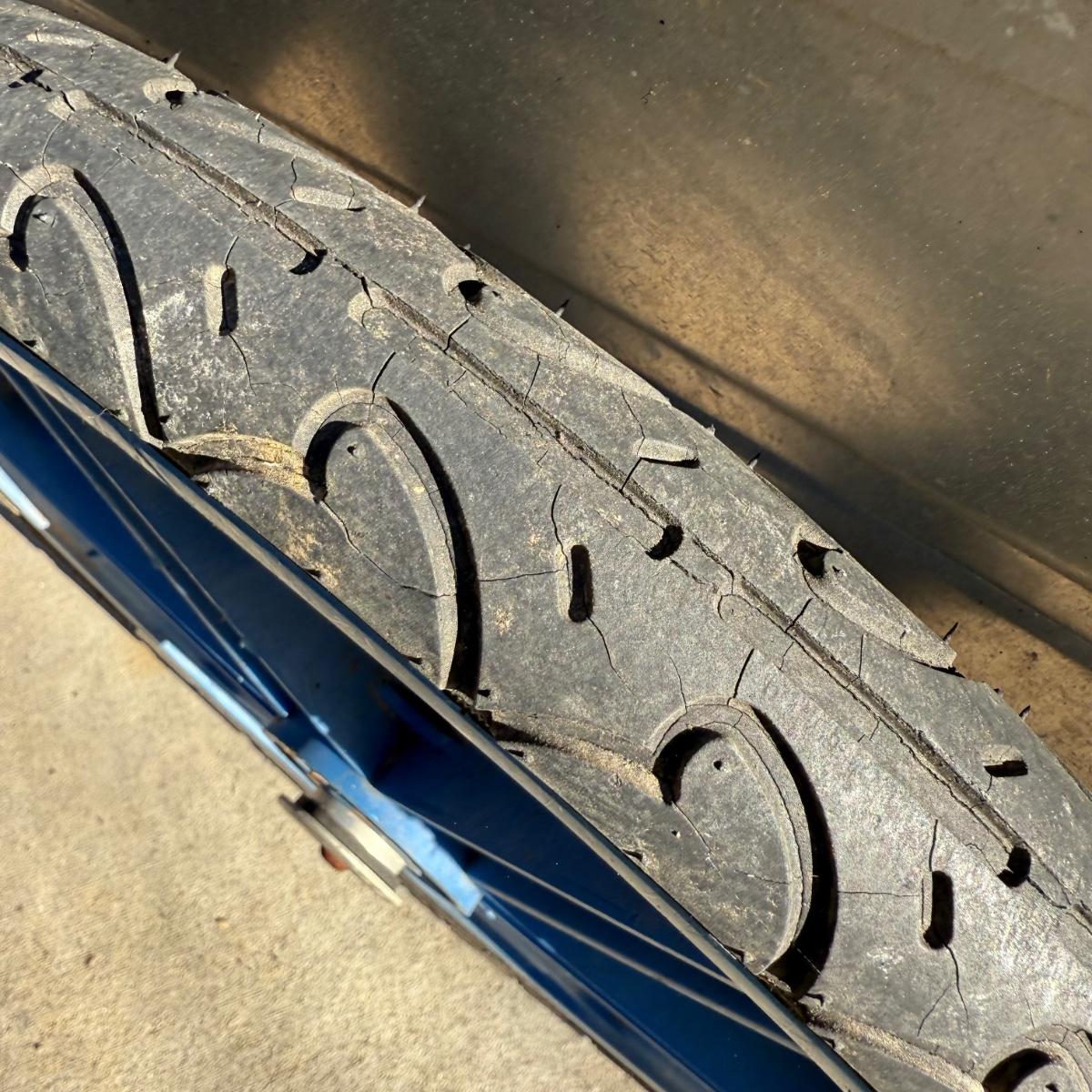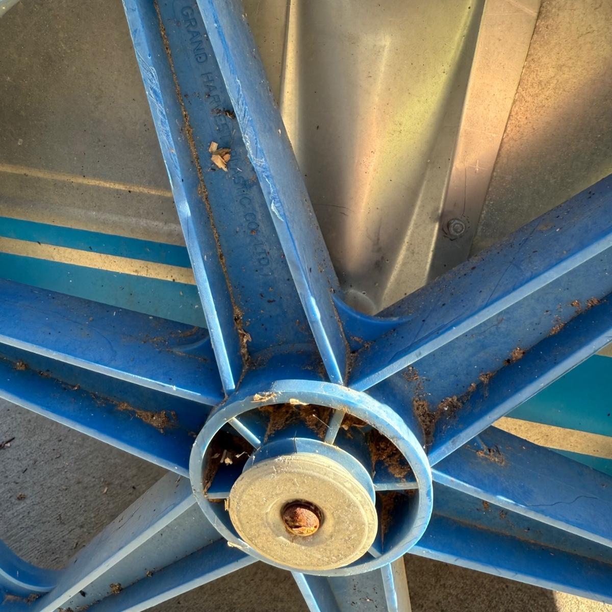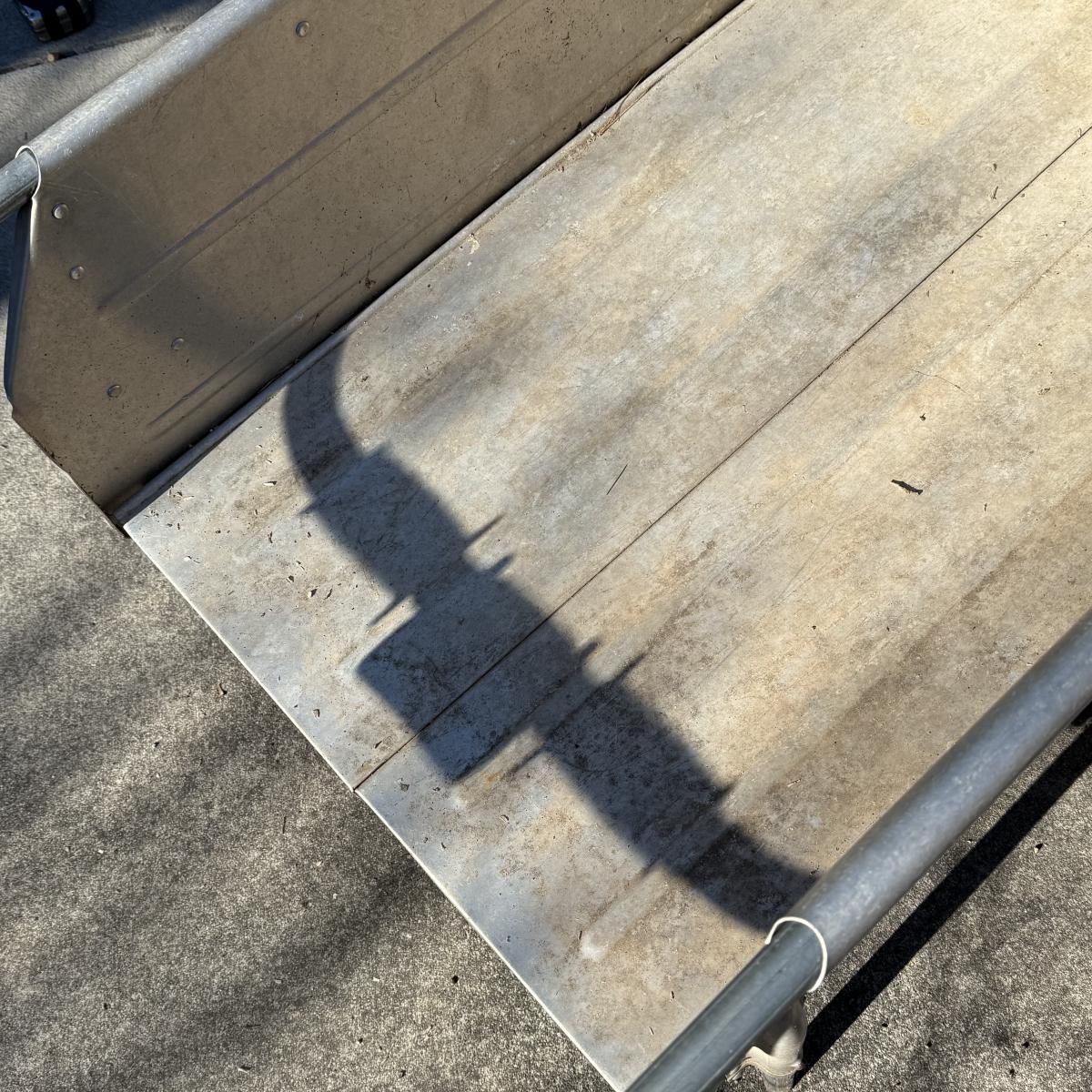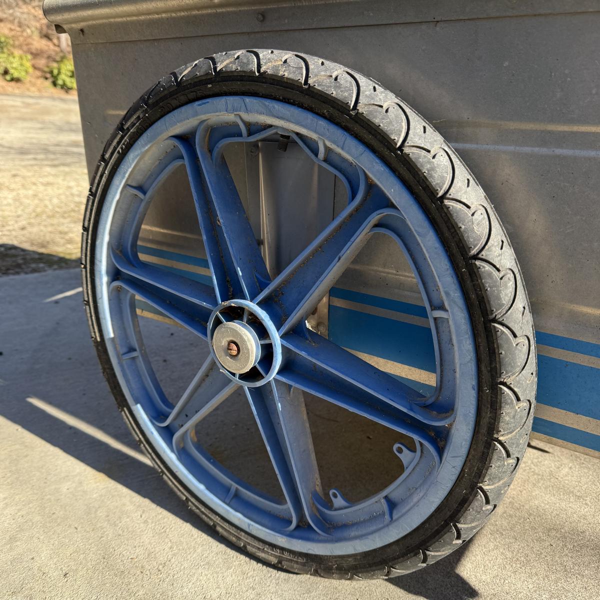 This ‘Foldit’ cart by Tipke Manufacturing appears to be aluminum with pneumatic tires and rubber grip handles. The tires are cracking and might need replaced; they are flat currently. Open, the cart measures 24.5” x 38.5” x 22”H. The handle adds 17” to the length. It folds up compactly for transport.