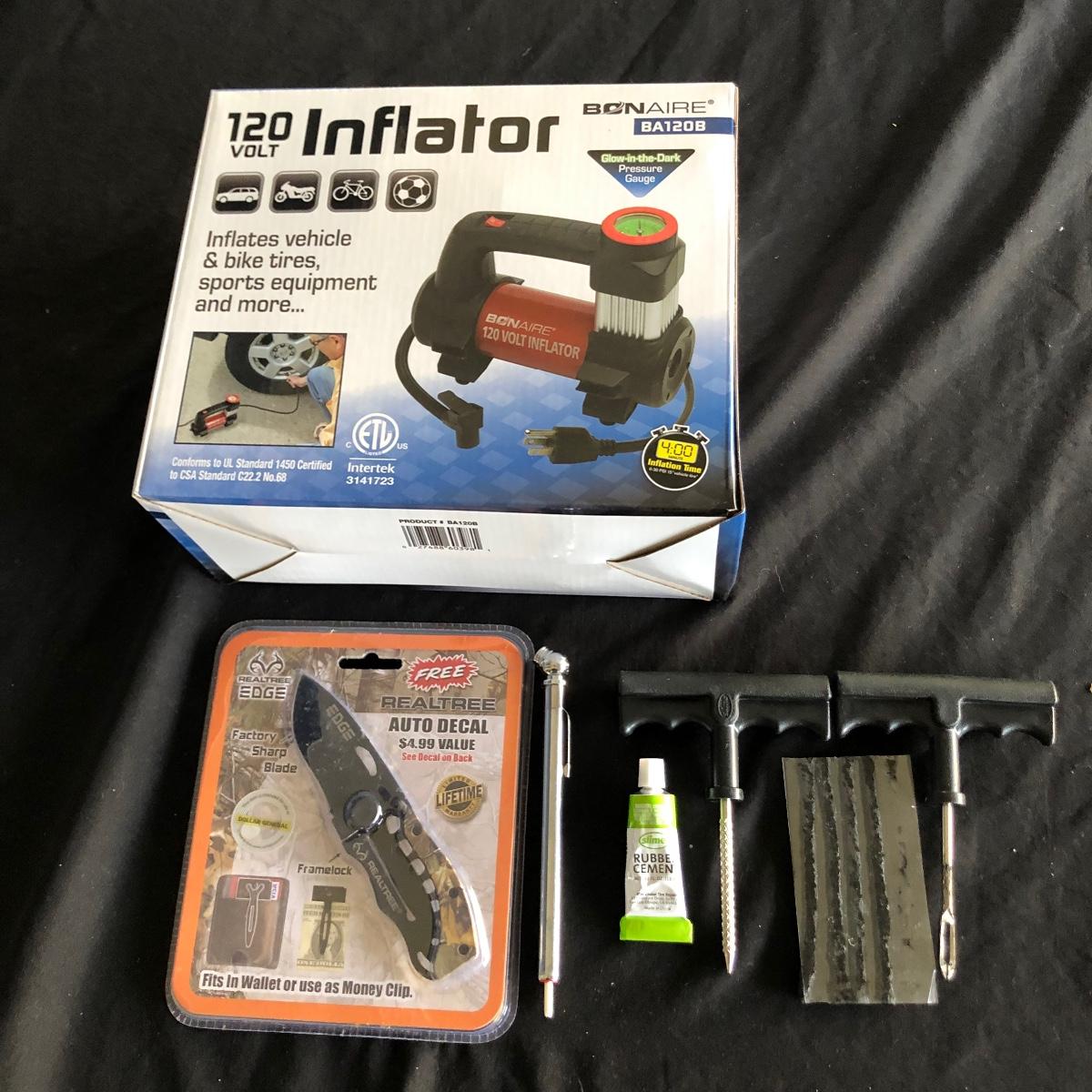 Lot includes tire inflator, tire repair kit and Realtree knife.