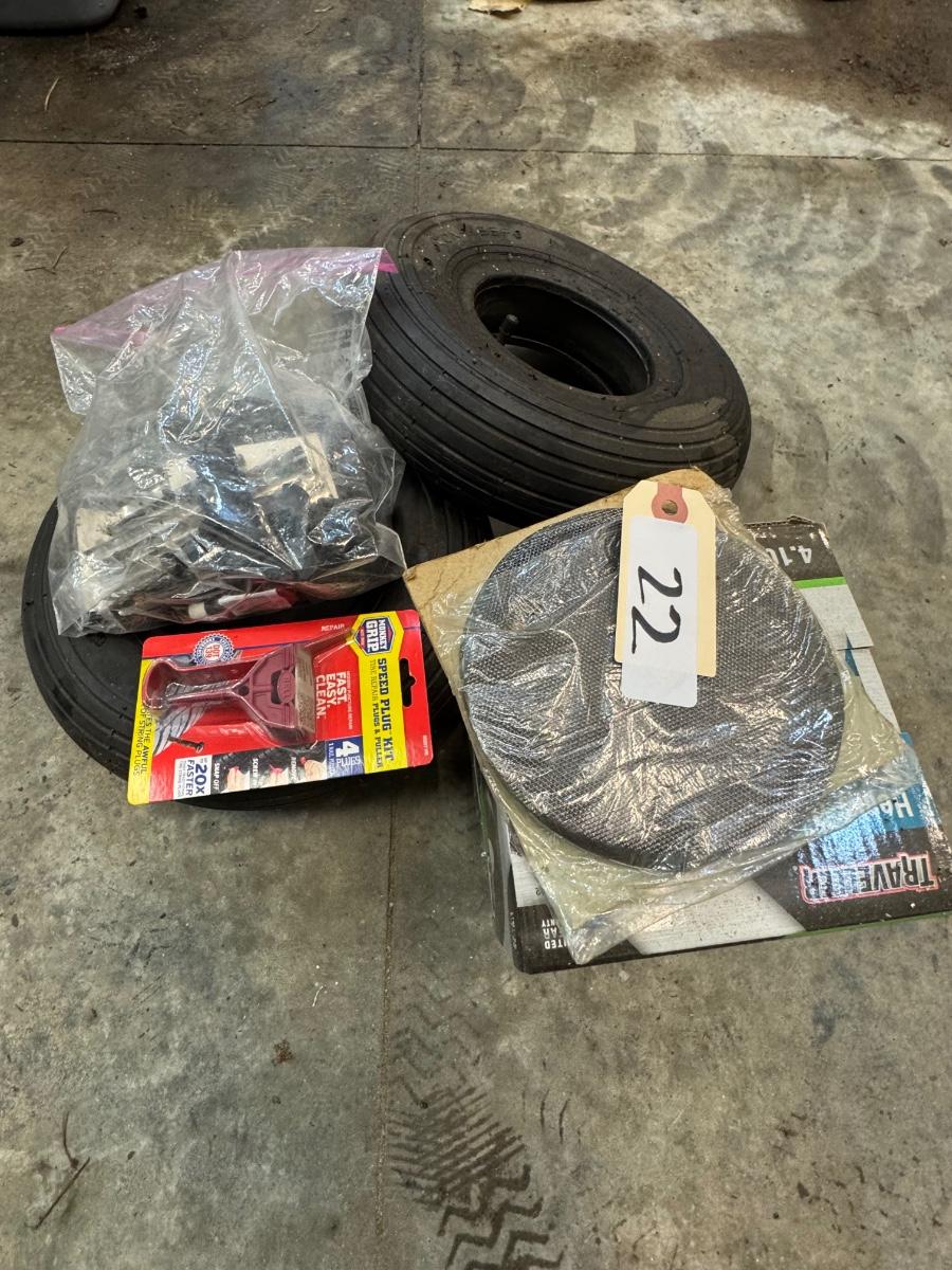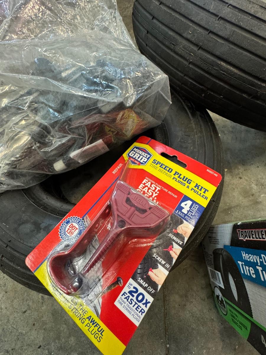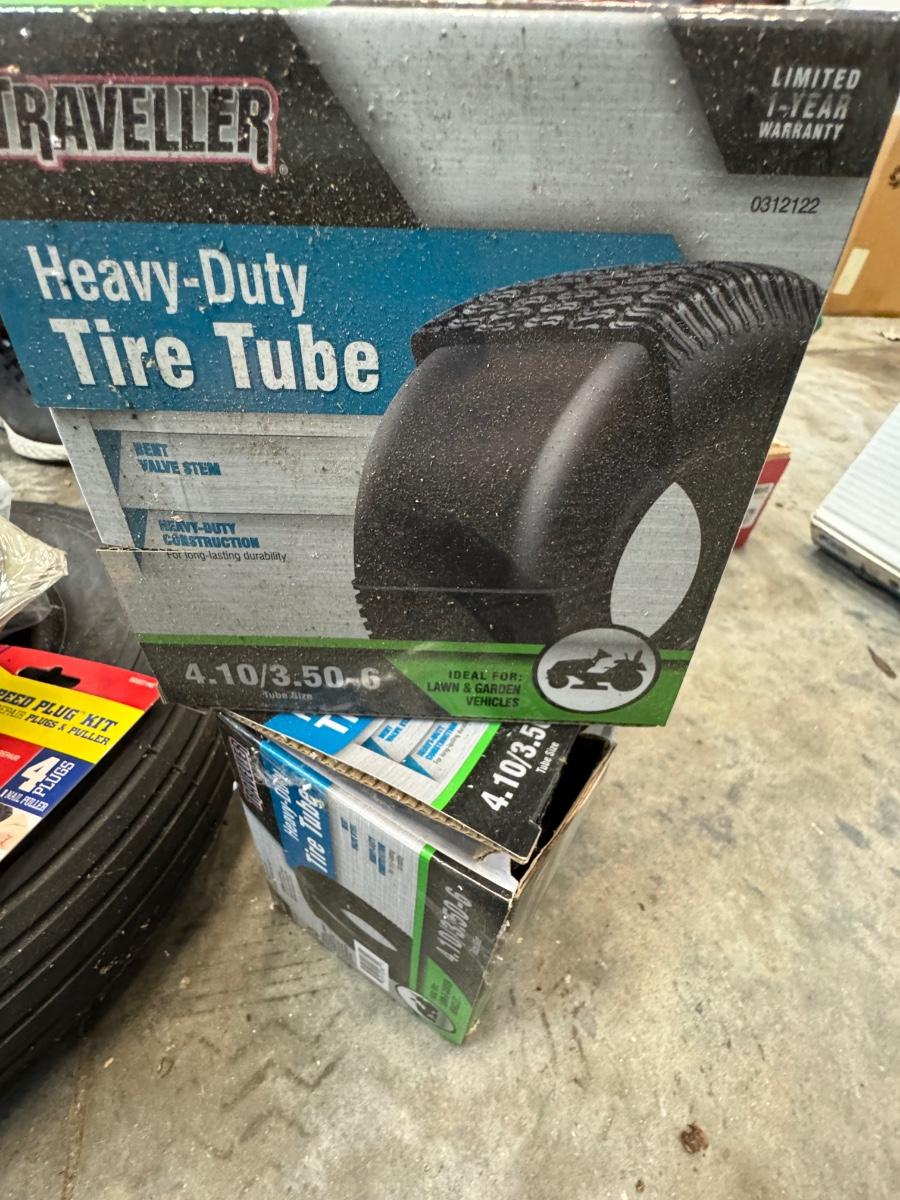 TIRE REPAIRS INCLUDES 2 LAWNMORE TIRES, PATCHES, 2 LAWNMORE TIRE TUBES, MISC PLUGS