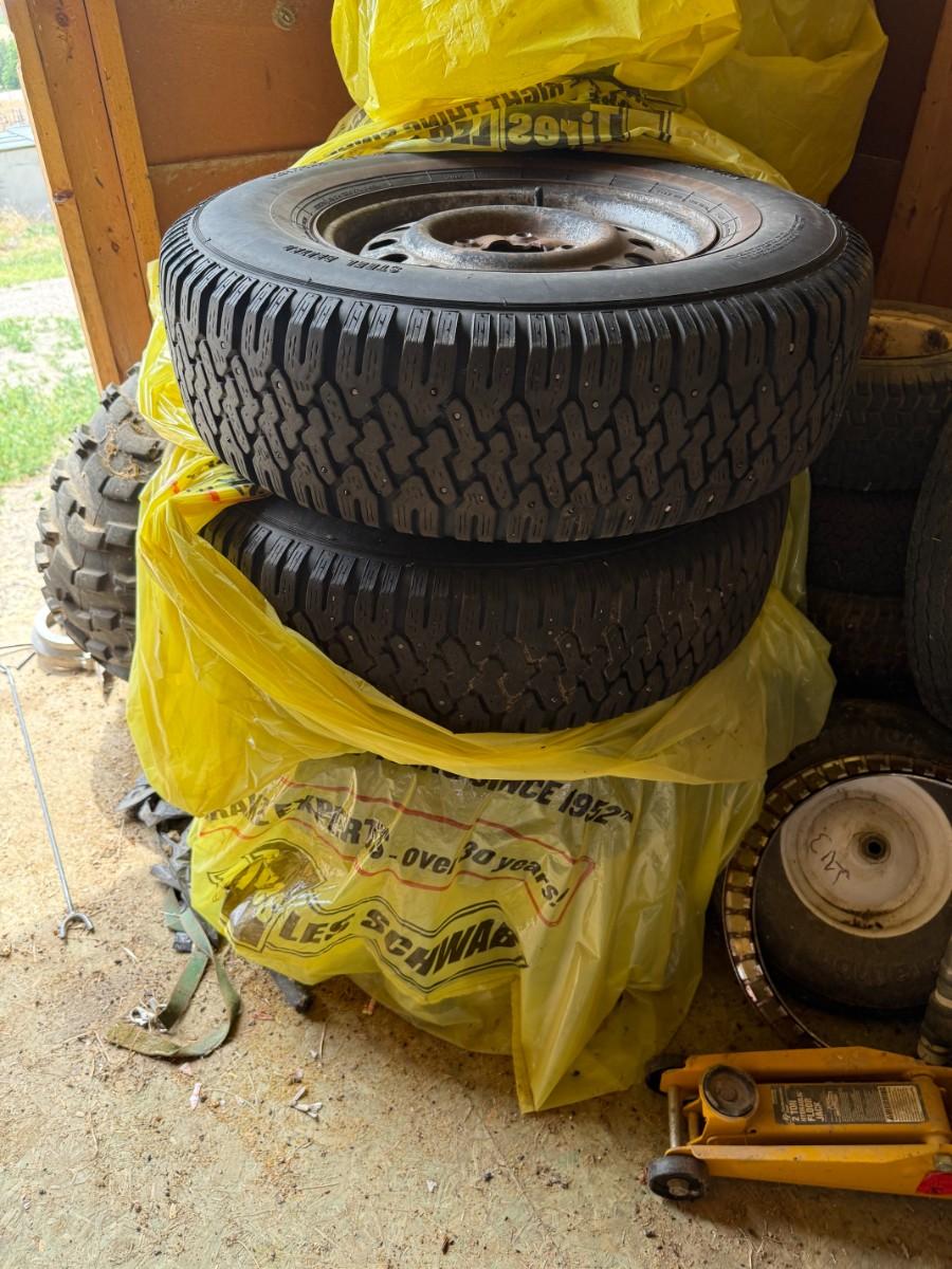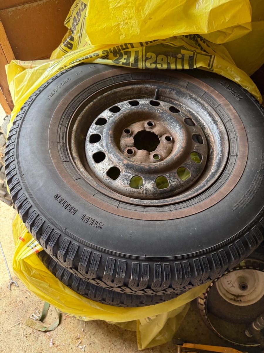 steel-belted radial tires mounted on used steel rims. Tread appears decent.