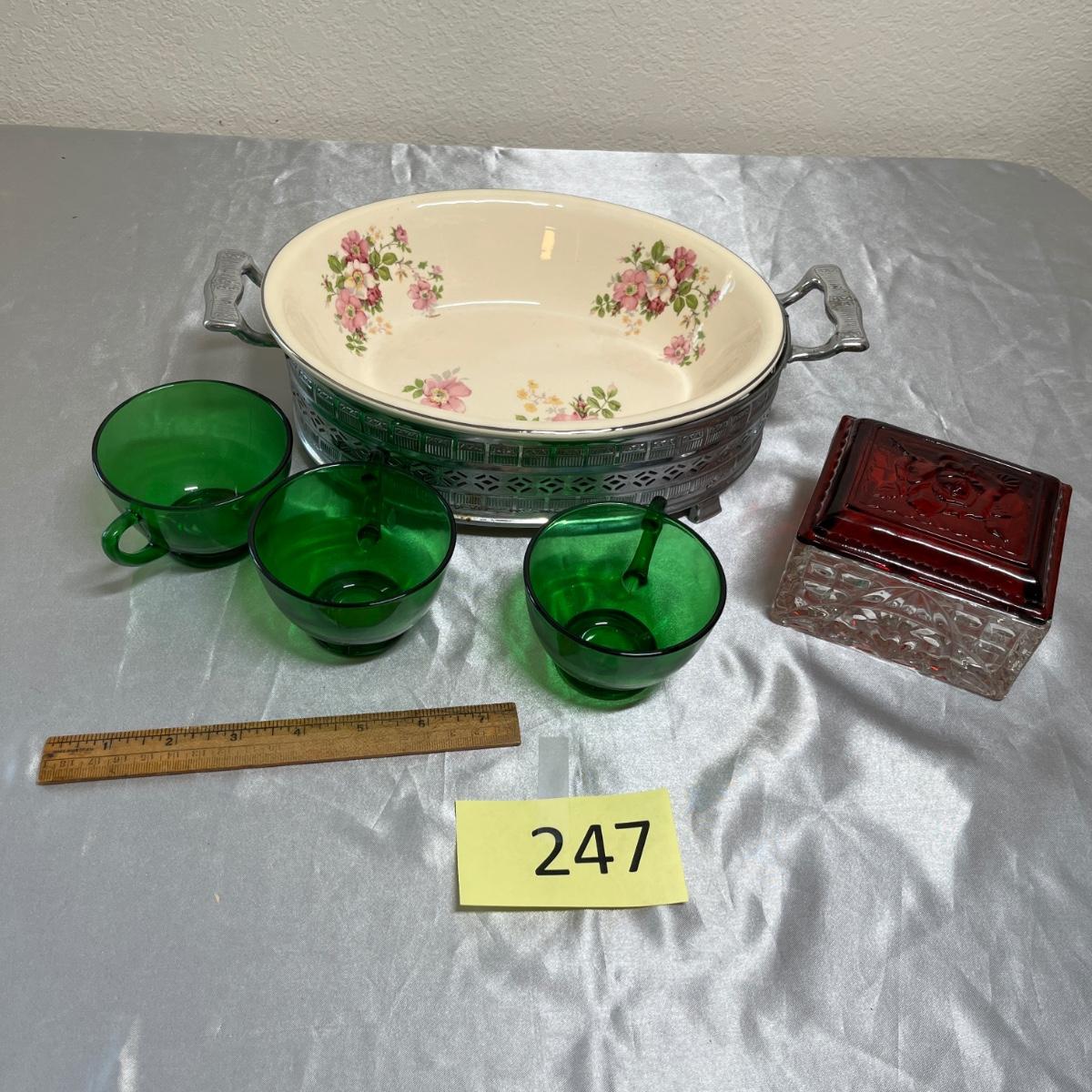 The ruby lid has lots of edge chips. Serving bowl in great shape. Ruler is 8"