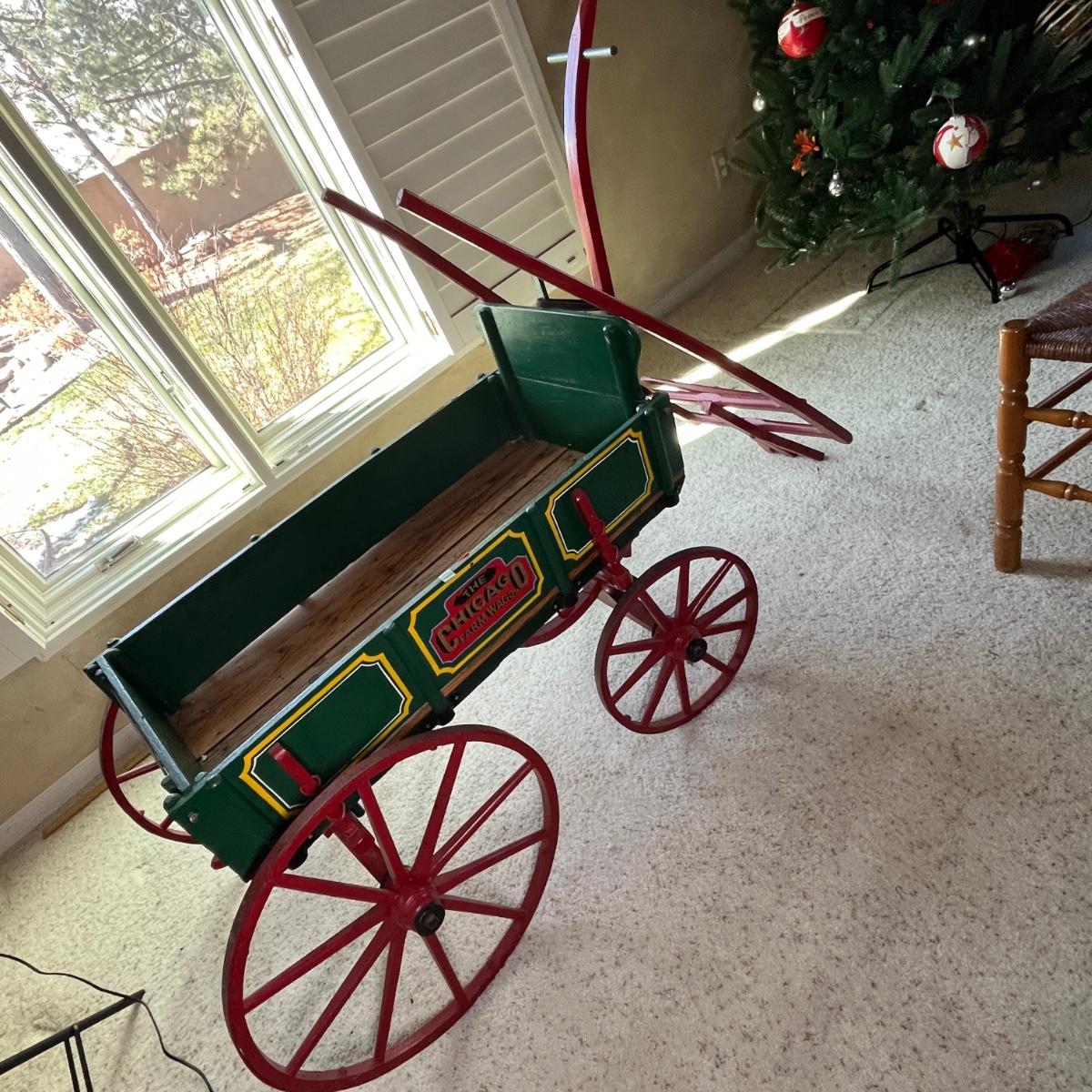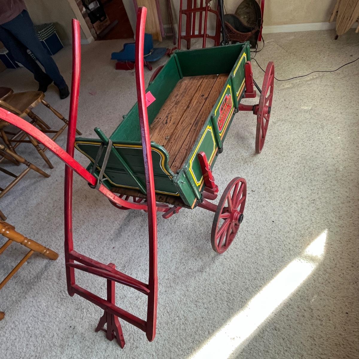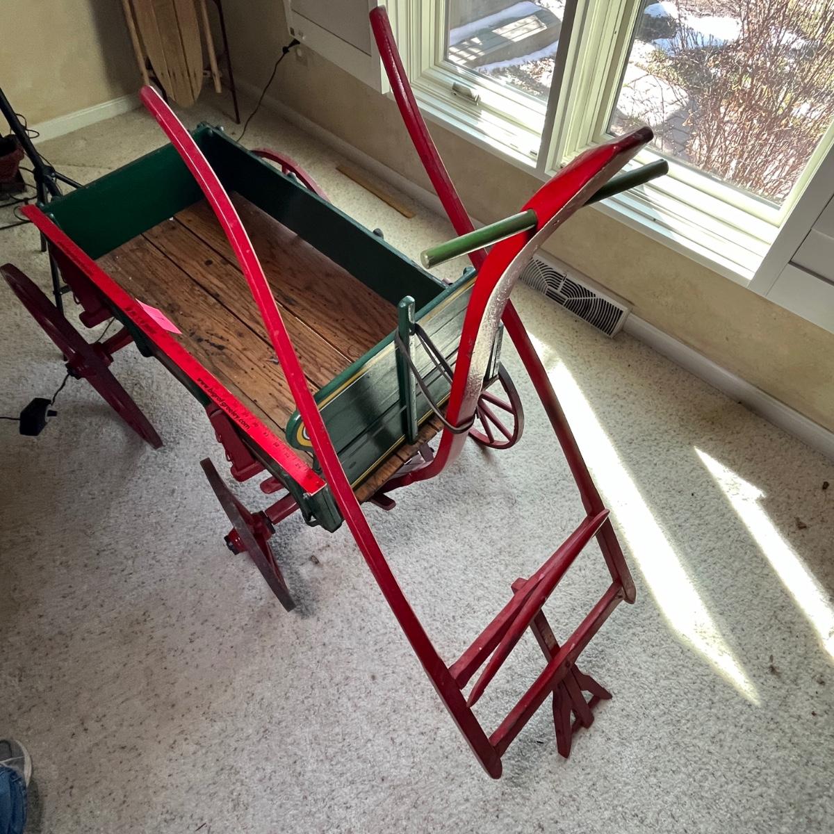 This is a fabulous wagon! Totally restored. Comes with yoke to attach doggie or goat! Also has the pull handle.