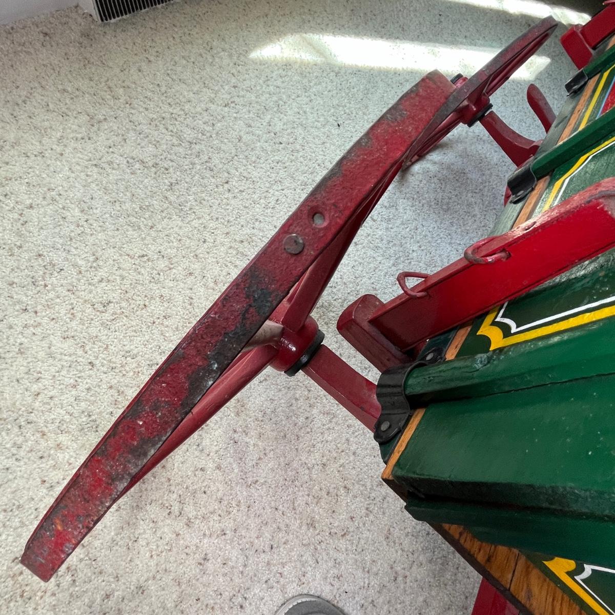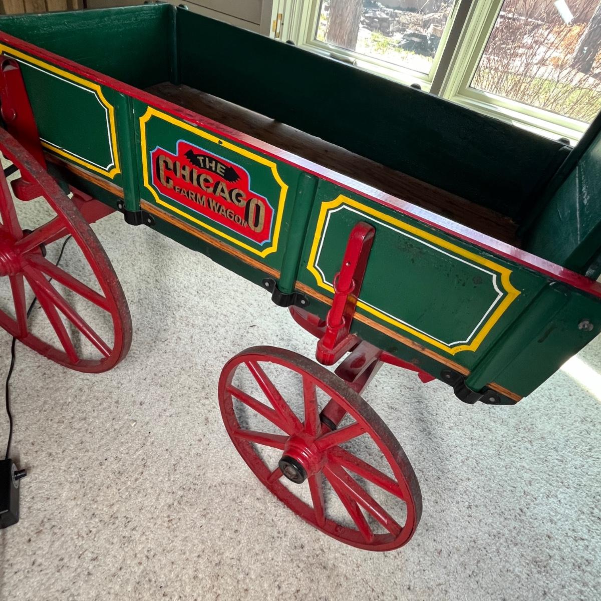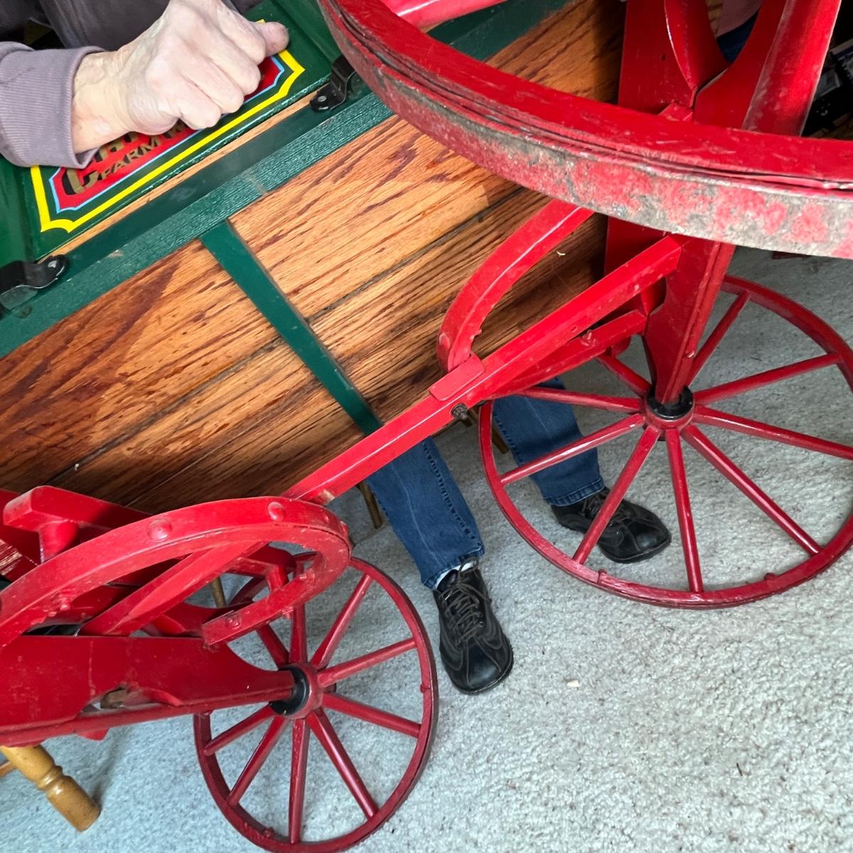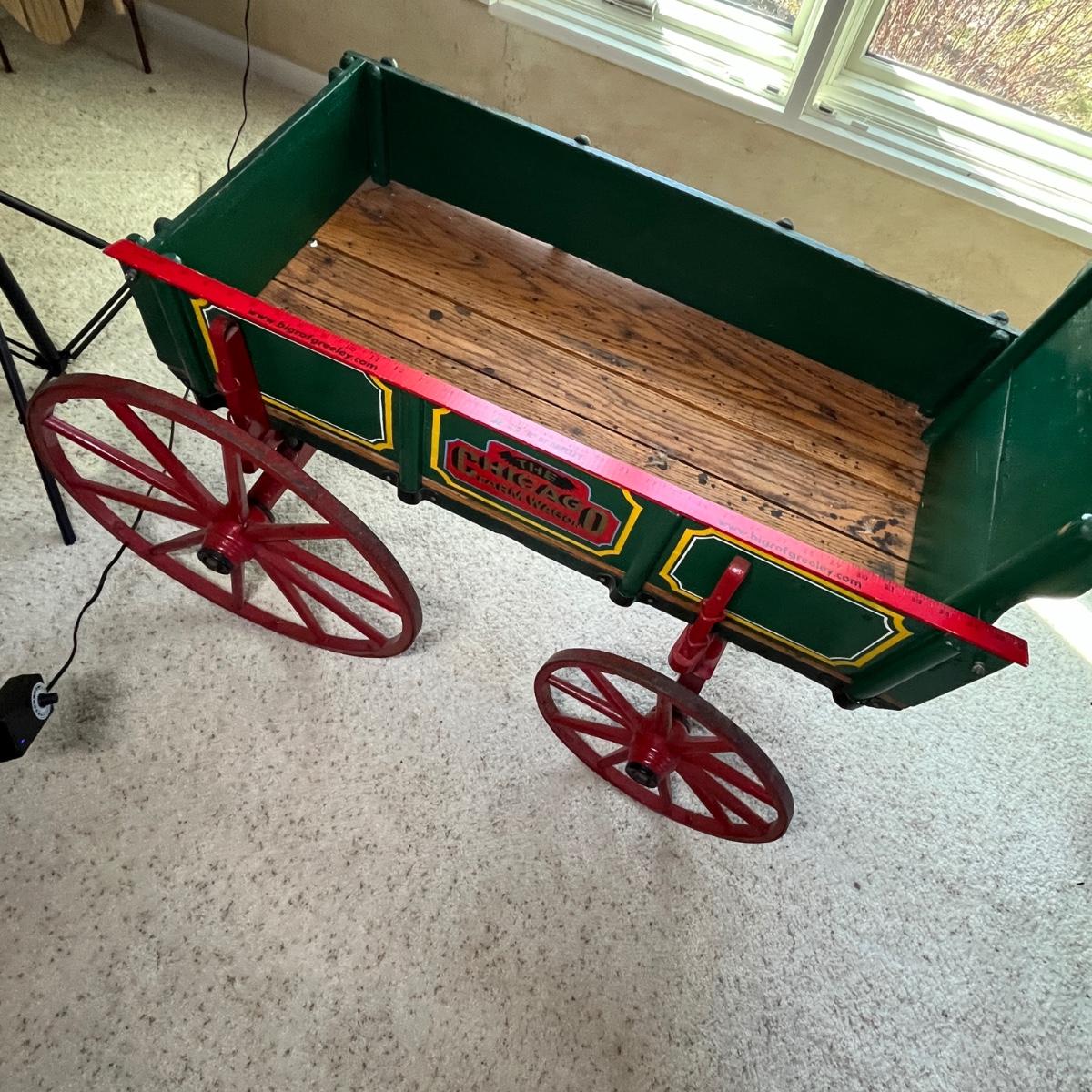 This is a fabulous wagon! Totally restored. Comes with yoke to attach doggie or goat! Also has the pull handle.