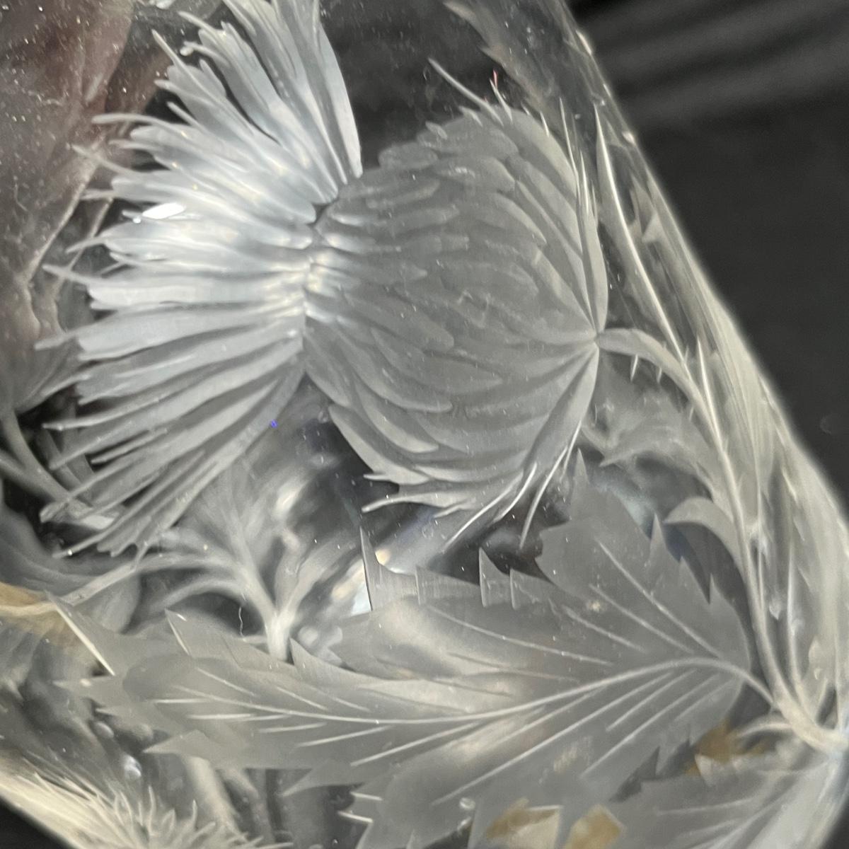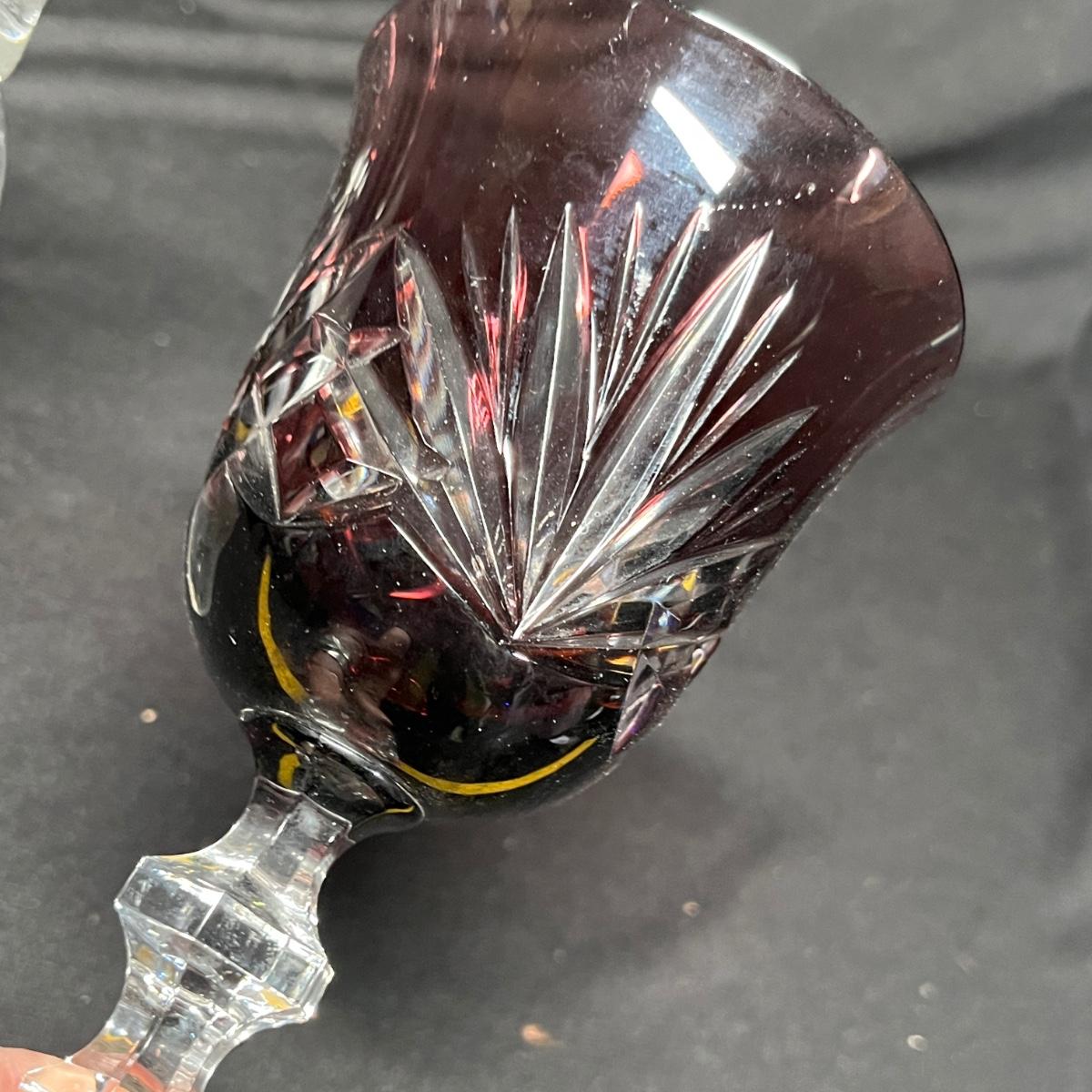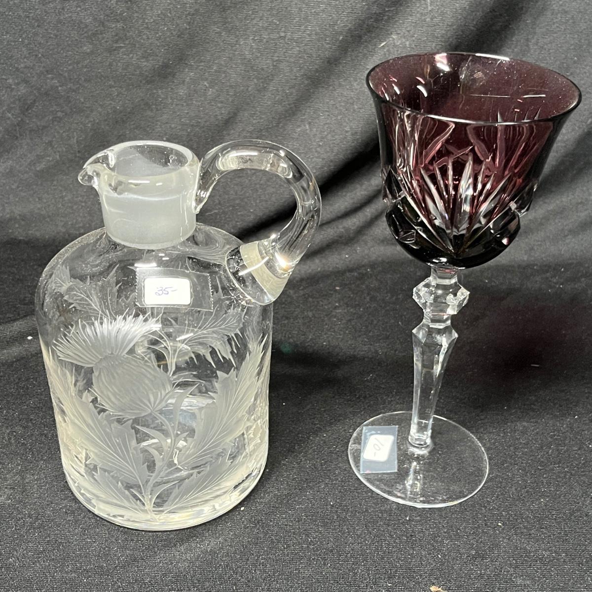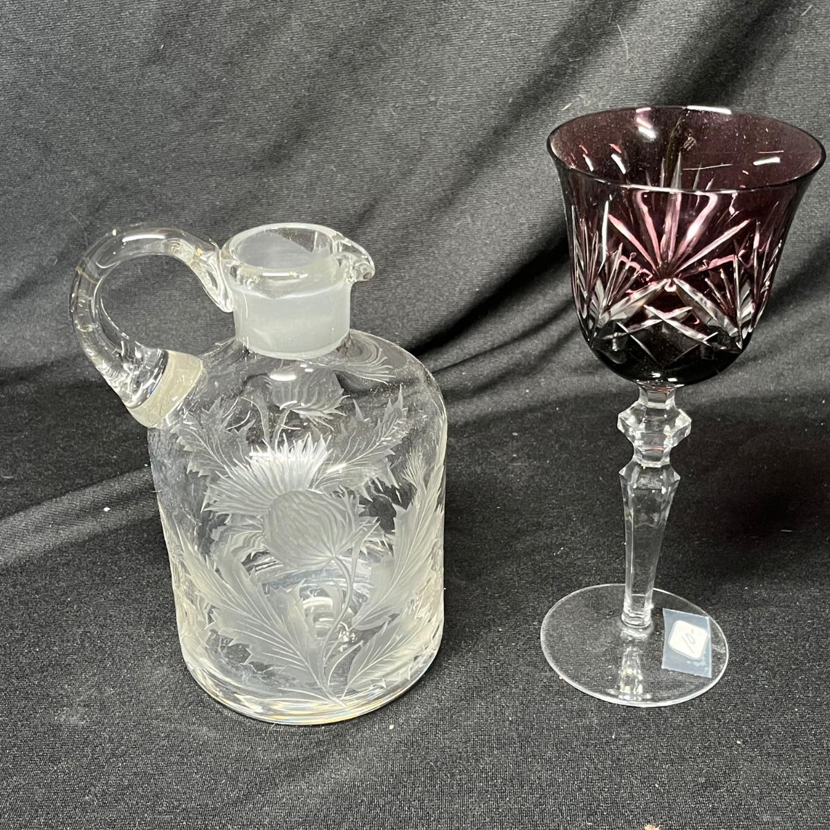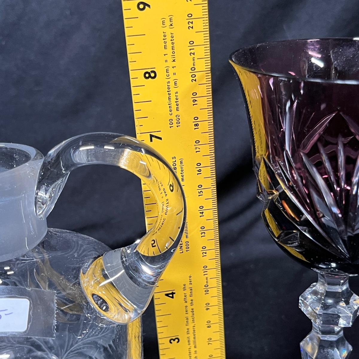 The decanter is missing the stopper. Wine glass is amethyst cut to clear.