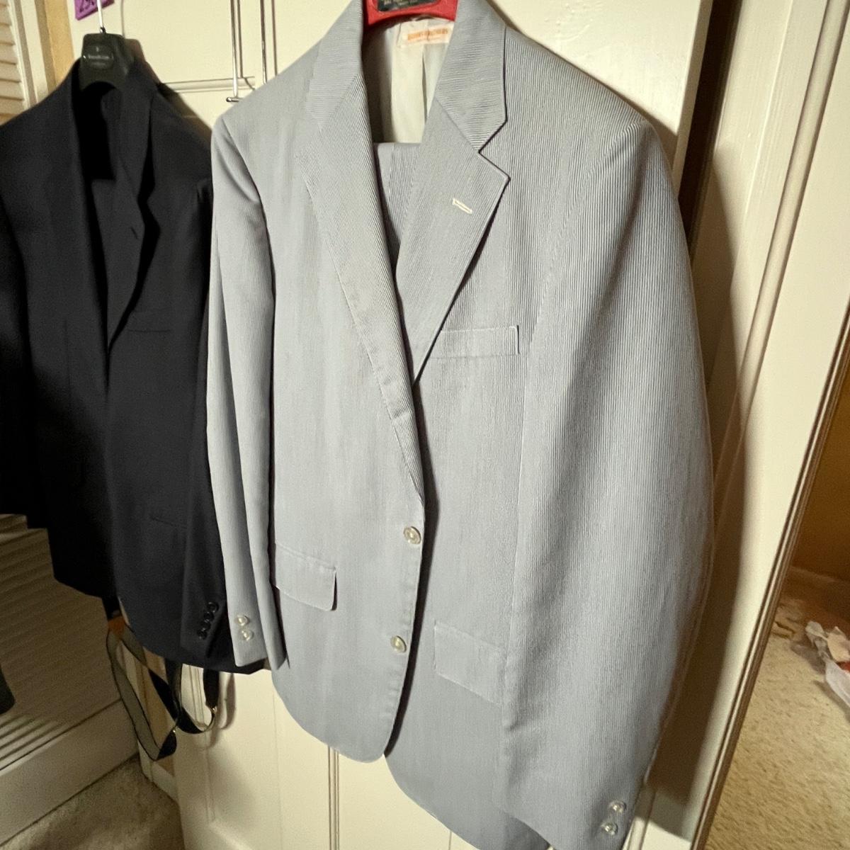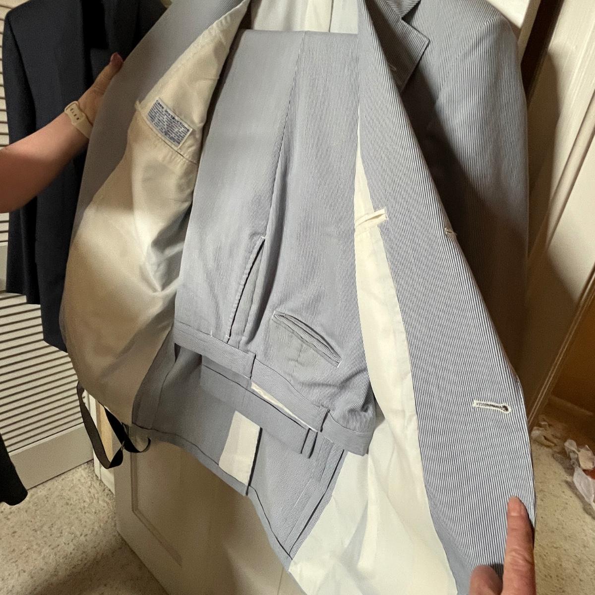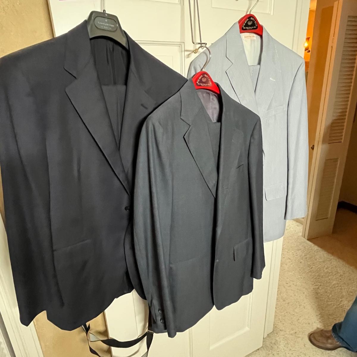 A note on Men's Clothing. Most suits are 42 or 44 R. Not all Blazers come with slacks. Slacks are 34. Shirts are 16, and shoes are 10-10.5