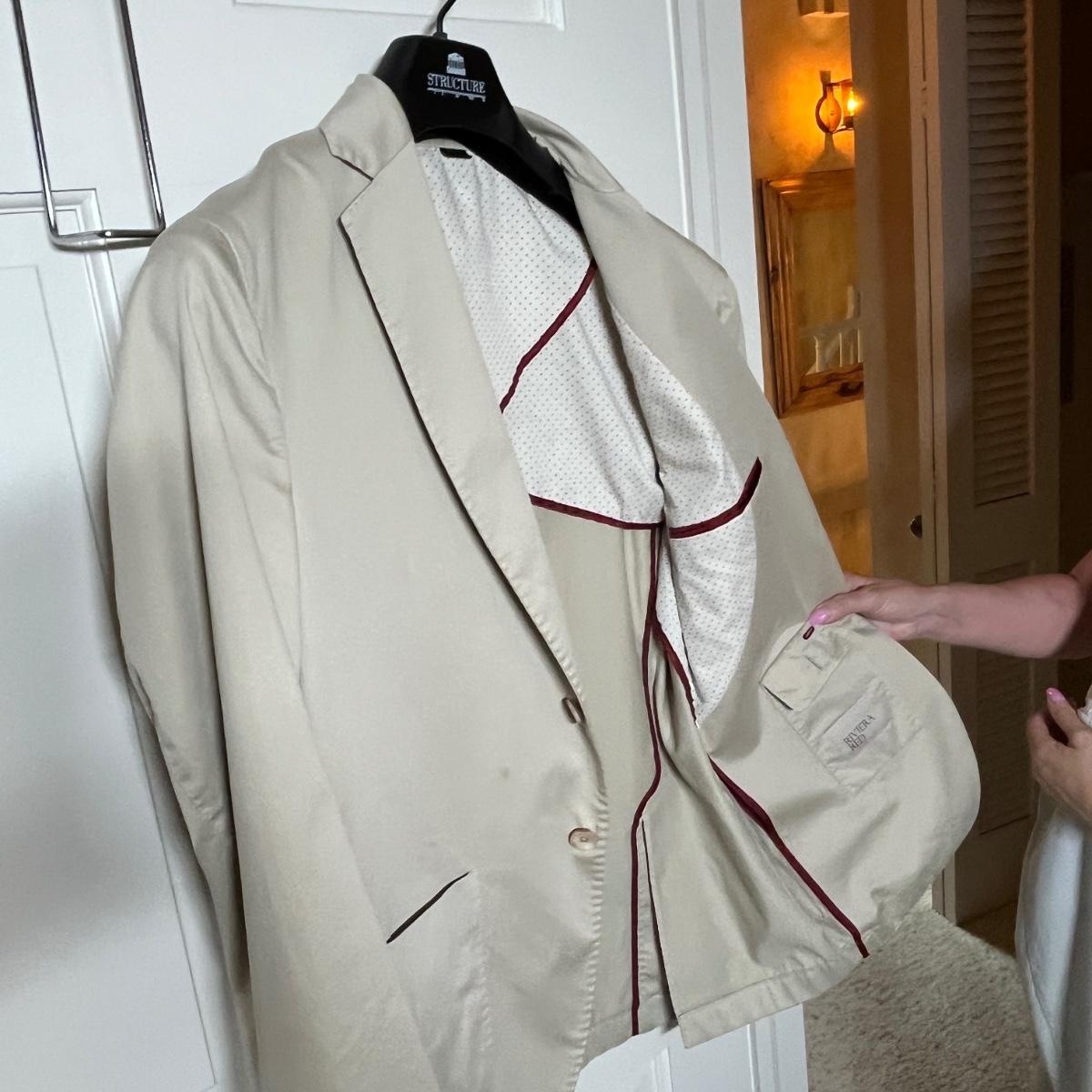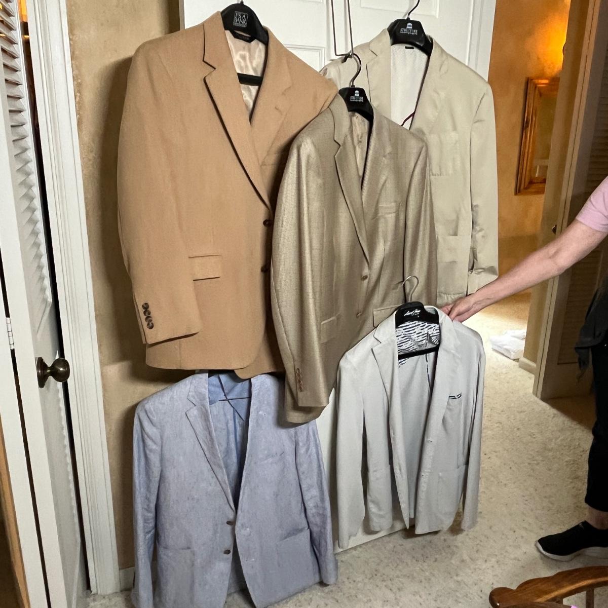A note on Men's Clothing. Most suits are 42 or 44 R. Not all Blazers come with slacks. Slacks are 34. Shirts are 16, and shoes are 10-10.5