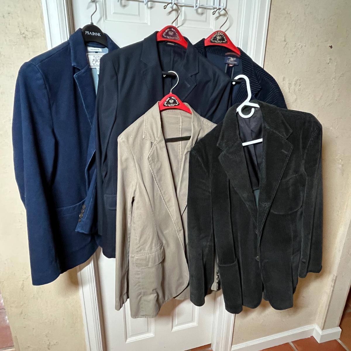 A note on Men's Clothing. Most suits are 42 or 44 R. Not all Blazers come with slacks. Slacks are 34. Shirts are 16, and shoes are 10-10.5