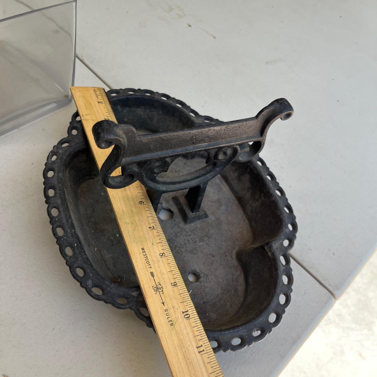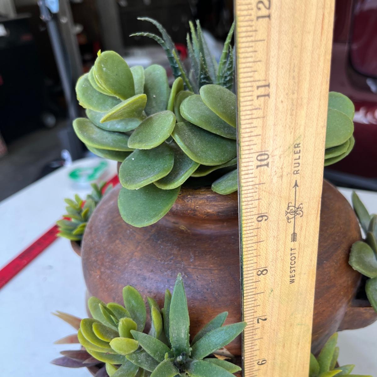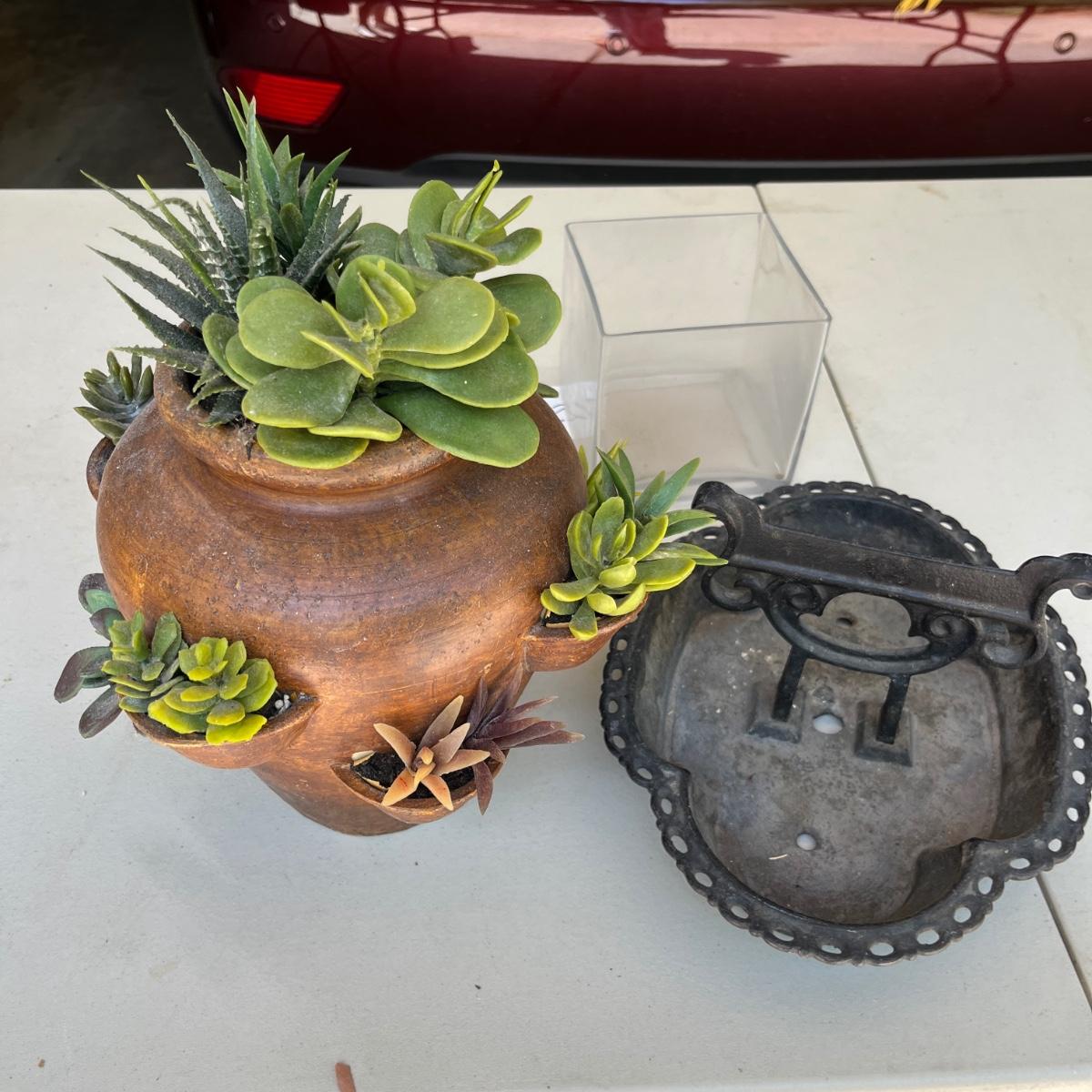 The boot scraper is cast metal. The terra cotta planter is filled with fake succulents.