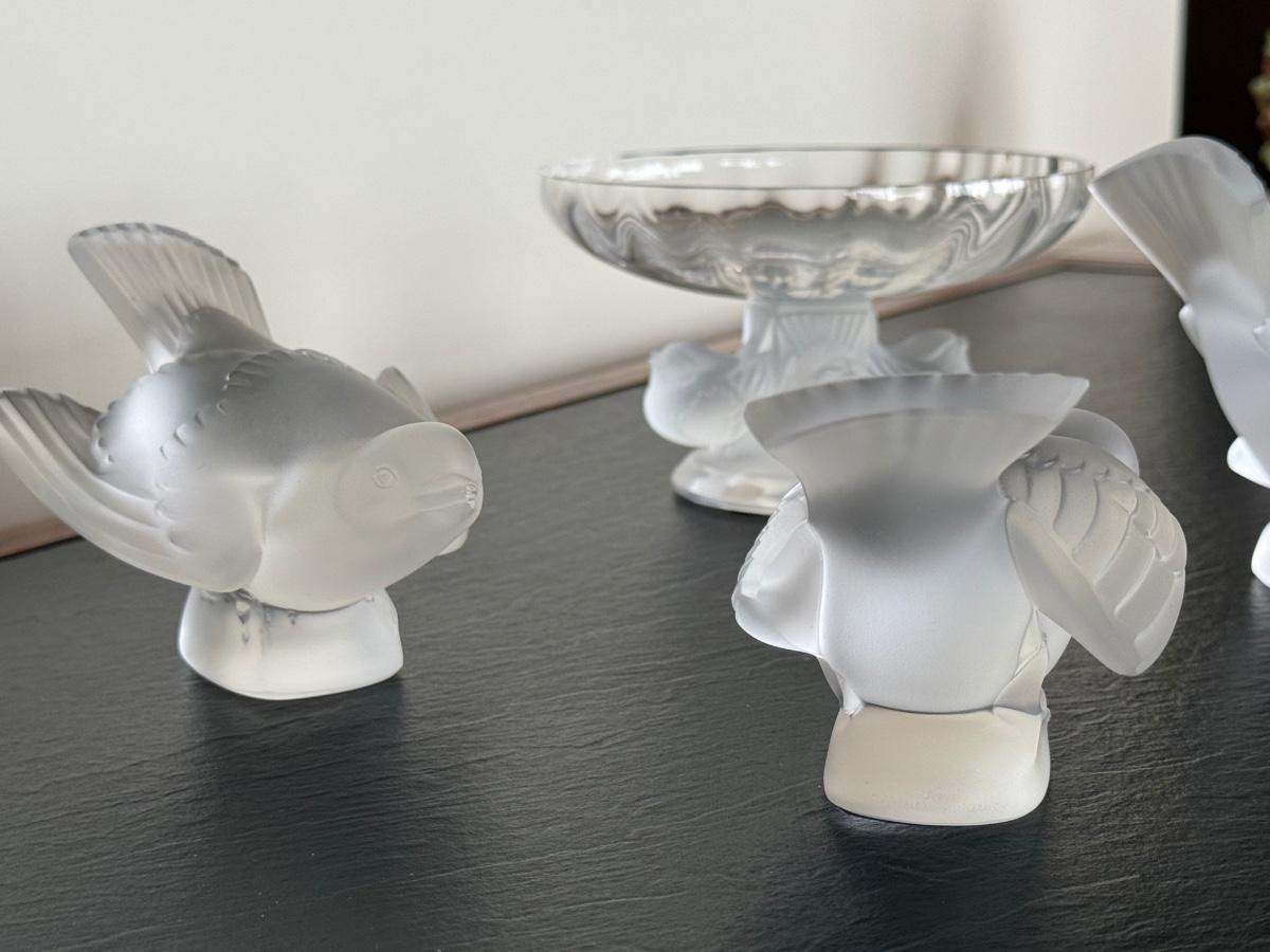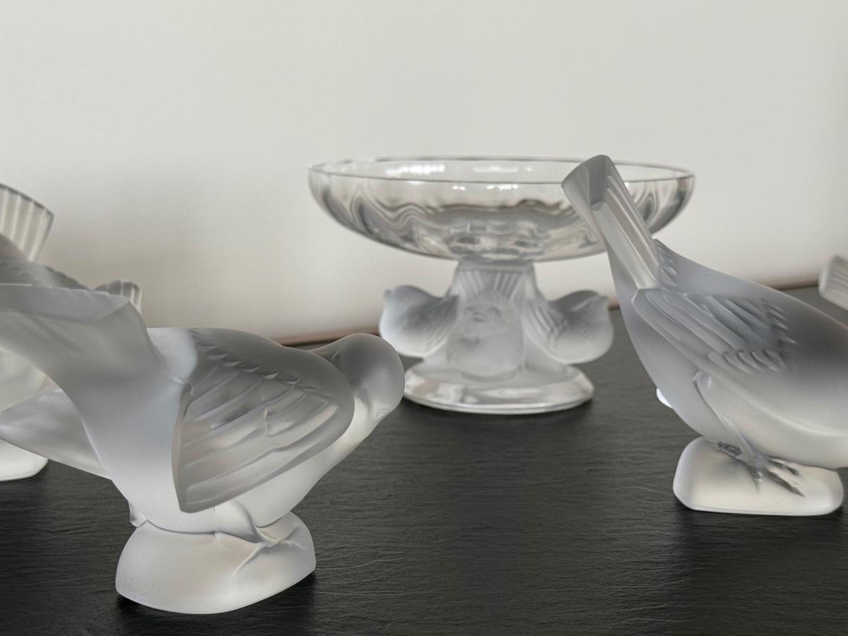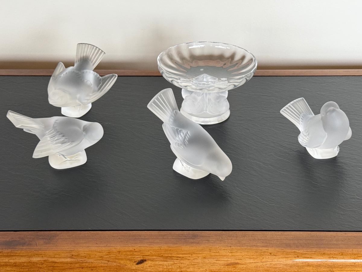 Mid-Century Lalique "Nogent" Crystal Compote w/ 4 Lalique Crystal Bird Figurines