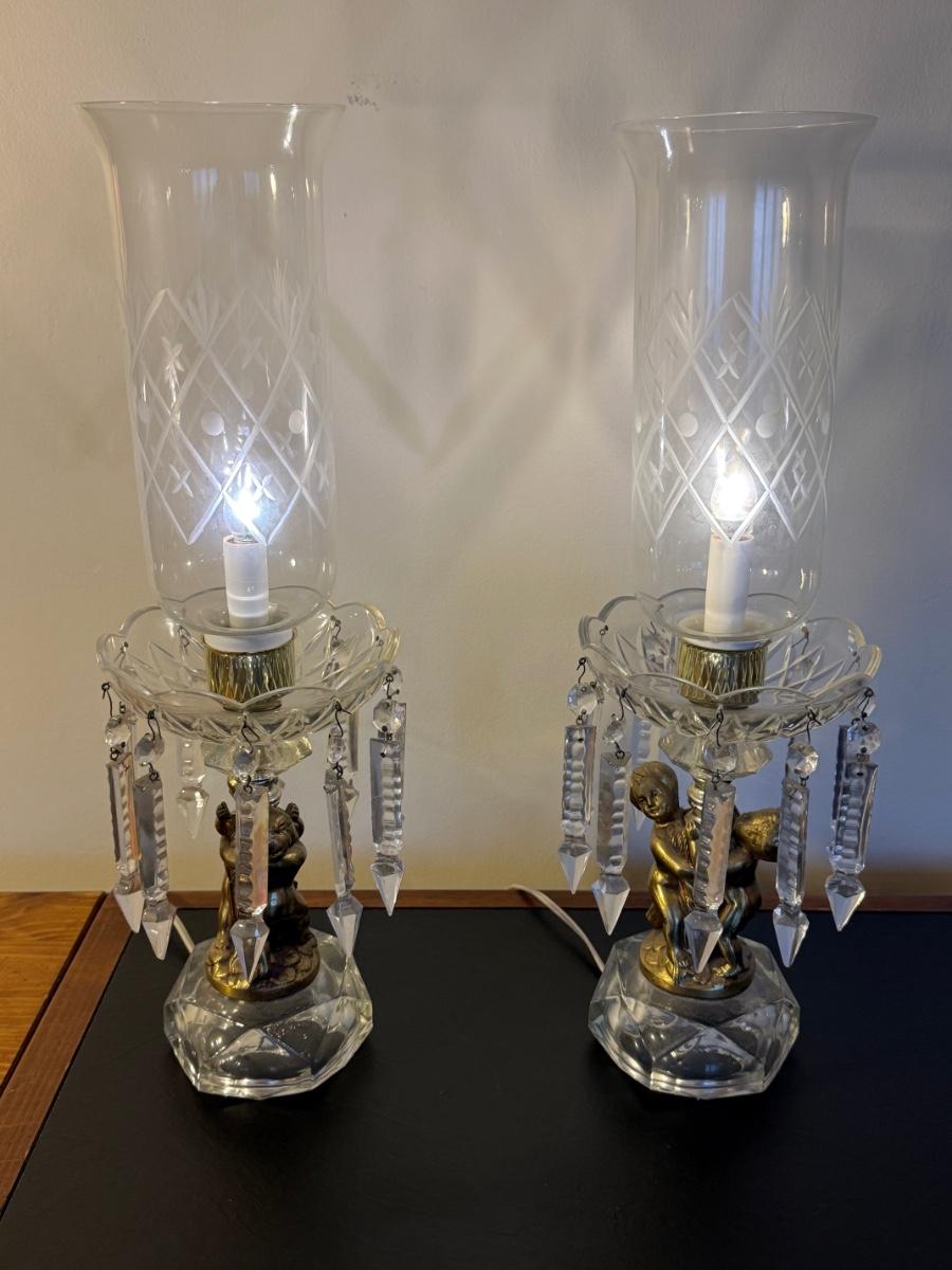 TWO Vintage Hollywood Regency Crystal Cherub Table Lamps w/ Prism Crystals