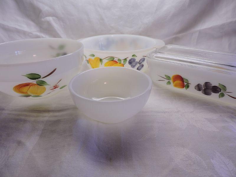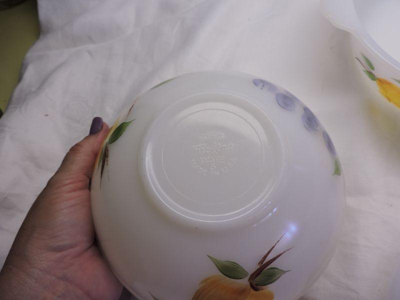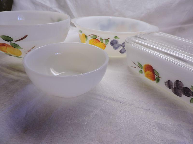 Vintage Fire King mixing bowls, loaf pan and more.Please review all photos and read Terms and Conditions before placing a bid. Pick up is Wednesday, November 20 from 4-7pm and Saturday, November 23 from 9am-2pm in Mantua, New Jersey. All sales are final. All sales are as is, where is. Please bring all boxes, tools, and muscle needed to remove your items. Any photo props are not included. All measurements are approximate. Items come from dog-friendly home.