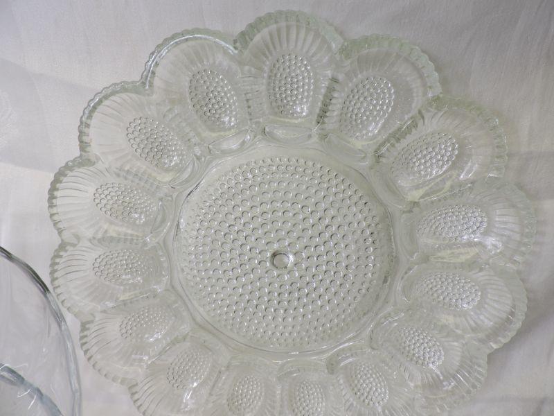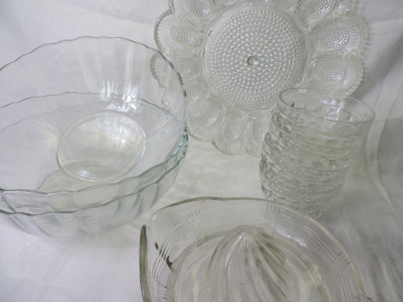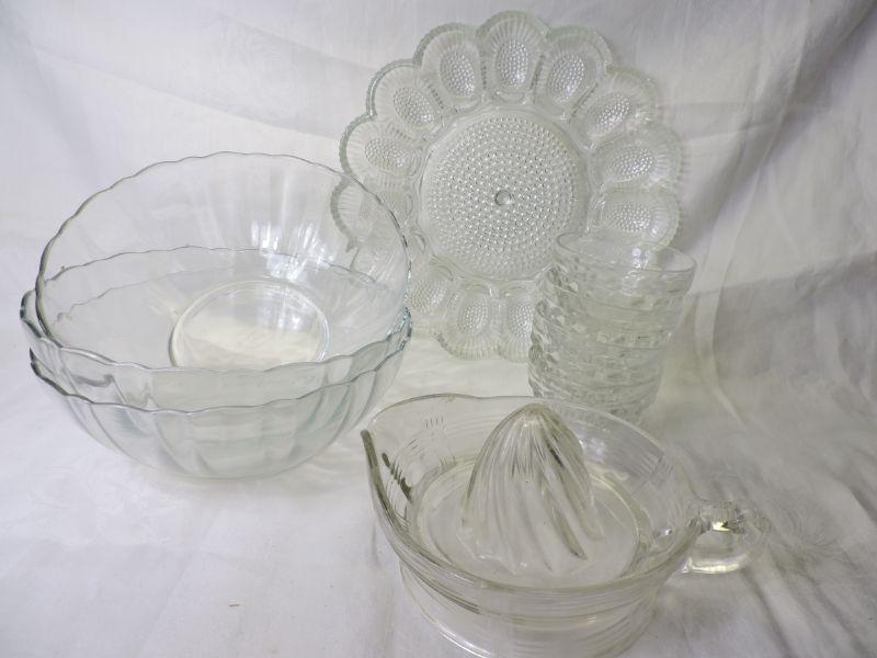 Vintage glass juicer, hobnail egg plate, glass custard bowls, glass serving bowls. Please review all photos and read Terms and Conditions before placing a bid. Pick up is Wednesday, November 20 from 4-7pm and Saturday, November 23 from 9am-2pm in Mantua, New Jersey. All sales are final. All sales are as is, where is. Please bring all boxes, tools, and muscle needed to remove your items. Any photo props are not included. All measurements are approximate. Items come from dog-friendly home.