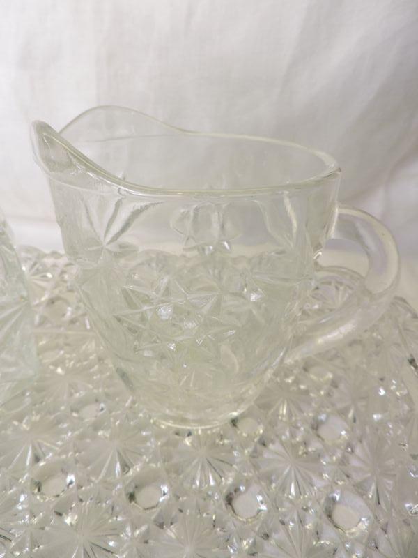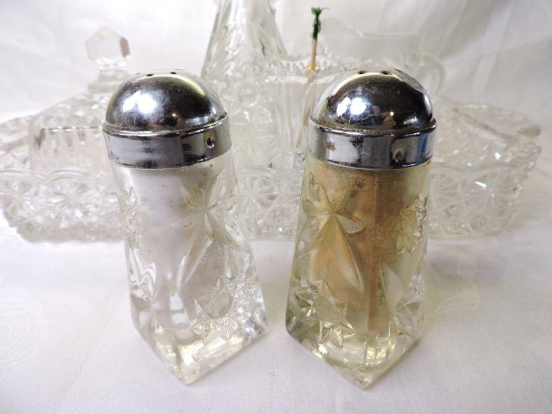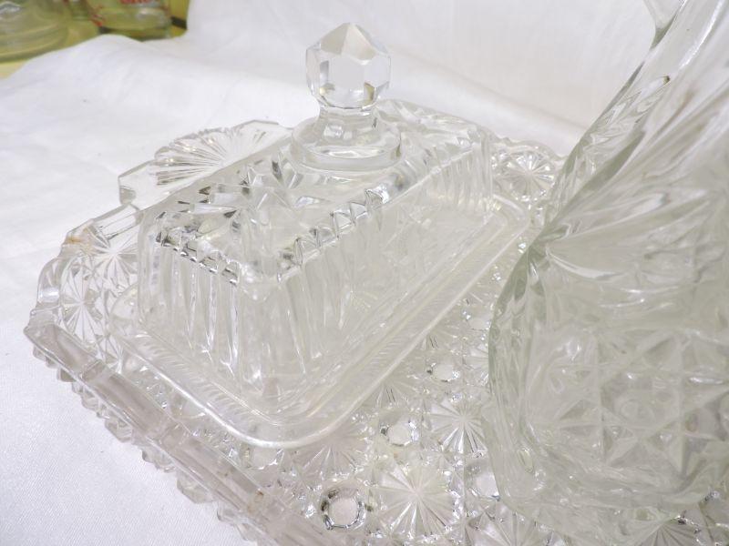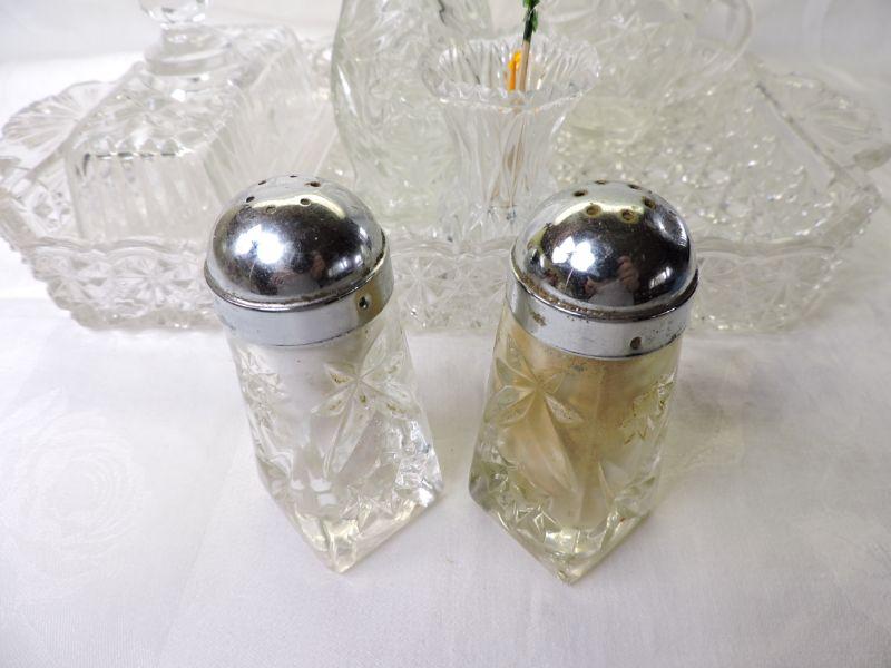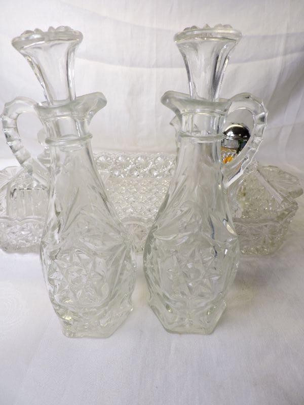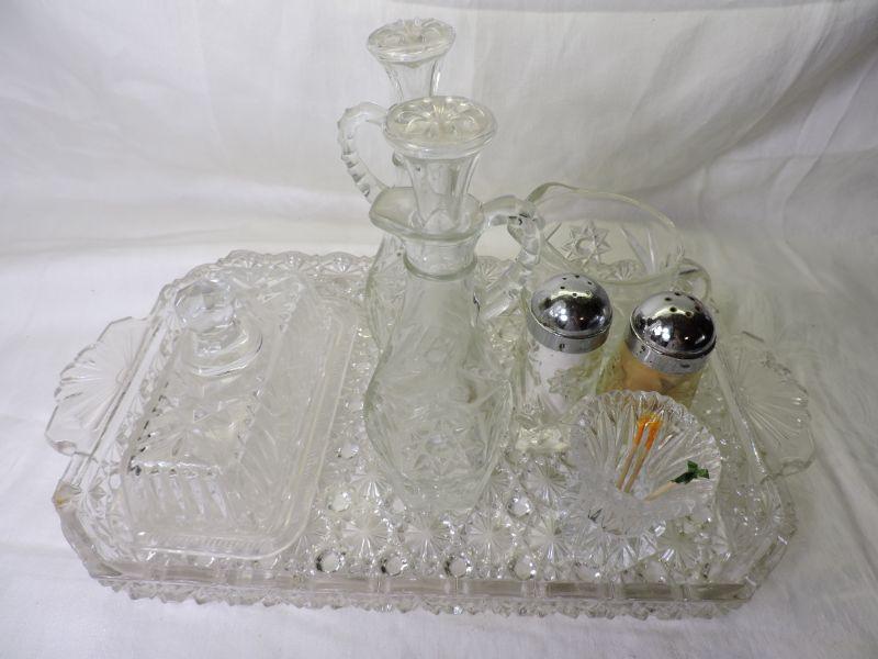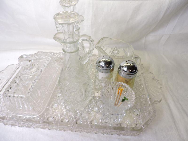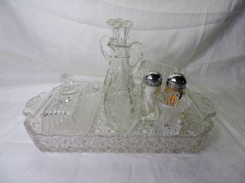 Butter dish, cruets, salt and pepper shakers, toothpick holder, all on a nice glass tray. Please review all photos and read Terms and Conditions before placing a bid. Pick up is Wednesday, November 20 from 4-7pm and Saturday, November 23 from 9am-2pm in Mantua, New Jersey. All sales are final. All sales are as is, where is. Please bring all boxes, tools, and muscle needed to remove your items. Any photo props are not included. All measurements are approximate. Items come from dog-friendly home.