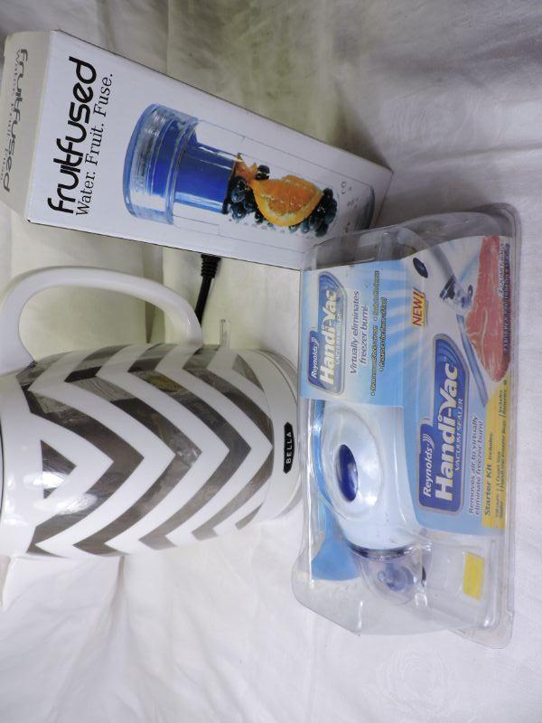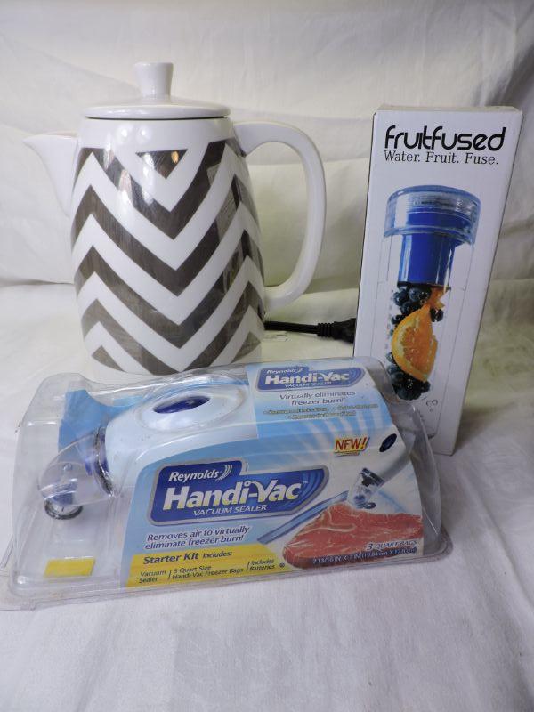 Handi Vac bag sealer, infuser, and electric pot, all untested. Please review all photos and read Terms and Conditions before placing a bid. Pick up is Wednesday, November 20 from 4-7pm and Saturday, November 23 from 9am-2pm in Mantua, New Jersey. All sales are final. All sales are as is, where is. Please bring all boxes, tools, and muscle needed to remove your items. Any photo props are not included. All measurements are approximate. Items come from dog-friendly home.