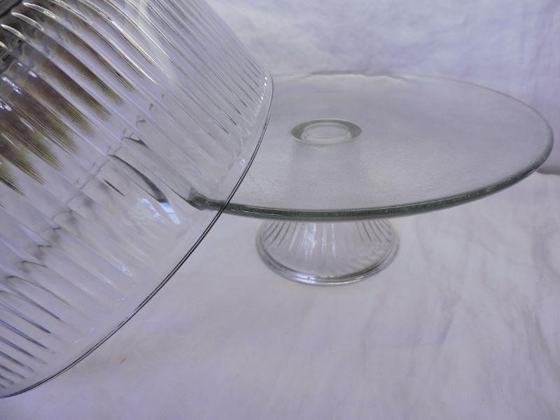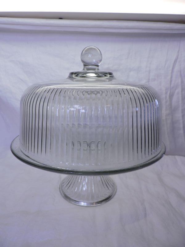 Glass cake holder on pedestal with fluted glass top. Please review all photos and read Terms and Conditions before placing a bid. Pick up is Wednesday, November 20 from 4-7pm and Saturday, November 23 from 9am-2pm in Mantua, New Jersey. All sales are final. All sales are as is, where is. Please bring all boxes, tools, and muscle needed to remove your items. Any photo props are not included. All measurements are approximate. Items come from dog-friendly home.