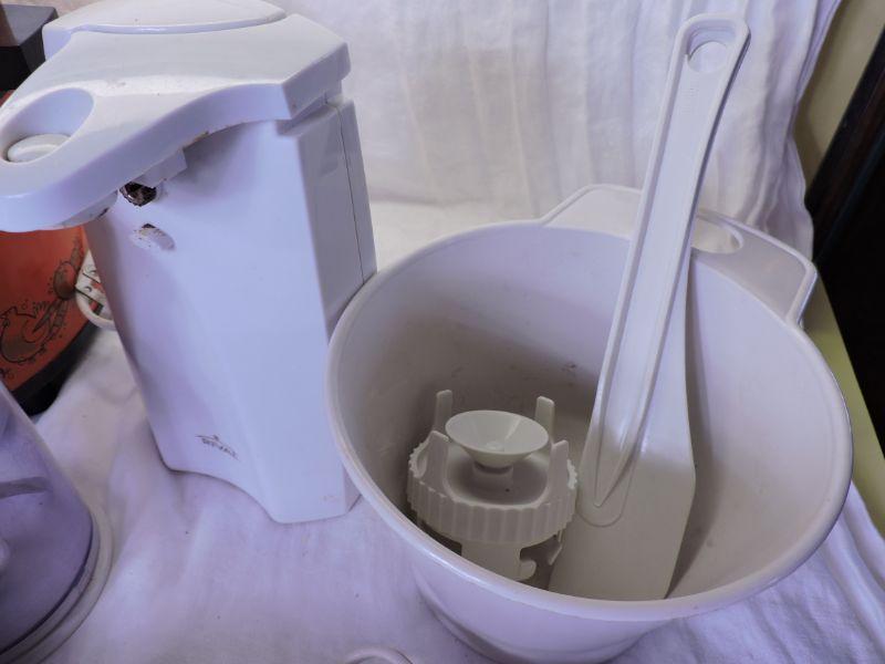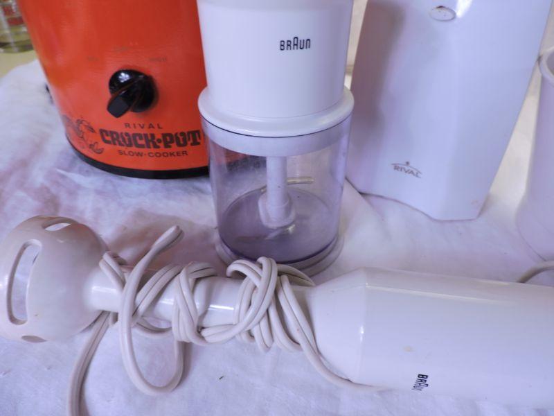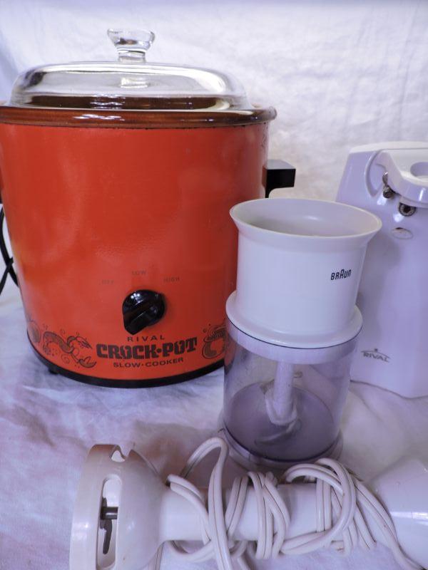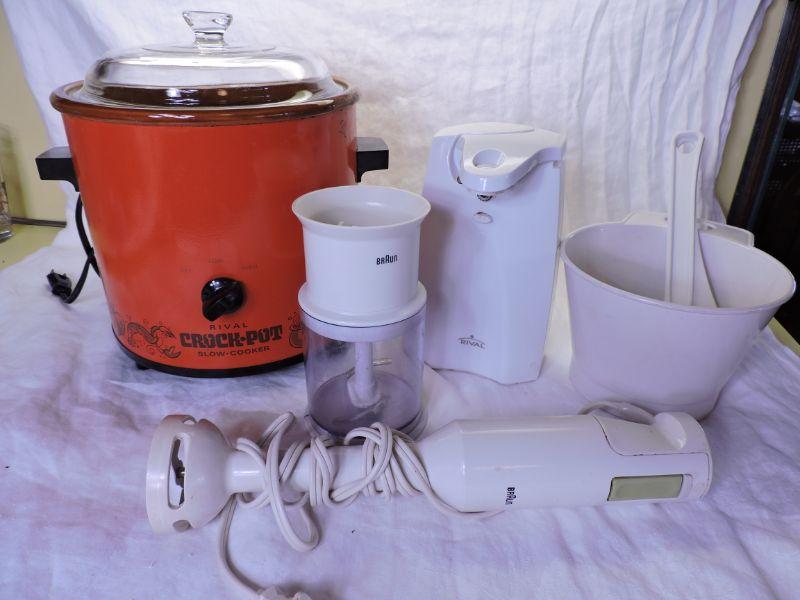Rival Crock Pot, Braun mixer and chopper, and a Rival electric can opener, all untested. Please review all photos and read Terms and Conditions before placing a bid. Pick up is Wednesday, November 20 from 4-7pm and Saturday, November 23 from 9am-2pm in Mantua, New Jersey. All sales are final. All sales are as is, where is. Please bring all boxes, tools, and muscle needed to remove your items. Any photo props are not included. All measurements are approximate. Items come from dog-friendly home.