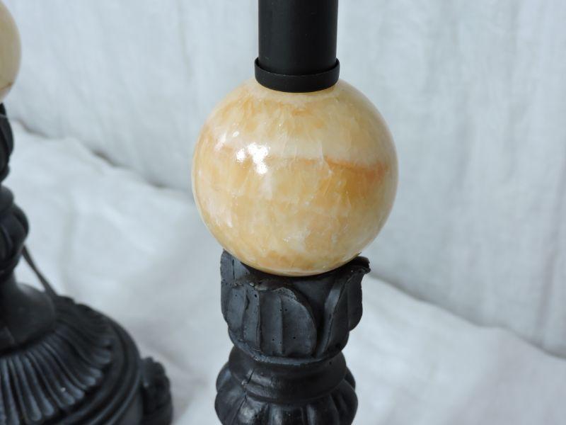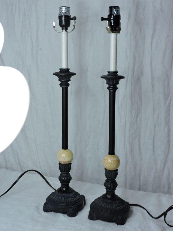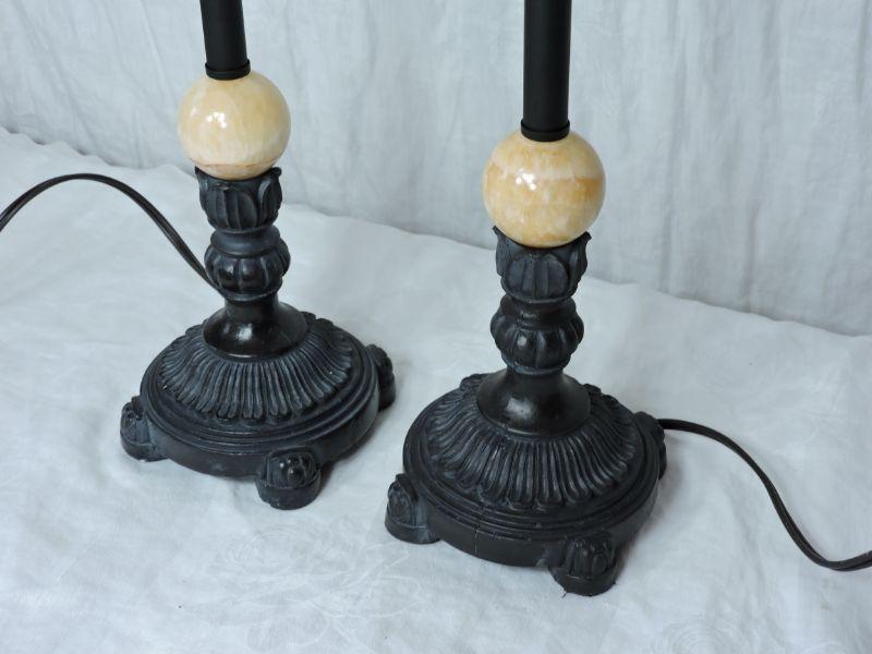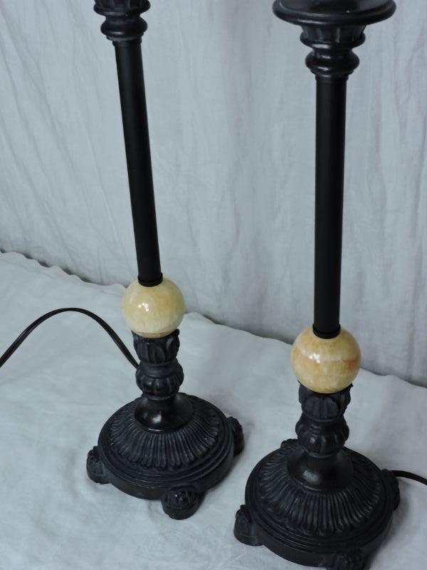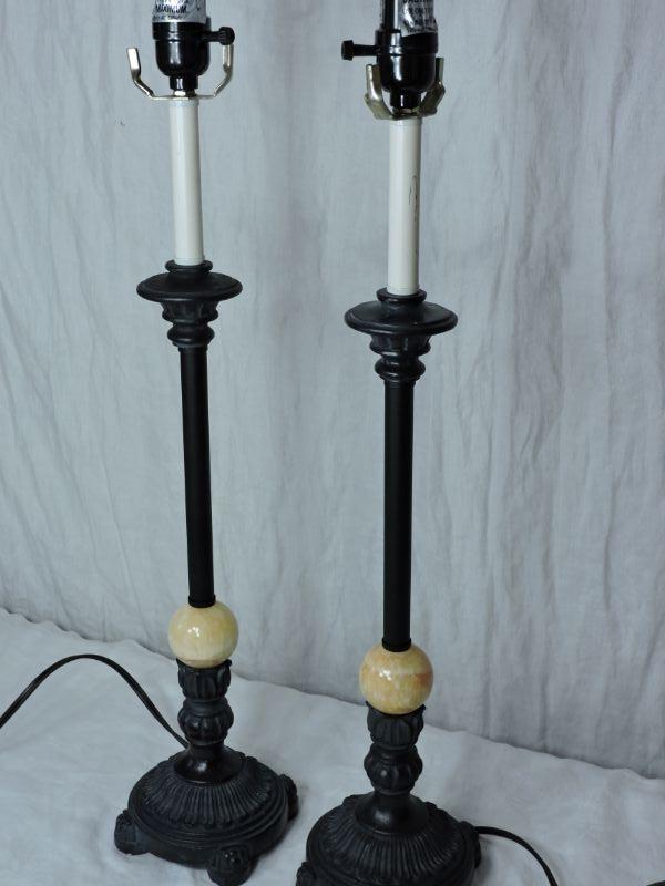 Two wrought iron lamps with marble accent. No shades, untested. Please review all photos and read Terms and Conditions before placing a bid. Pick up is Wednesday, November 20 from 4-7pm and Saturday, November 23 from 9am-2pm in Mantua, New Jersey. All sales are final. All sales are as is, where is. Please bring all boxes, tools, and muscle needed to remove your items. Any photo props are not included. All measurements are approximate. Items come from dog-friendly home.