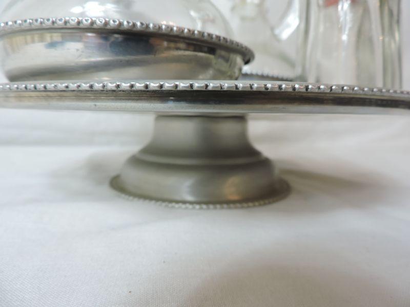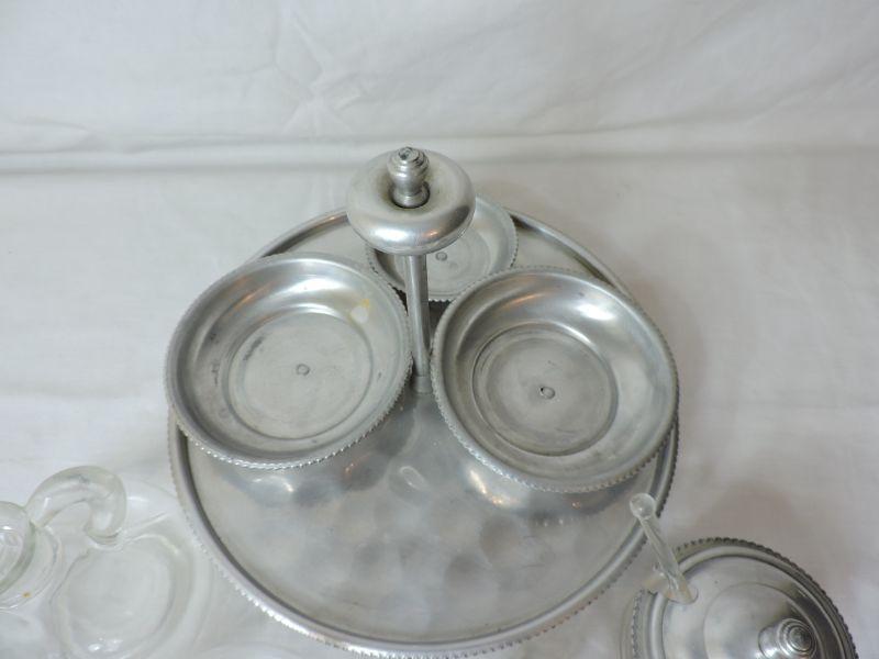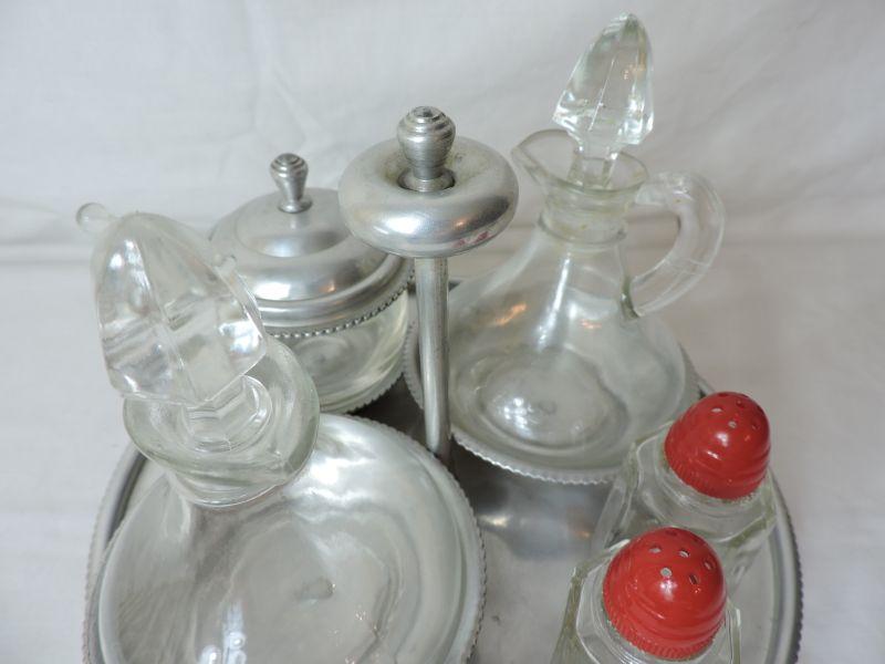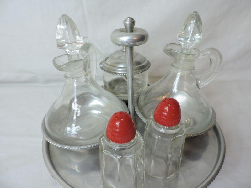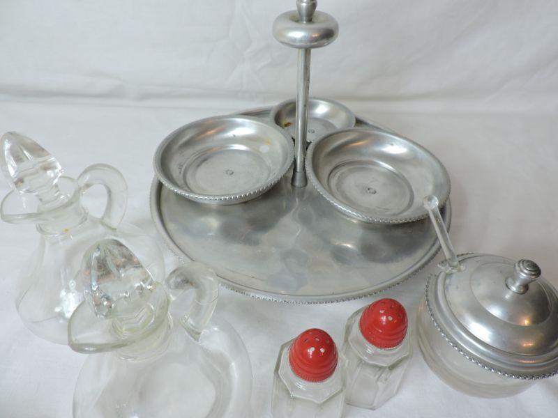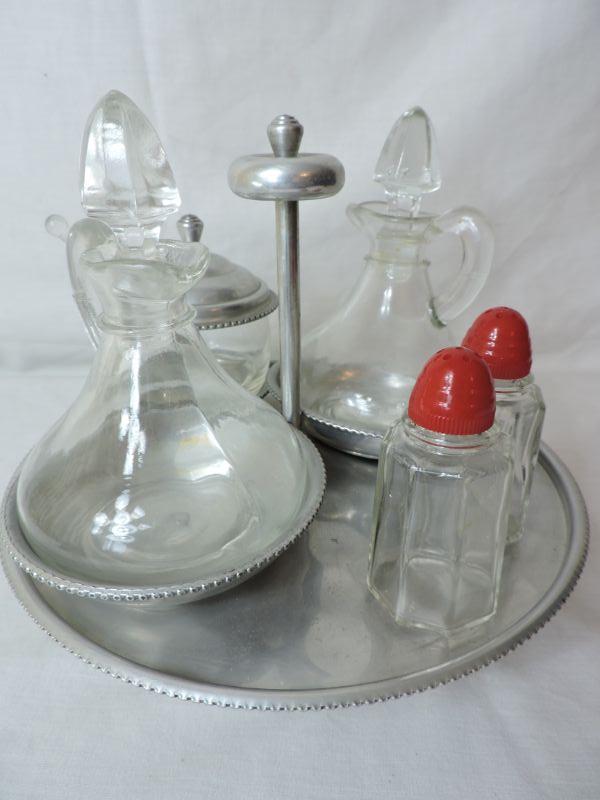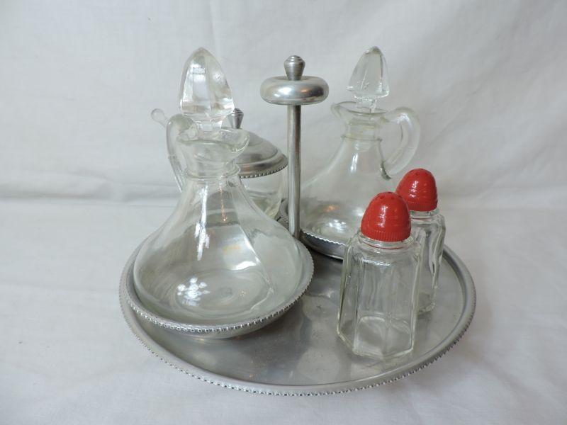 Vintagae aluminum tray with salt and pepper shakers, sugar bowl, and two cruets. Please review all photos and read Terms and Conditions before placing a bid. Pick up is Wednesday, November 20 from 4-7pm and Saturday, November 23 from 9am-2pm in Mantua, New Jersey. All sales are final. All sales are as is, where is. Please bring all boxes, tools, and muscle needed to remove your items. Any photo props are not included. All measurements are approximate. Items come from dog-friendly home.