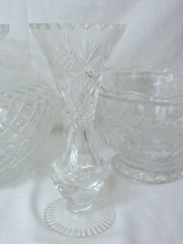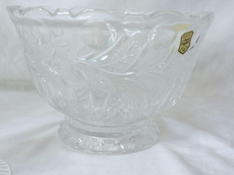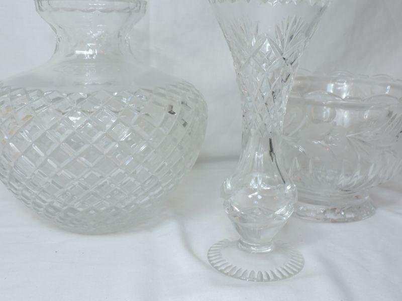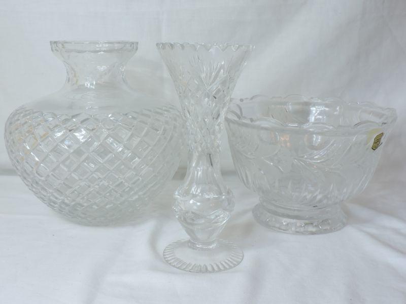 Hand cut crystal bowl and two vases. Please review all photos and read Terms and Conditions before placing a bid. Pick up is Wednesday, November 20 from 4-7pm and Saturday, November 23 from 9am-2pm in Mantua, New Jersey. All sales are final. All sales are as is, where is. Please bring all boxes, tools, and muscle needed to remove your items. Any photo props are not included. All measurements are approximate. Items come from dog-friendly home.