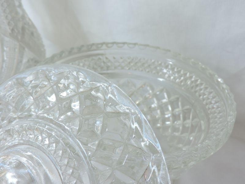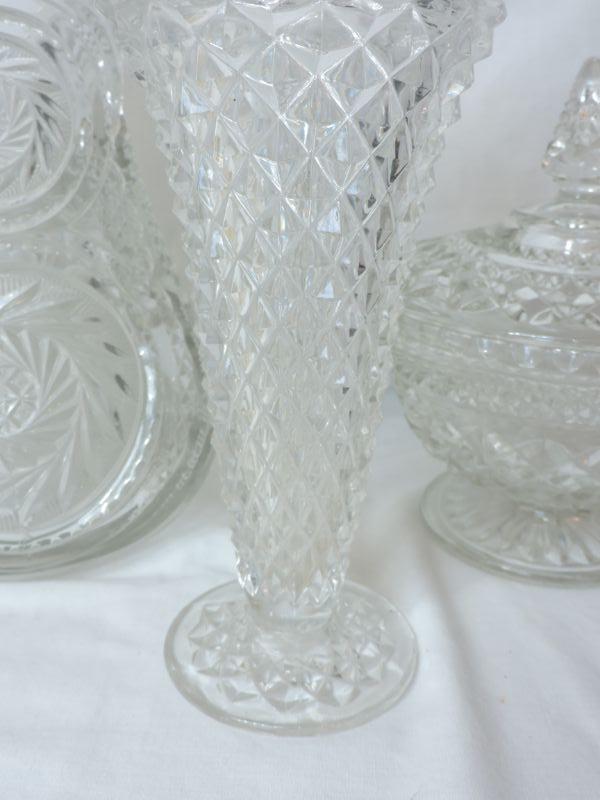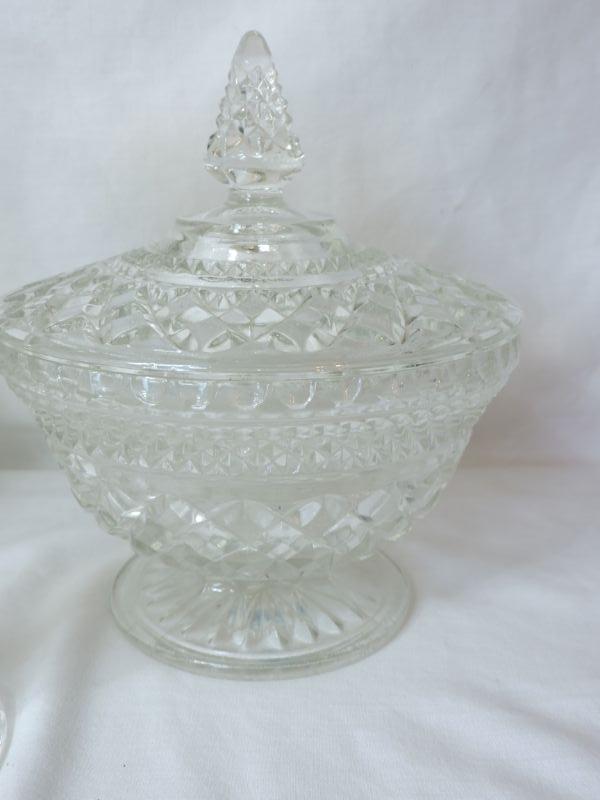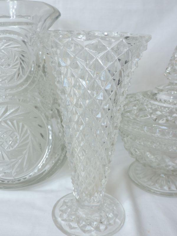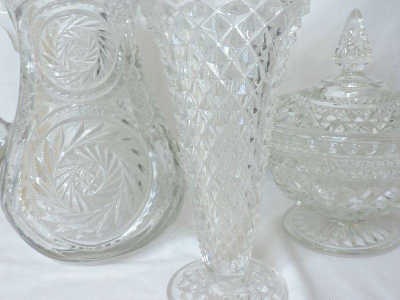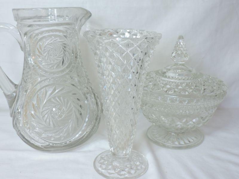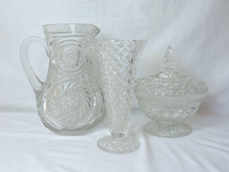 Candy dish with lid, a vase, and a pitcher. Please review all photos and read Terms and Conditions before placing a bid. Pick up is Wednesday, November 20 from 4-7pm and Saturday, November 23 from 9am-2pm in Mantua, New Jersey. All sales are final. All sales are as is, where is. Please bring all boxes, tools, and muscle needed to remove your items. Any photo props are not included. All measurements are approximate. Items come from dog-friendly home.