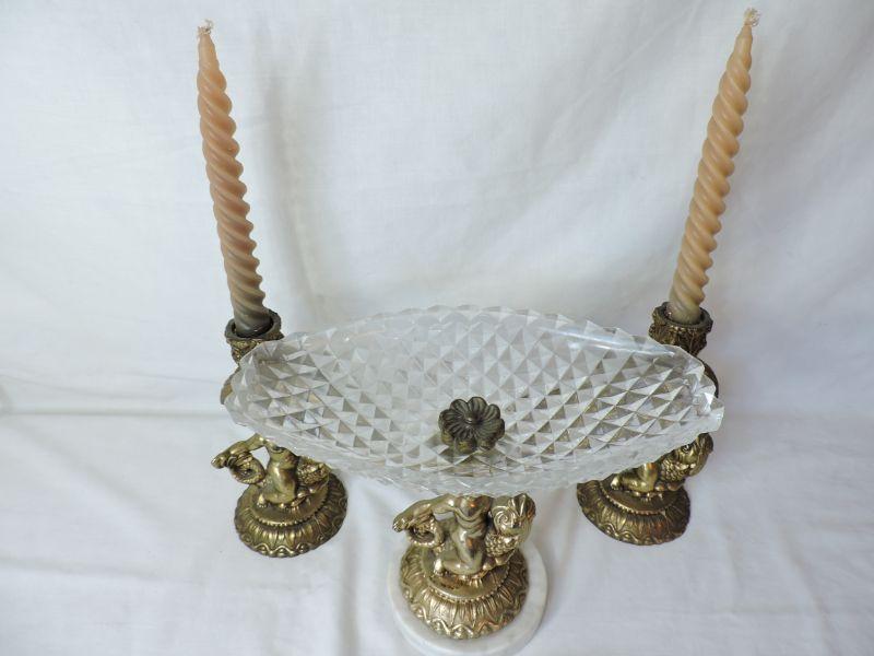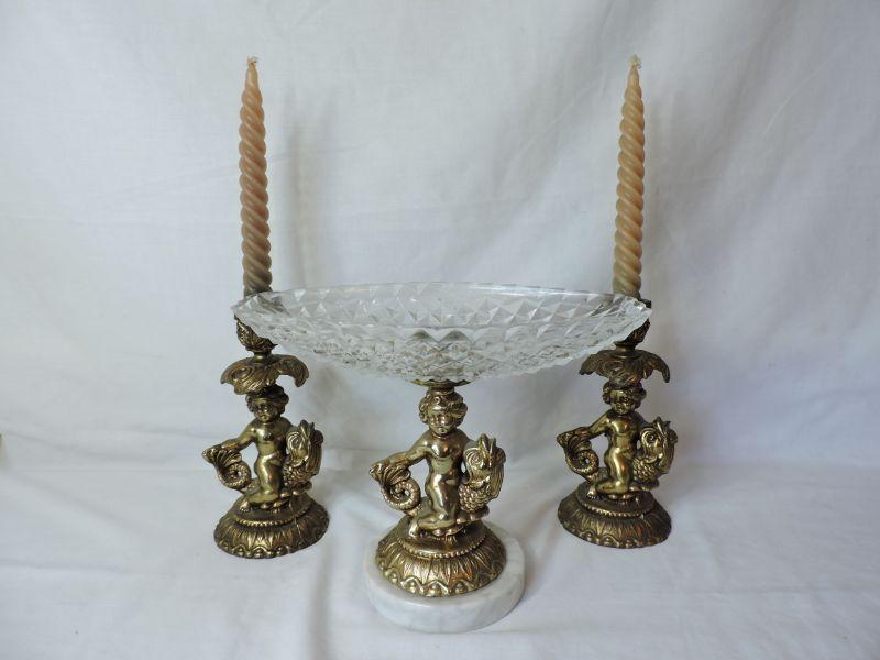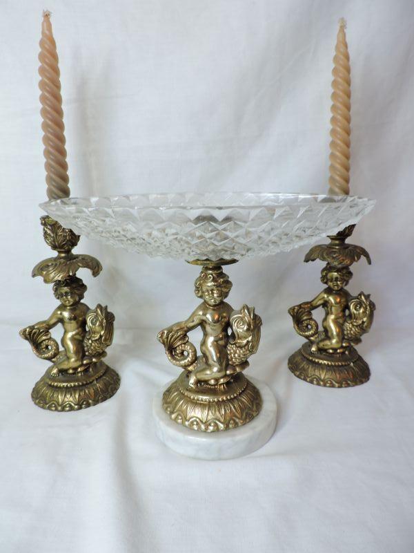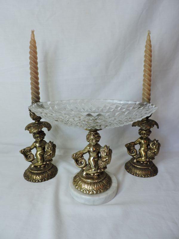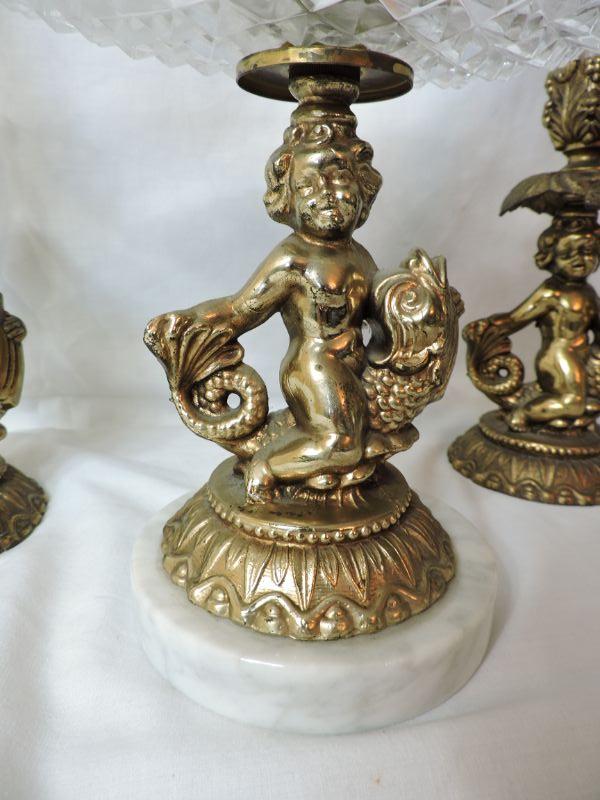 Brass and glass cherub candy dish, and two brass candle holders. Please review all photos and read Terms and Conditions before placing a bid. Pick up is Wednesday, November 20 from 4-7pm and Saturday, November 23 from 9am-2pm in Mantua, New Jersey. All sales are final. All sales are as is, where is. Please bring all boxes, tools, and muscle needed to remove your items. Any photo props are not included. All measurements are approximate. Items come from dog-friendly home.