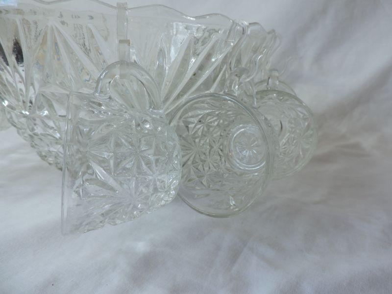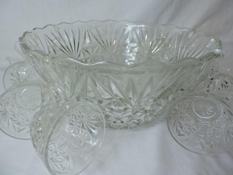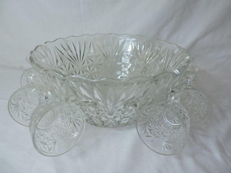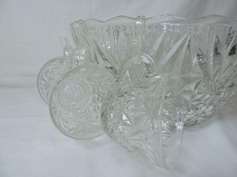 Glass punch bowl with six cups. Great for parties. Please review all photos and read Terms and Conditions before placing a bid. Pick up is Wednesday, November 20 from 4-7pm and Saturday, November 23 from 9am-2pm in Mantua, New Jersey. All sales are final. All sales are as is, where is. Please bring all boxes, tools, and muscle needed to remove your items. Any photo props are not included. All measurements are approximate. Items come from dog-friendly home.