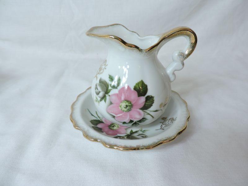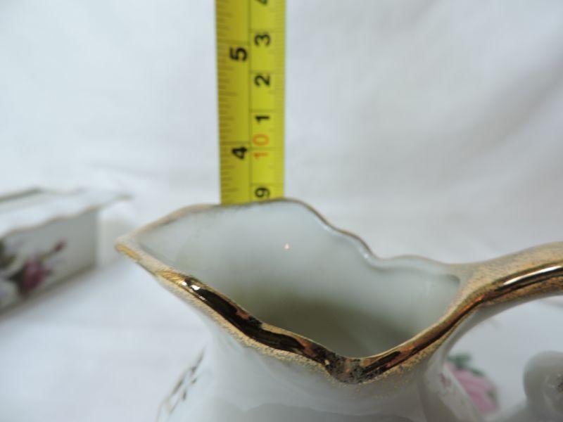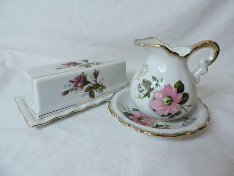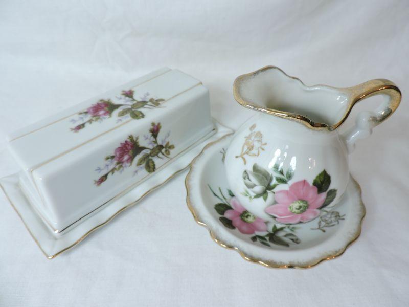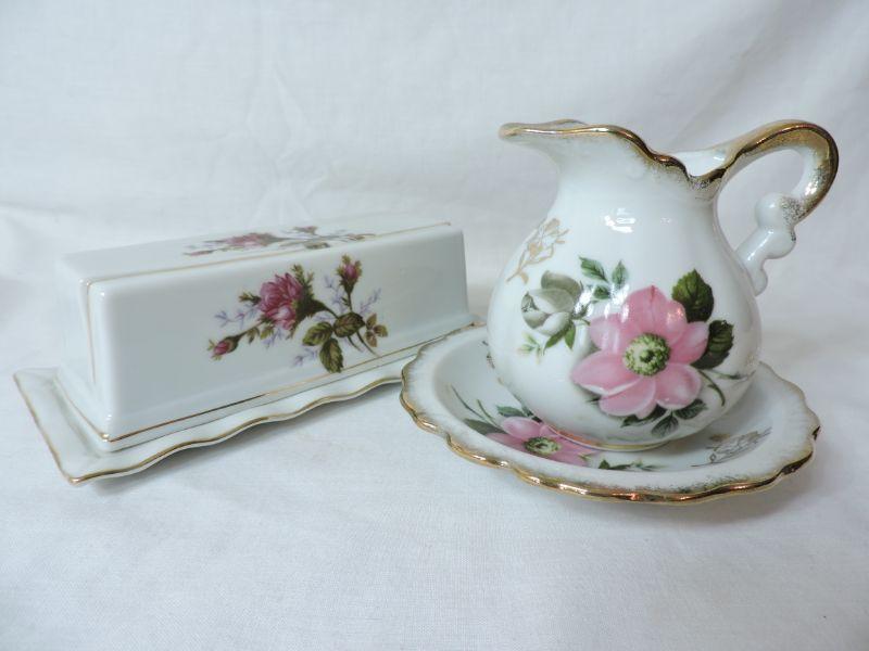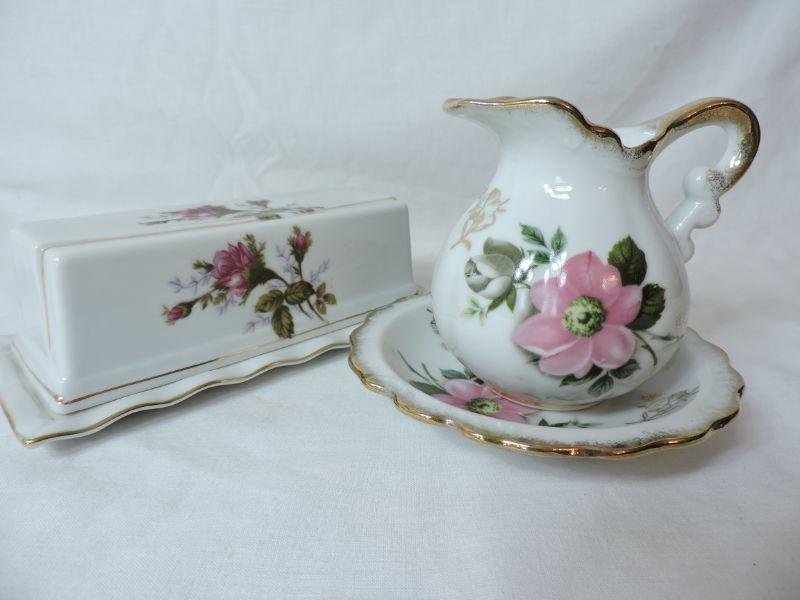 Vintage butter dish with pink flower designs, and a small pitcher with a saucer. Please review all photos and read Terms and Conditions before placing a bid. Pick up is Wednesday, November 20 from 4-7pm and Saturday, November 23 from 9am-2pm in Mantua, New Jersey. All sales are final. All sales are as is, where is. Please bring all boxes, tools, and muscle needed to remove your items. Any photo props are not included. All measurements are approximate. Items come from dog-friendly home.