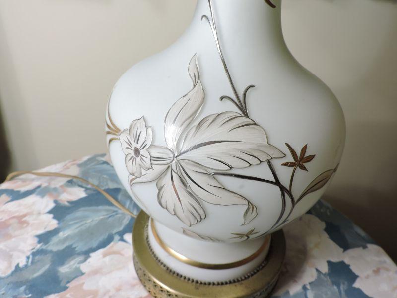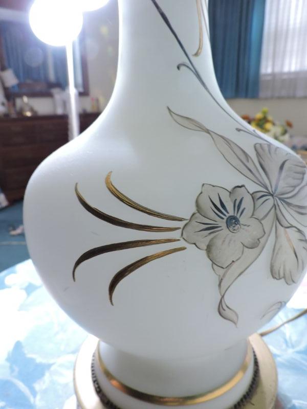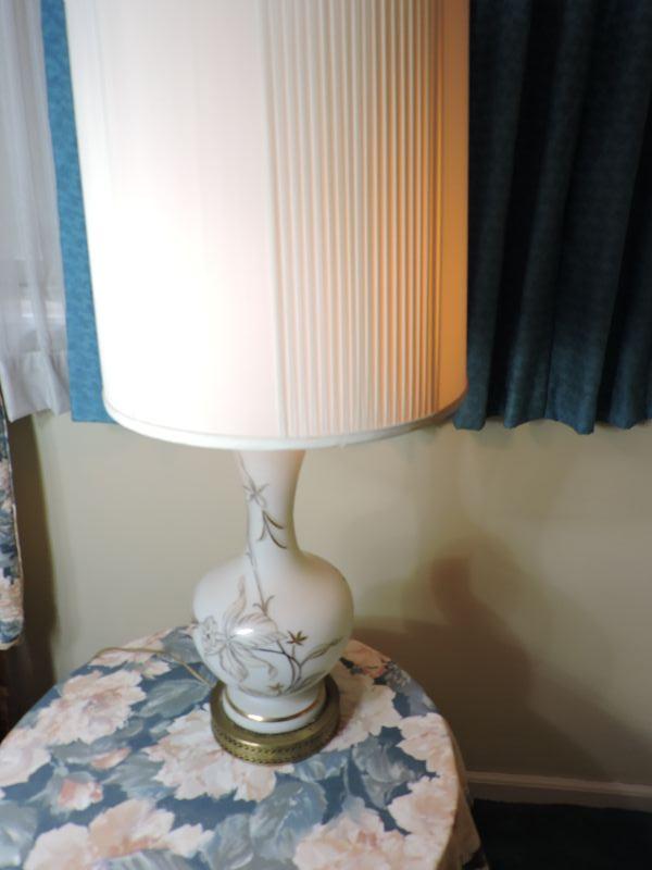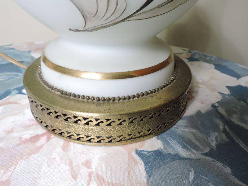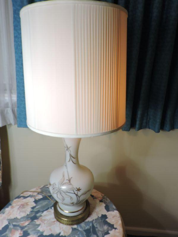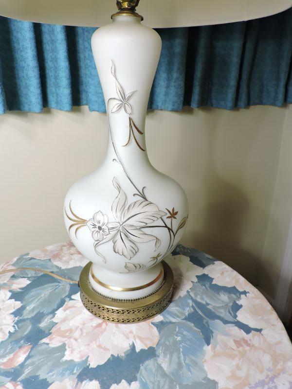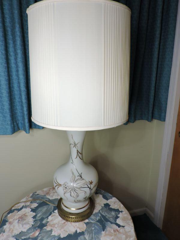Mid Century table lamp with gold painted metal base, and gold painted flower on white ceramic. Please review all photos and read Terms and Conditions before placing a bid. Pick up is Wednesday, November 20 from 4-7pm and Saturday, November 23 from 9am-2pm in Mantua, New Jersey. All sales are final. All sales are as is, where is. Please bring all boxes, tools, and muscle needed to remove your items. Any photo props are not included. All measurements are approximate. Items come from dog-friendly home.