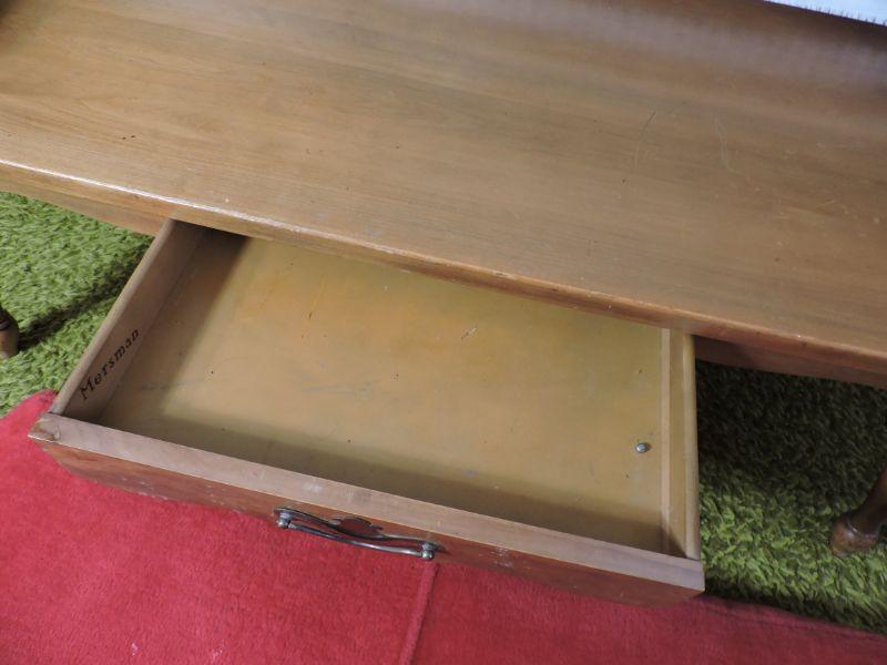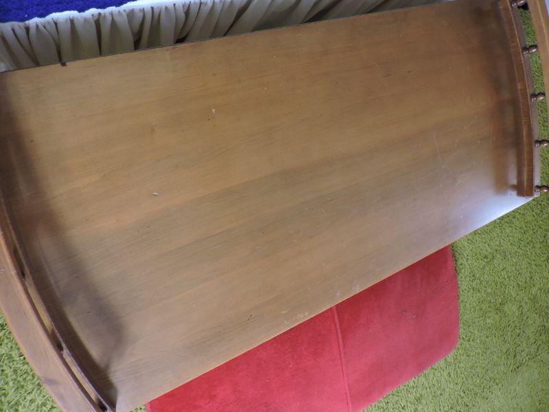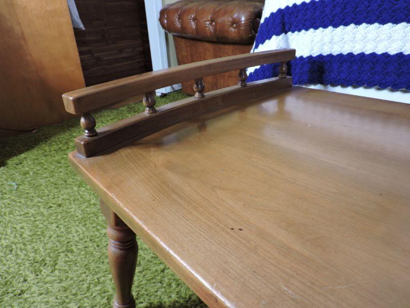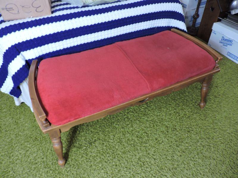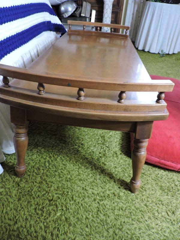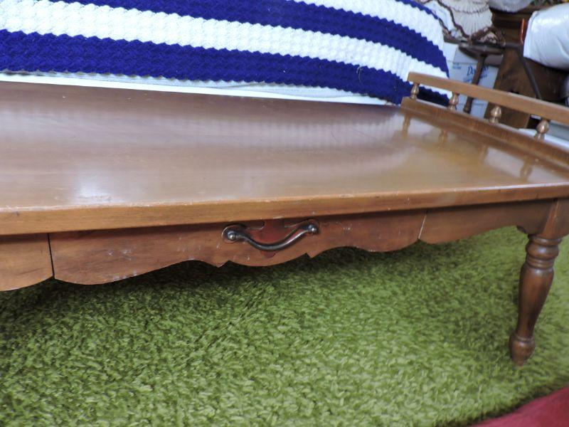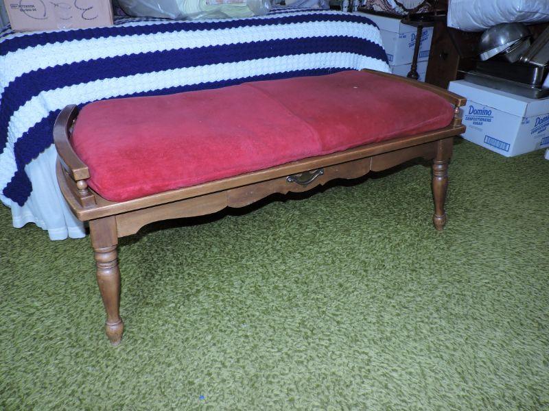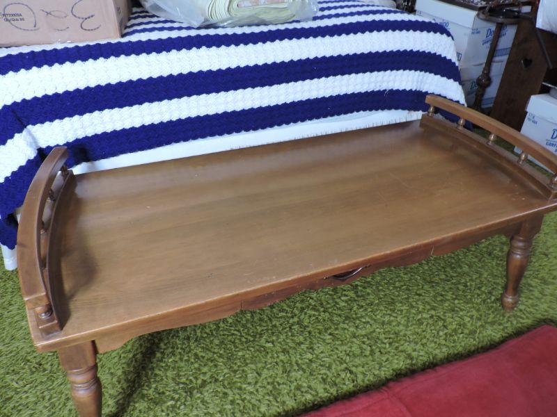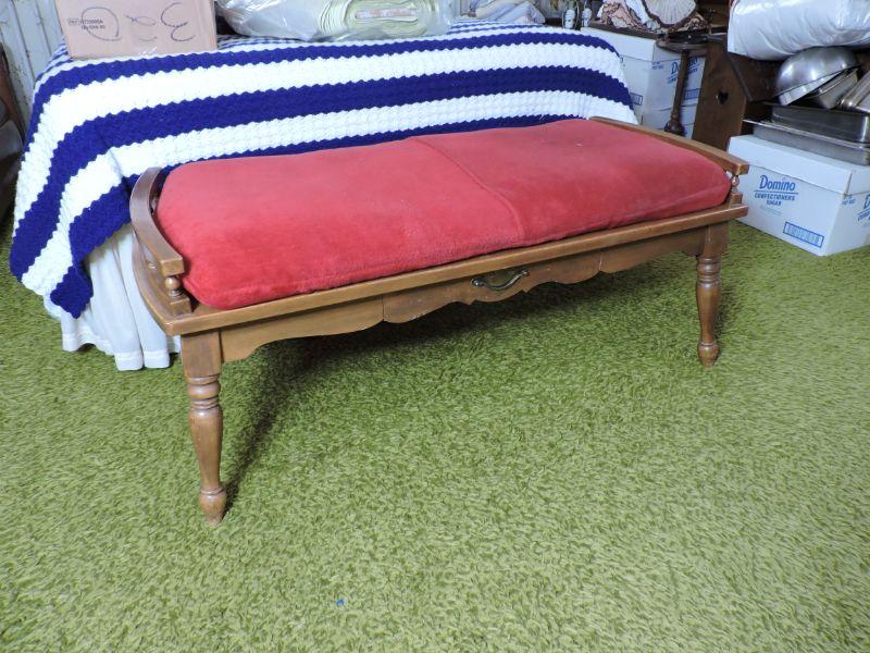 Wooden coffee table with one drawer. With a cushion, it is being used as end of bed bench. Some scratches. Please review all photos and read Terms and Conditions before placing a bid. Pick up is Wednesday, November 20 from 4-7pm and Saturday, November 23 from 9am-2pm in Mantua, New Jersey. All sales are final. All sales are as is, where is. Please bring all boxes, tools, and muscle needed to remove your items. Any photo props are not included. All measurements are approximate. Items come from dog-friendly home.