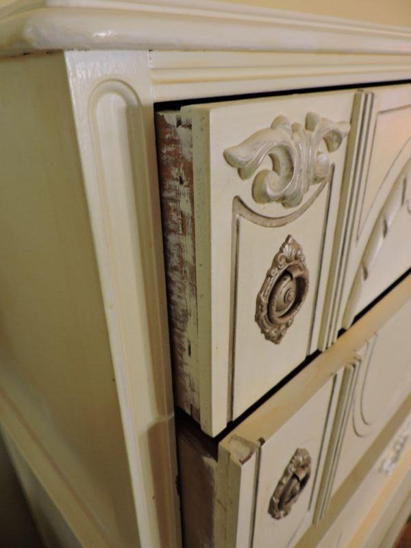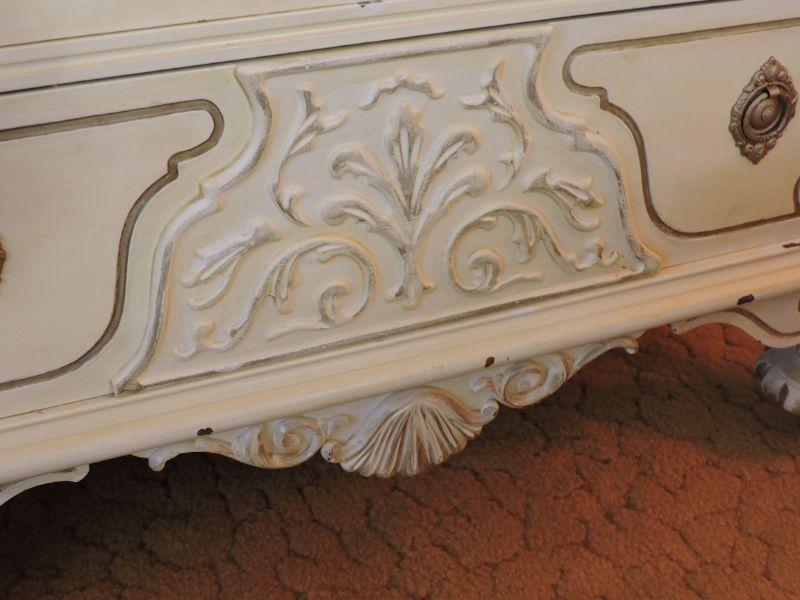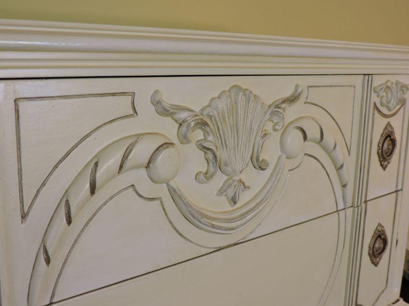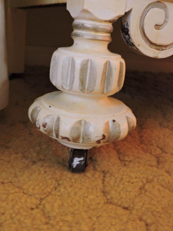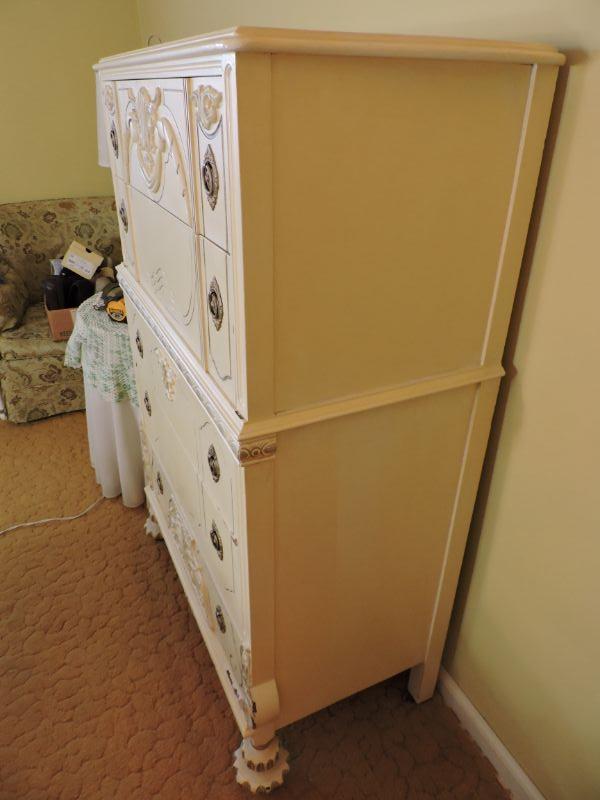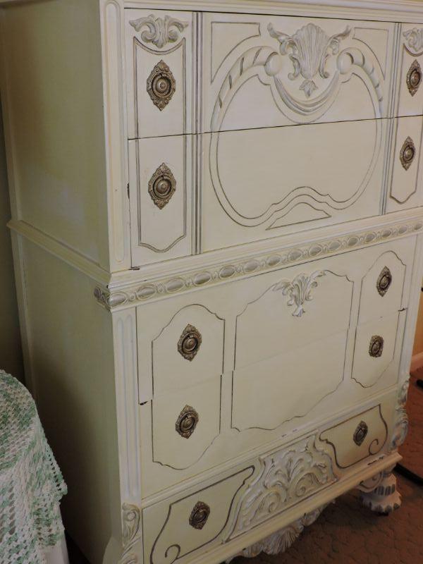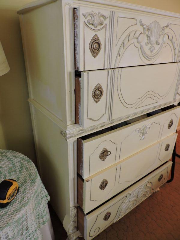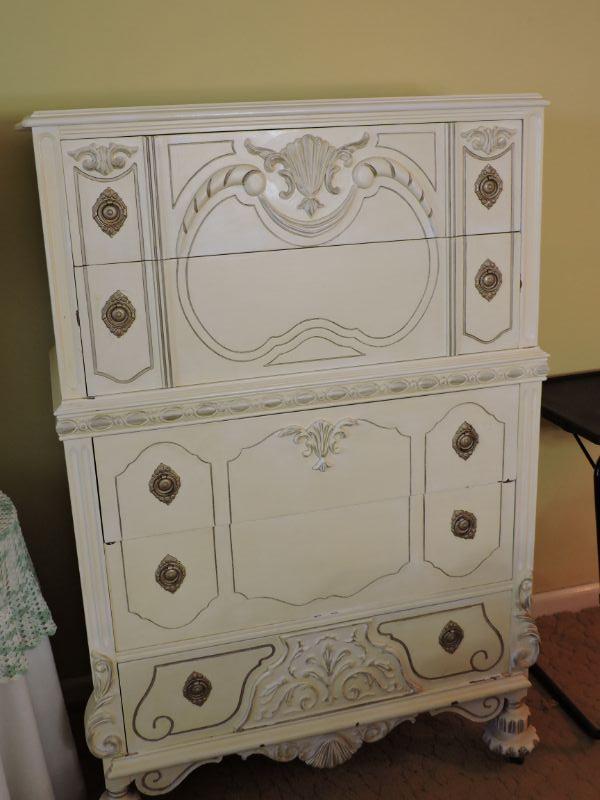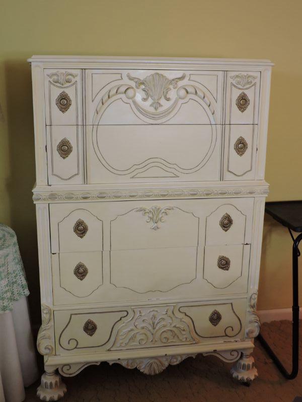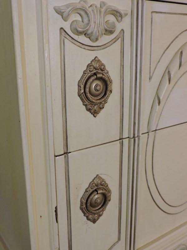 Wooden bureau with beautiful carvings. Some chipping to paint. Please review all photos and read Terms and Conditions before placing a bid. Pick up is Wednesday, November 20 from 4-7pm and Saturday, November 23 from 9am-2pm in Mantua, New Jersey. All sales are final. All sales are as is, where is. Please bring all boxes, tools, and muscle needed to remove your items. Any photo props are not included. All measurements are approximate. Items come from dog-friendly home.